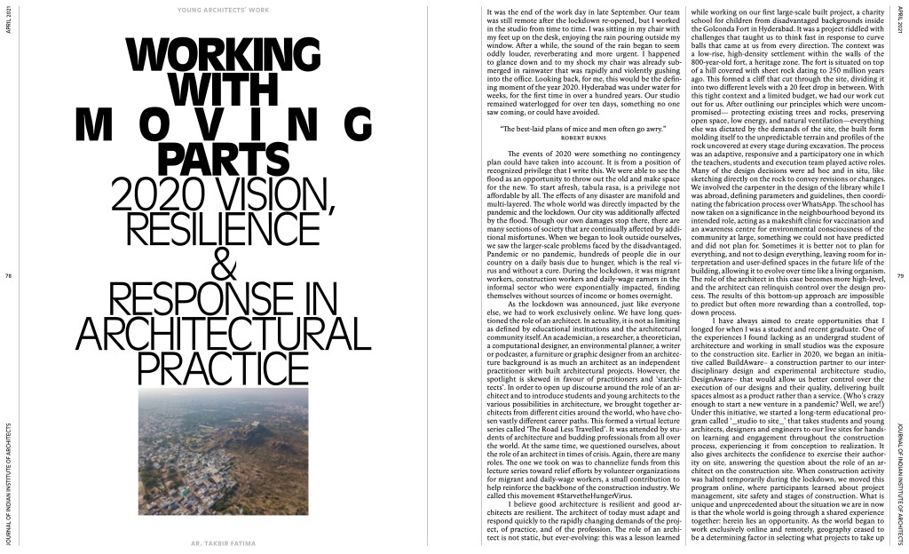 “Working with Moving Parts” // Journal of the Indian Institute of Architects // April 2021 Posted on May 30, 2021July 29, 2021 by new nomad in media, writings “Working with Moving Parts: Vision 2020, Resilience and Response in Architectural Practice” written by Takbir Fatima for the Journal of the Indian Institute of Architects issue on “Resilience” as a part of their series, “Focus on Young Practices.” share this:Share Click to share on Tumblr (Opens in new window) Tumblr Click to print (Opens in new window) Print Related