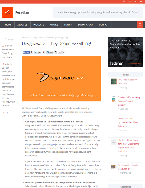1. Could you please tell us what DesignAware is all about? DesignAware is foremost an architecture and design firm, which provides design consultancy services for architecture, landscape, urban design, interior design, furniture, product, and accessory design. Our team is comprised mostly of architects and designers. Not all of us are in the same physical location, … Continue reading Interview in EdTech Revolution, Foradian.com // October 2014