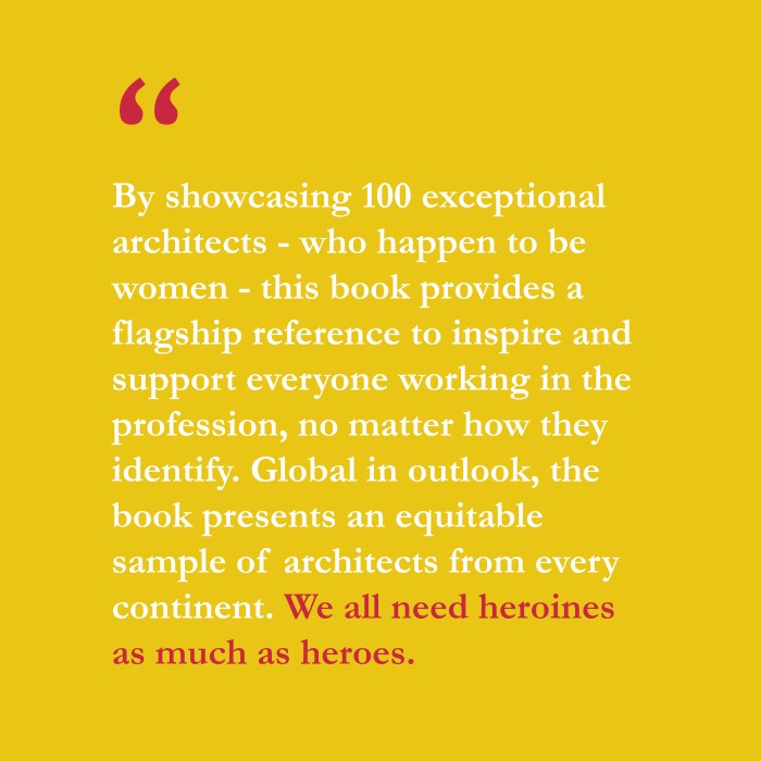 All the architects in this book deserve international recognition. The reality is, though, that few are household names. Over the last decade, awareness of the need for gender balance in architecture has gained traction. Within the profession, women remain underrepresented, underpromoted and underpaid. Failure to acknowledge women’s contribution to the built environment has perpetuated this cycle and impoverished us all.