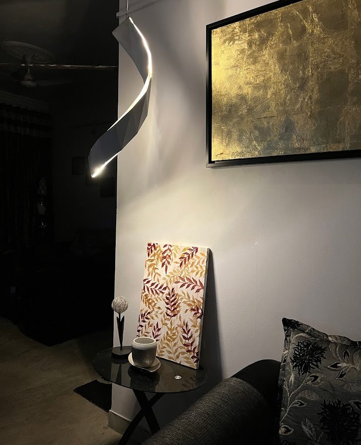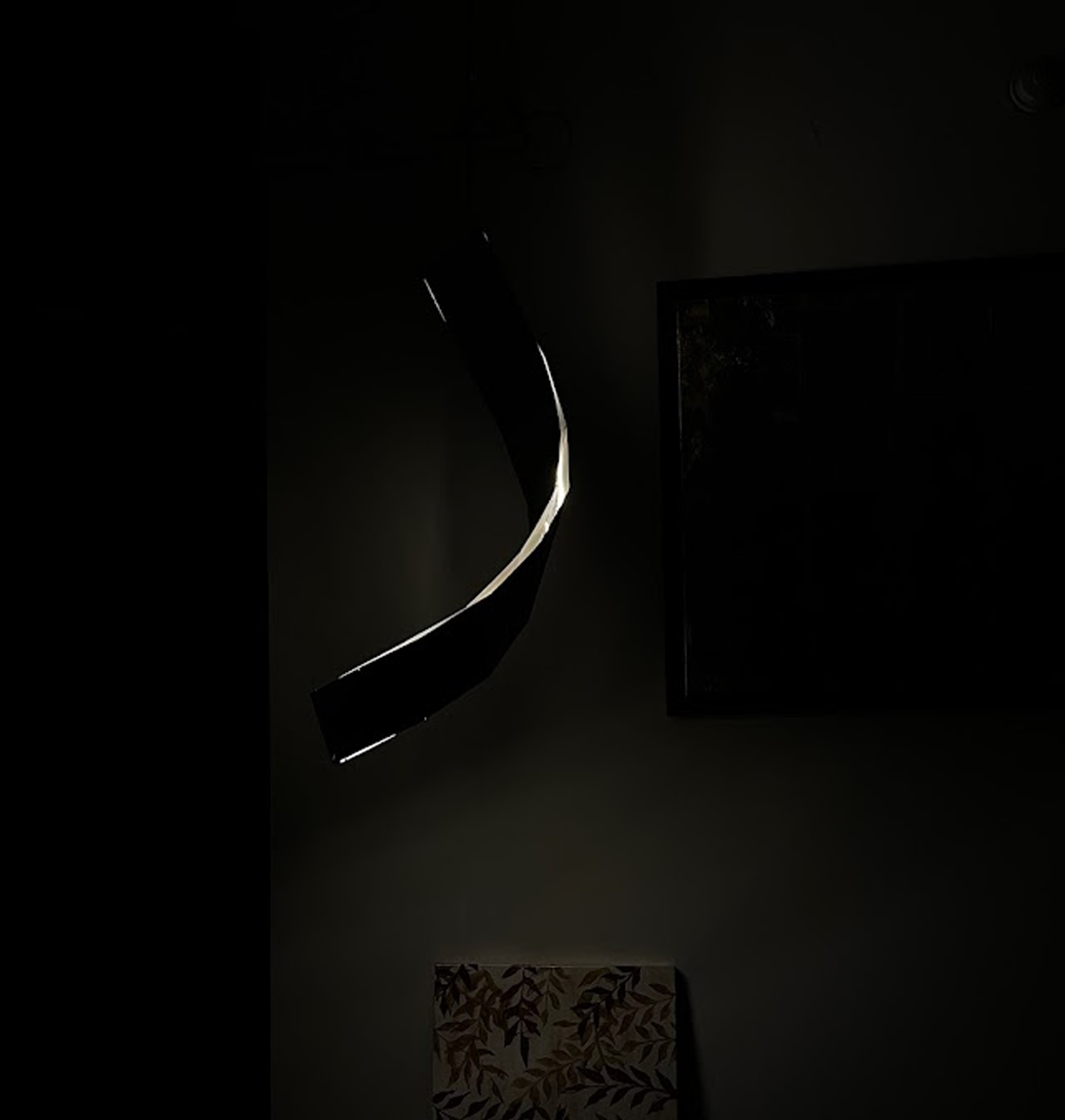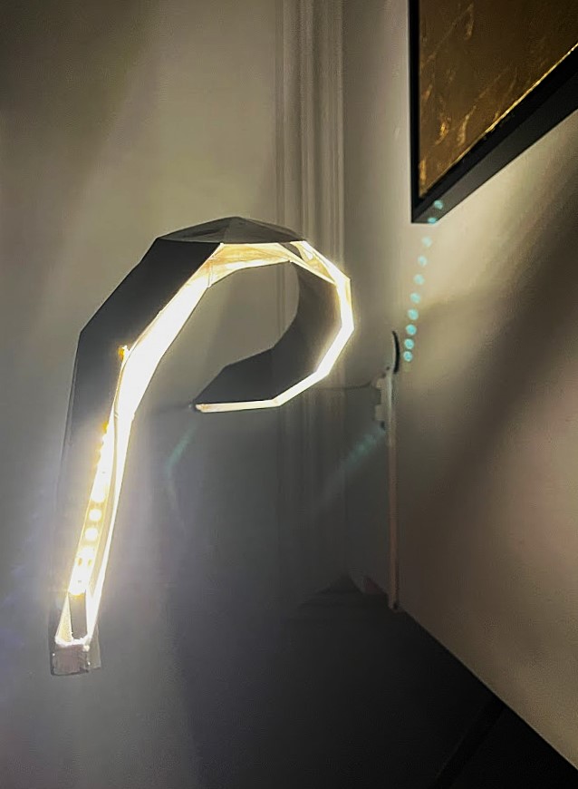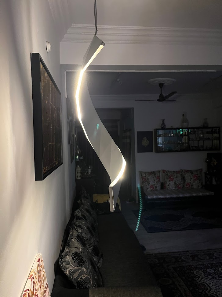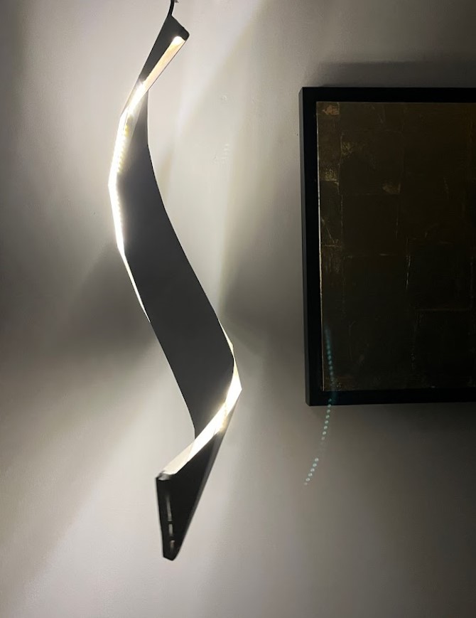ChronoWave doubles as a kinetic clock: its spiral form slowly rotates to mark the passage of time. Instead of hands on a dial, the form of the lamp itself becomes the timekeeper. The mechanical system is driven by a silent stepper motor connected to the cable and concealed in the ceiling, calibrated to rotate the spiral at a precise rate (one revolution per 12 hours). A timekeeping controller governs the motor, ensuring accuracy like clockwork movement. The spiral’s slow, seamless motion transforms the lamp into both light source and timepiece. So instead of looking at a number or a hand, you “read” time in the many orientations of the spiral: the sculpture itself is the chronometer. Unlike conventional clocks that measure time in discrete ticks, Chronowave visualizes time as continuous flow. The turning spiral is a metaphor for waves and cycles — of light, of motion, of life rhythms.