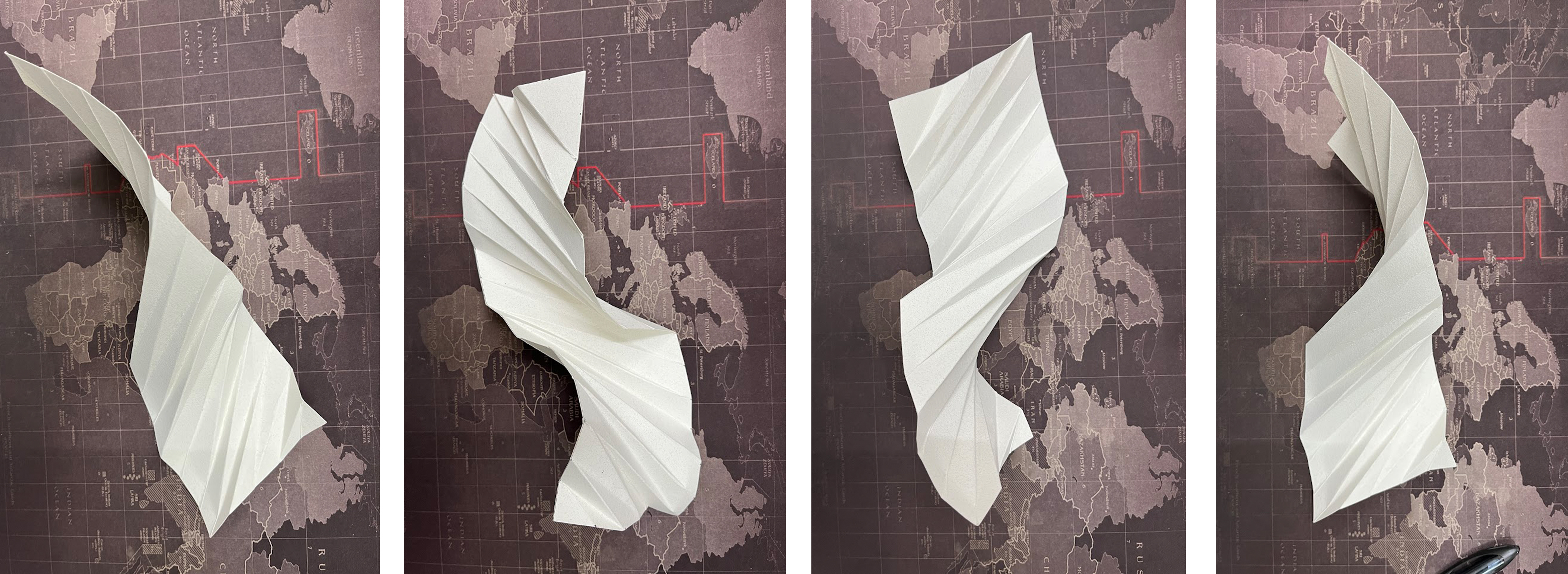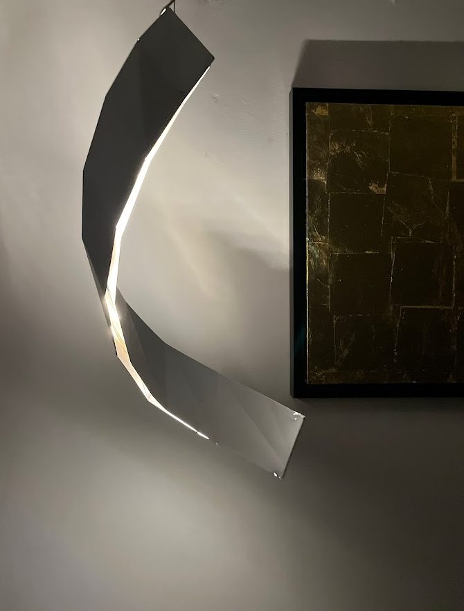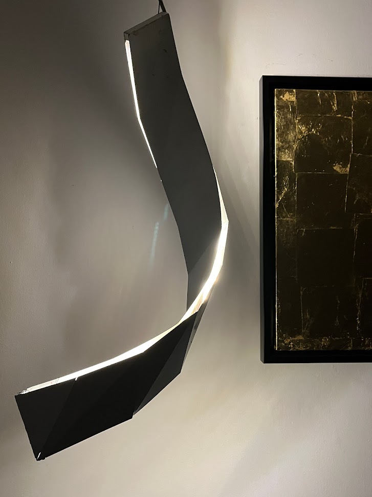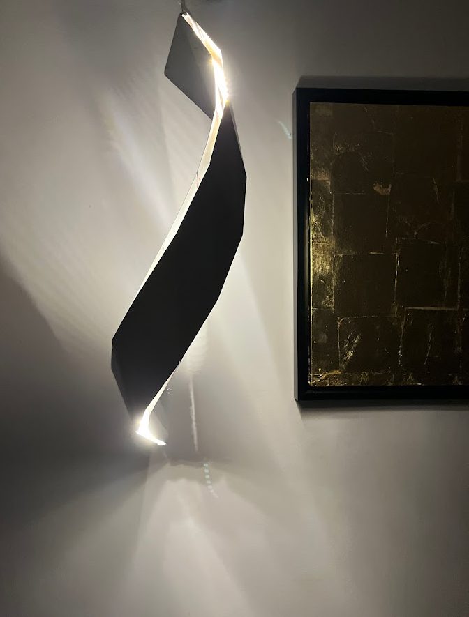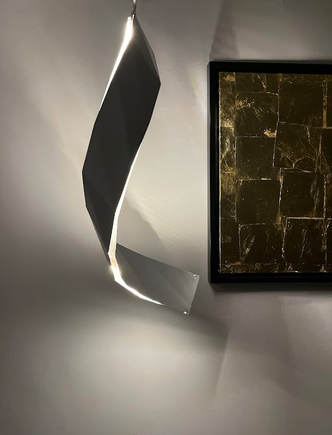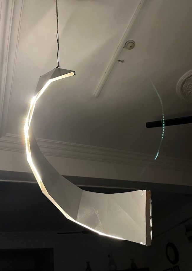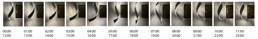 ChronoWave is an exploration of depicting time through alternative, fluid, synchronous movement. Learning from origami folding of paper, and tessellation patterns, and exploring folding as a means of fabrication, ChronoWave captures time as light in motion. A folded ribbon of metal spirals with the rhythm of a clock, its glow tracing waves of illumination across space. Inspired by chronophotography, the capture of motion as an overlapping composition of still images, ChronoWave depicts time, not in increments, but in geometry, in states of being, in ever-changing form. It portrays spatial moments flowing into each other. ChronoWave is at once an artistic gesture, a light sculpture, and a timepiece.