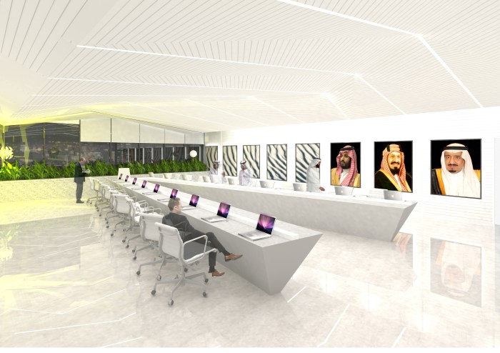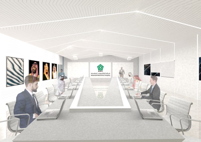 A bespoke board room for an advanced electronics company operating in the rapidly expanding metropolitan city of Riyadh. The company specializes in the hi-tech space of defense, information and communications technology, energy and manufacturing, and required a boardroom that reflects its dedication to innovation and reinvention. As the company operates in the aerospace sector and their HQ is located at King Khalid International Airport, luxury airplane interiors provide a natural starting point after which to model the conference room. A complex geometric ceiling broken by parallel lines that repeat through the space forms a sleek minimalistic focal point. Shades of white lend a contemporary and understated touch. The boardroom exudes signature luxury and restrained good taste: a reinvention of the vision of the company built upon its strong foundation of traditional values.