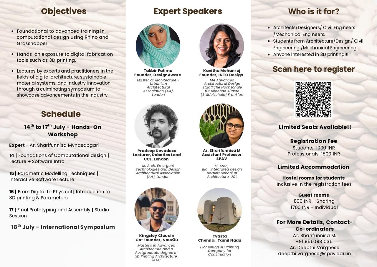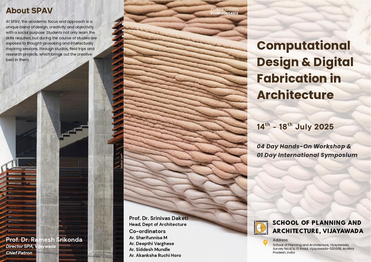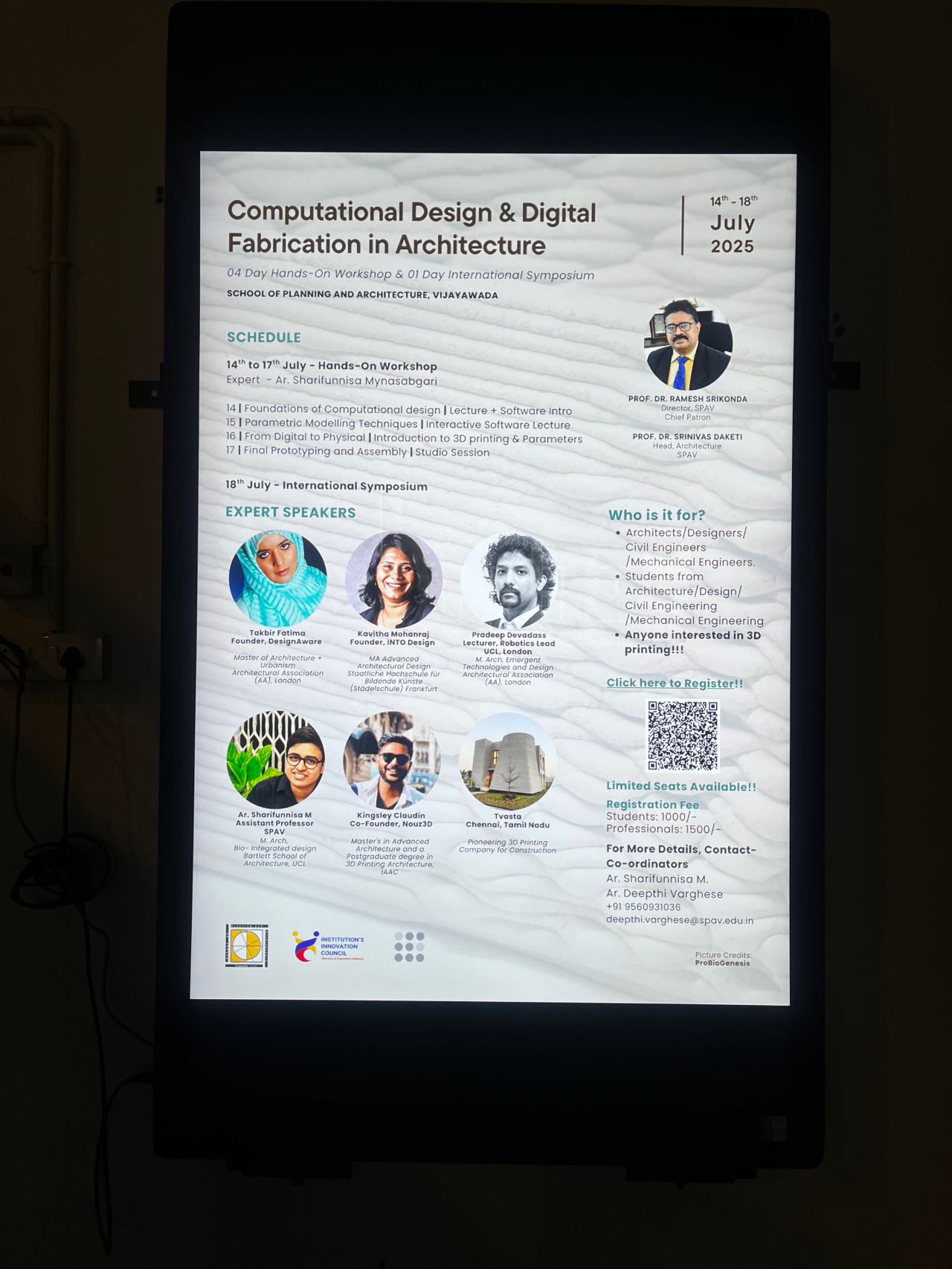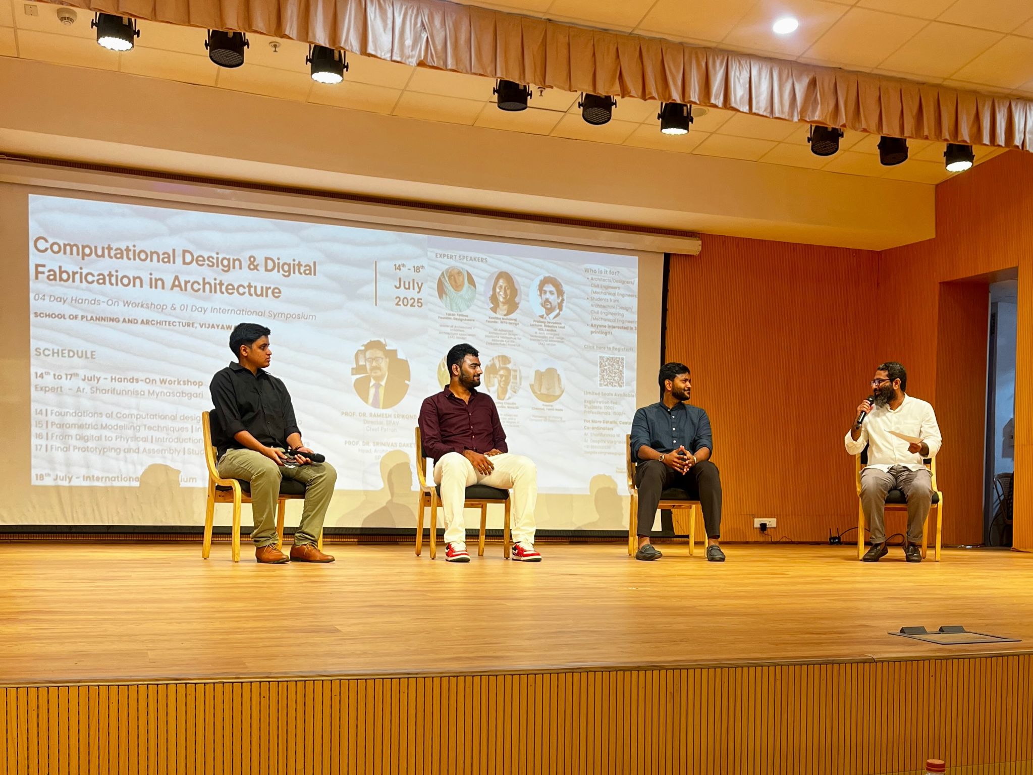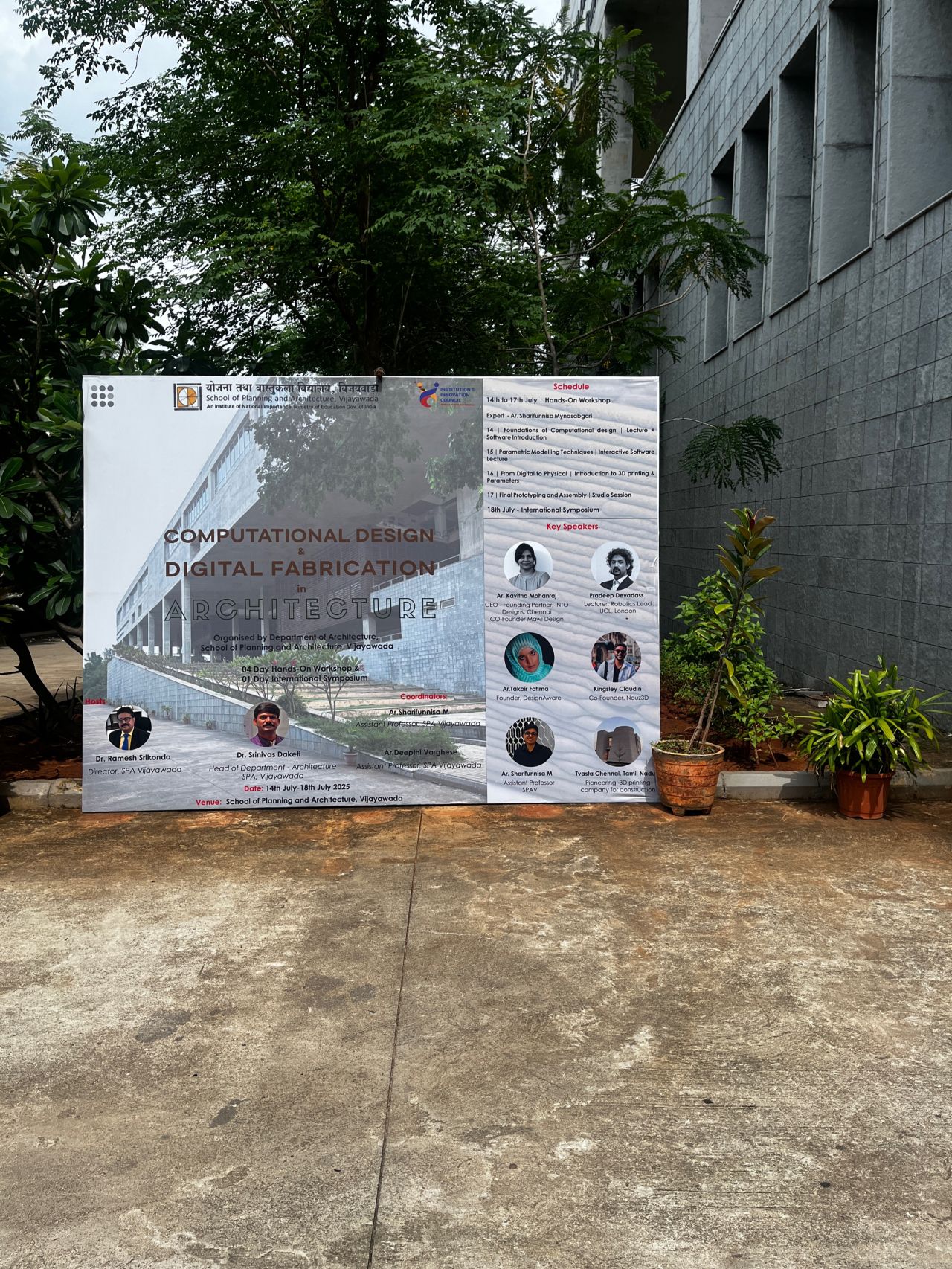 “Technology, Design, Awareness” // Computational Design and Digital Fabrication in Architecture Type: 2025, awareness, presentations + talks WHAT: Keynote Lecture and PAnel Discussion at Symposium on “Computational Design and Digital Fabrication in Architecture” WHEN: August 19, 2025 Where: School of Planning and Architecture, Vijayawada Related