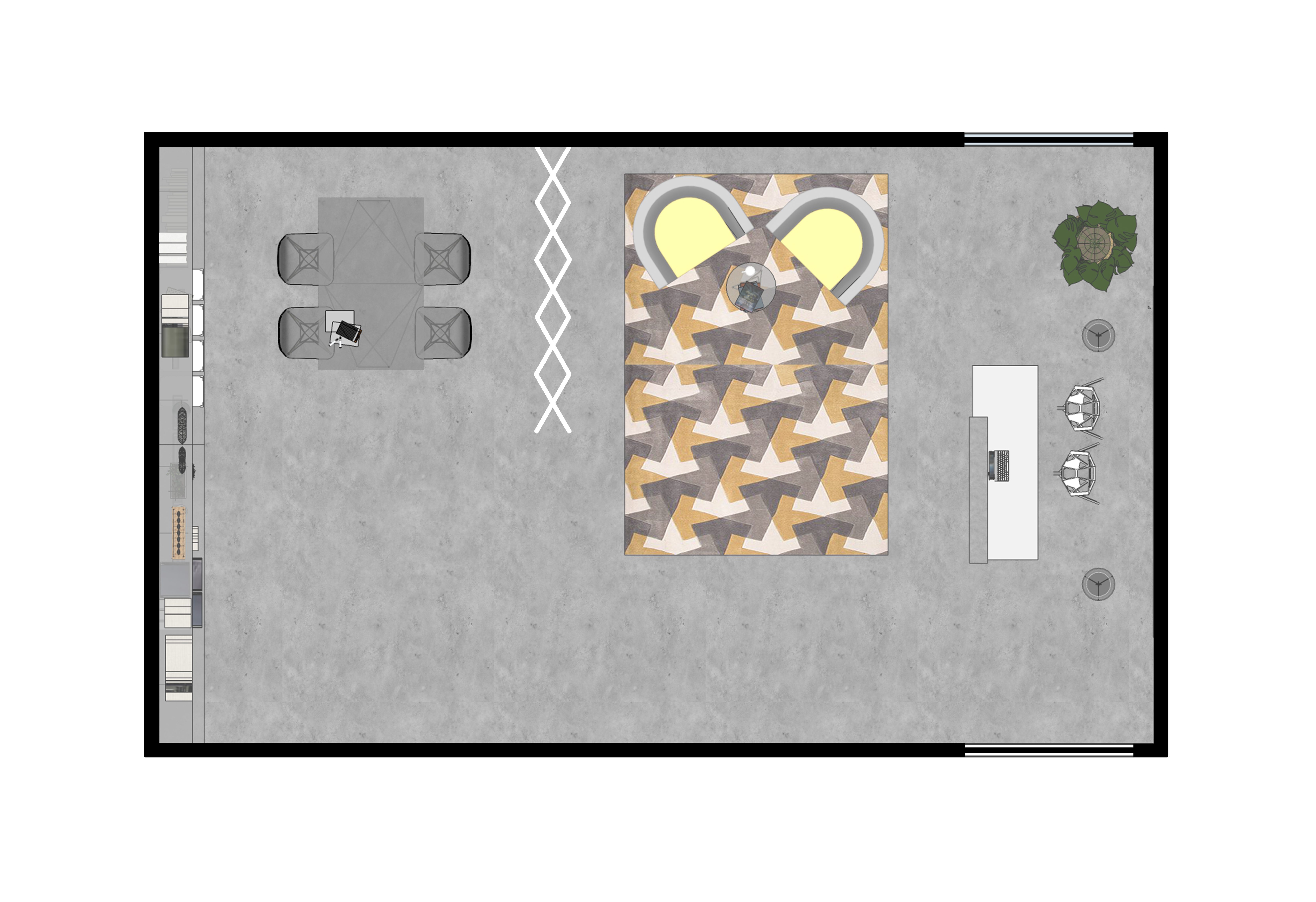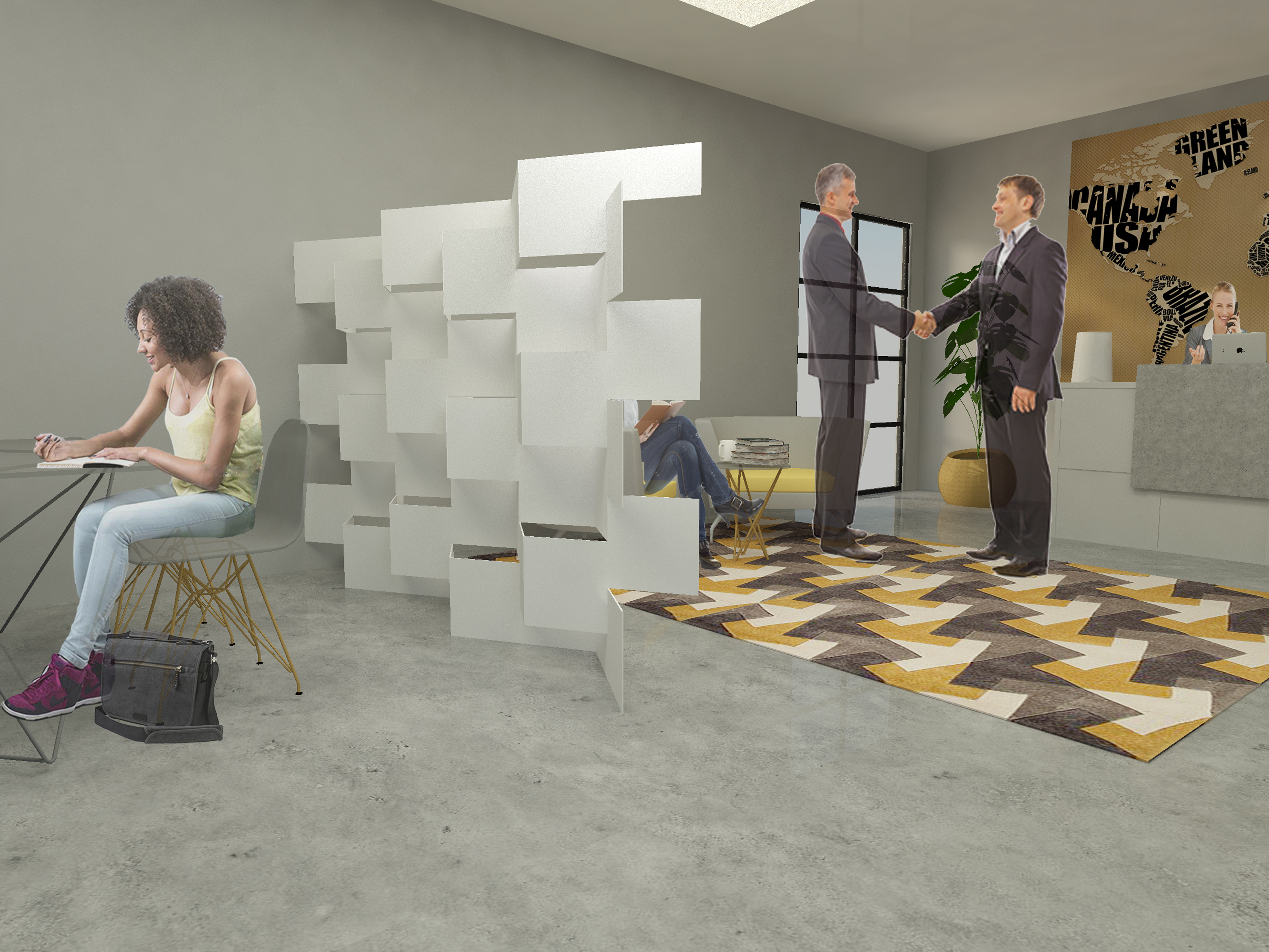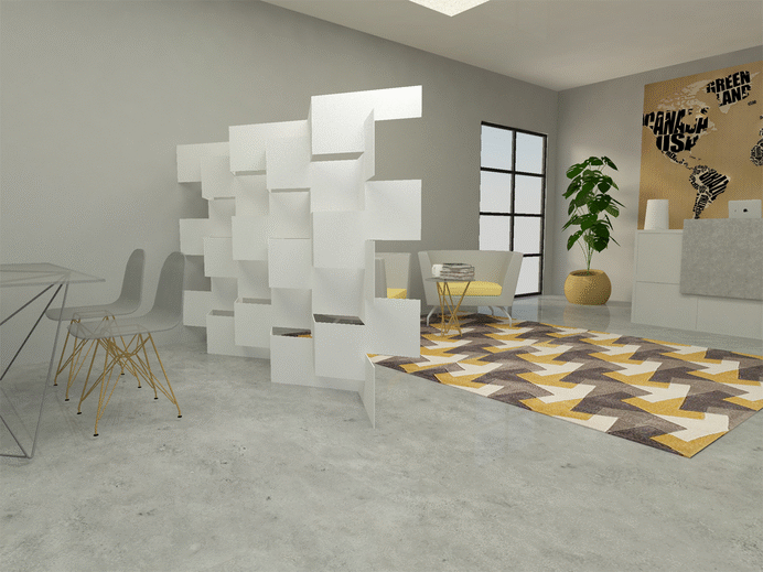 Inspired by origami and tailoring, Fold is a dynamic partition crafted from intertwined flat pieces that fold at various angles to offer visual privacy and divide a space. The partition has a repeating geometry that allows it to fold or unfold to become completely flat. In the intermediary state, all the members are orthogonal and Fold stands on its own.