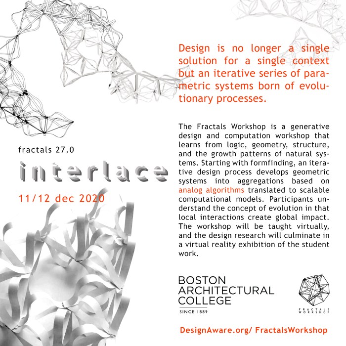 Fractals 27.0 :: inter{lace} Type: 2020, awareness, design research, Exhibitions, Fractals Workshop, Installations, process, programming matter, Teaching, virtual reality, XS WHAT: FRACTALS 27.0: inter{lace} WHEN: 11-12 december 2020 LOCATION: online via zoom in partnership with the boston architectural COLLEGE Enter the virtual reality exhibition! enter the virtual reality exhibition! Related