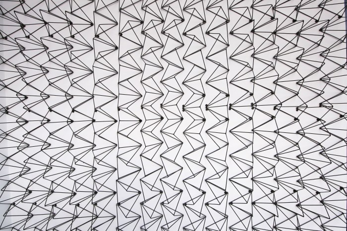 While the tables and countertops are of polished Malaysian teak wood, all the seating is in durable black wire-frame iron which can be used indoors or outdoors. The chairs and bar stools are ornamented with a sawtooth wave, a periodic non-sinusoidal waveform that consists of an infinite sequence of truncated ramp functions resembling triangular teeth of a saw. Against the 3D feature wall, the lines almost seem to intersect.