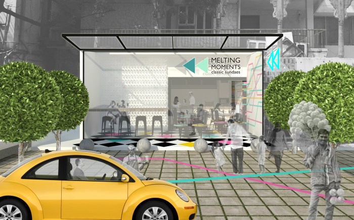 This exciting project is the revival of Hyderabad’s beloved ice-cream parlor, Melting Moments. The brief called for a 50s “chock’lit shoppe” inspired interior, which was reinterpreted by way of tweaking design elements to create a graphic language that’s bold and contemporary. The result was a pop-up ice-cream parlor inspired by 50s retro nostalgia and utopian inclinations. The constrained area and busy, kitschy, surrounding context lend perspective and contrast to the space, and the entire building facade and frontage become a part of the finished space, with repetitive motifs binding the entire design.