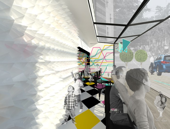 Geometry plays an important role in the design, from the checkerboard flooring borrowed from the retro diners, to the triangular logo design that is clearly a rewind sign, beckoning visitors to “Rewind. Unwind. Relive the Melting Moments.” Not only is this a recall of their own happy memories, but also a callback to the old ice-cream parlor that was once a happening place in the city. The triangular motif develops into a series of backlit punctures in the front counter, to the feature wall where it manifests itself into a three-dimensional skewed grid in metal rods. The feature wall was designed in many iterations of folding surfaces, until a pyramidal design was arrived at.