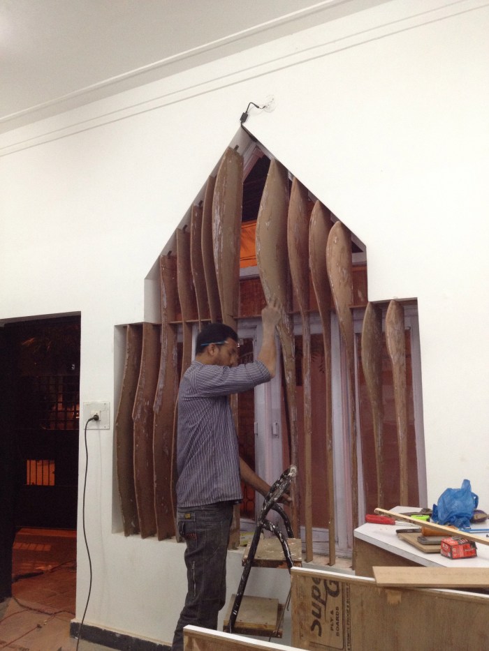 This window installation for DesignAware studio was digitally visualized as a single topological surface. The surface was split into parts and the pattern of pieces was transferred onto MDF sheets, which were then cut and installed. When seen from the front, the window looks louvered, but when seen from an angle, the undulating surface becomes prominent.