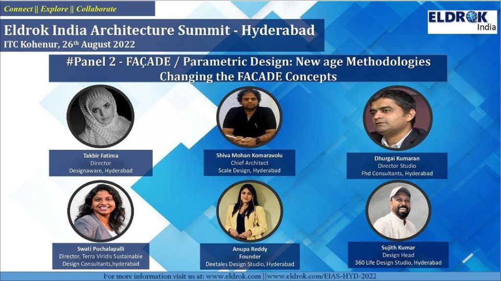 Panel Discussion // Eldrok India Architecture Summit 2022 Type: 2022, awareness, presentations + talks WHAT: Panel Discussion on “Facades and parametric design: New age methodologies changing facade concepts” WHEN: August 26, 2022 hosted by: Eldrok India WHERE: ITC Kohenur, Hyderabad Related