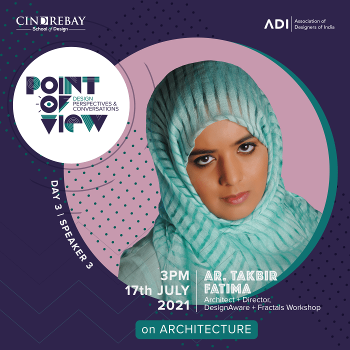 Point of View Type: 2021, awareness, presentations + talks WHAT: POINT OF VIEW (ARCHITECTURE SERIES) WHO: TAKBIR FATIMA, director, designaware HOST: ADITI DHAR WHEN: juLY 17, 2021 ORGANIZED by: CINDREBAY COLLEGE OF DESIGN, KOCHI, INDIA WHERE: online Related