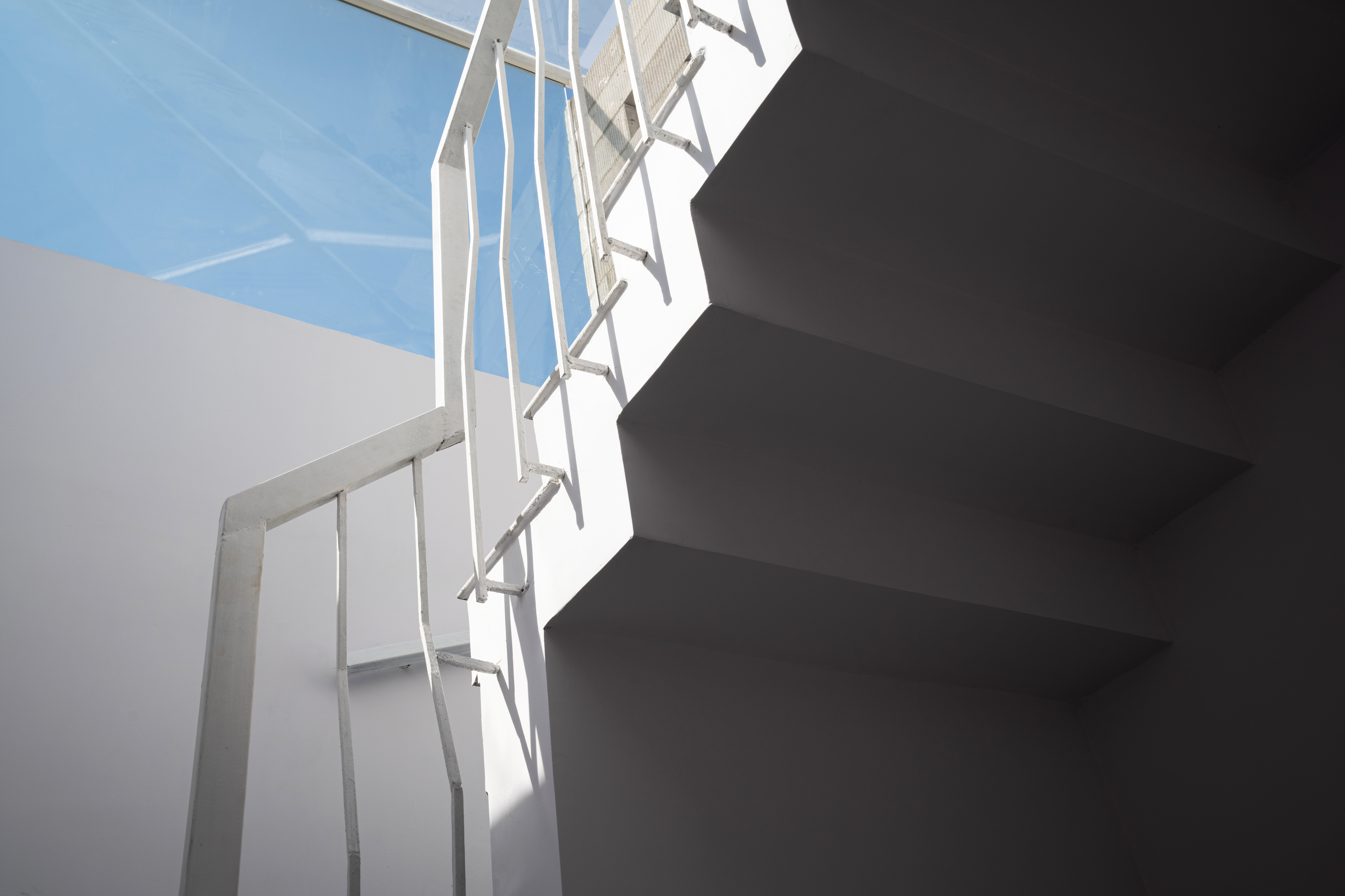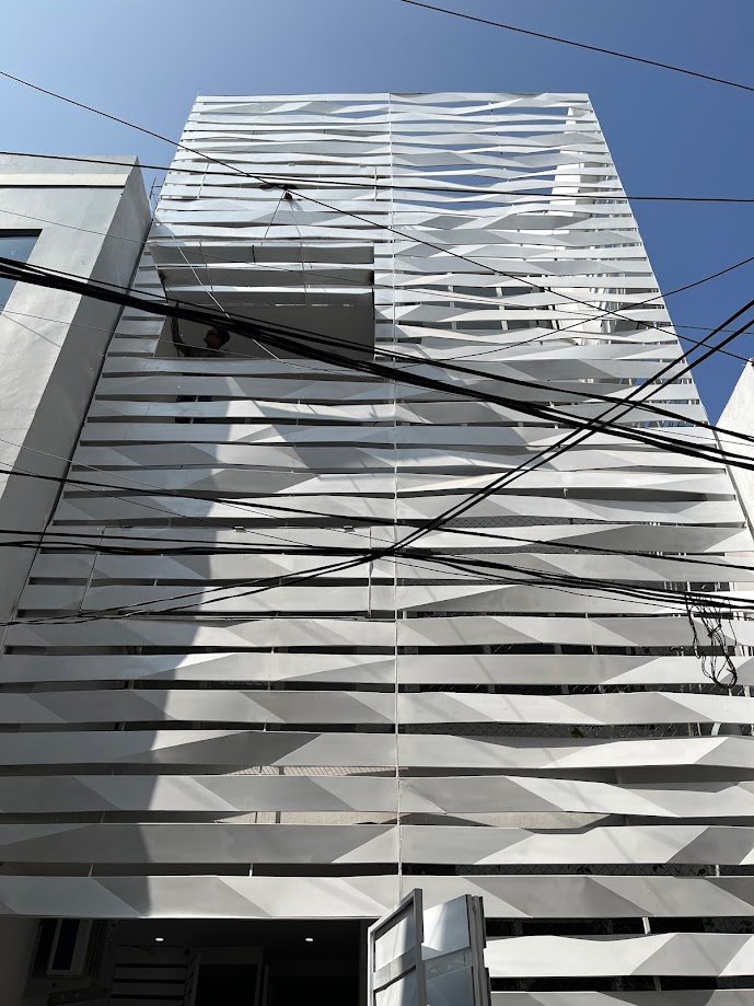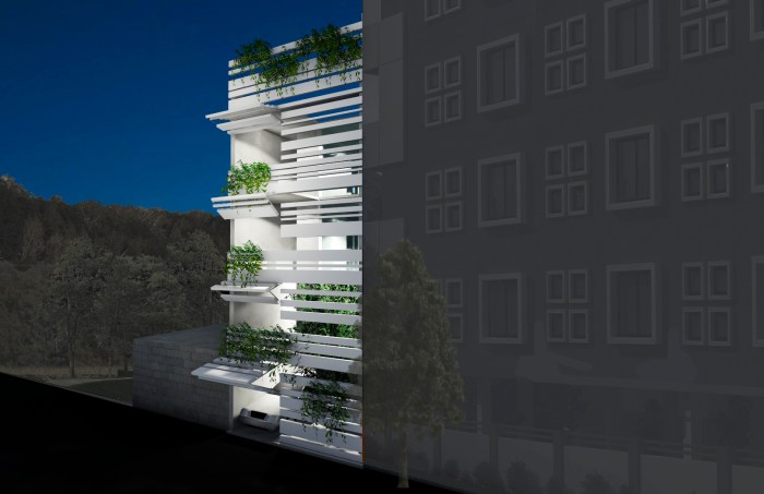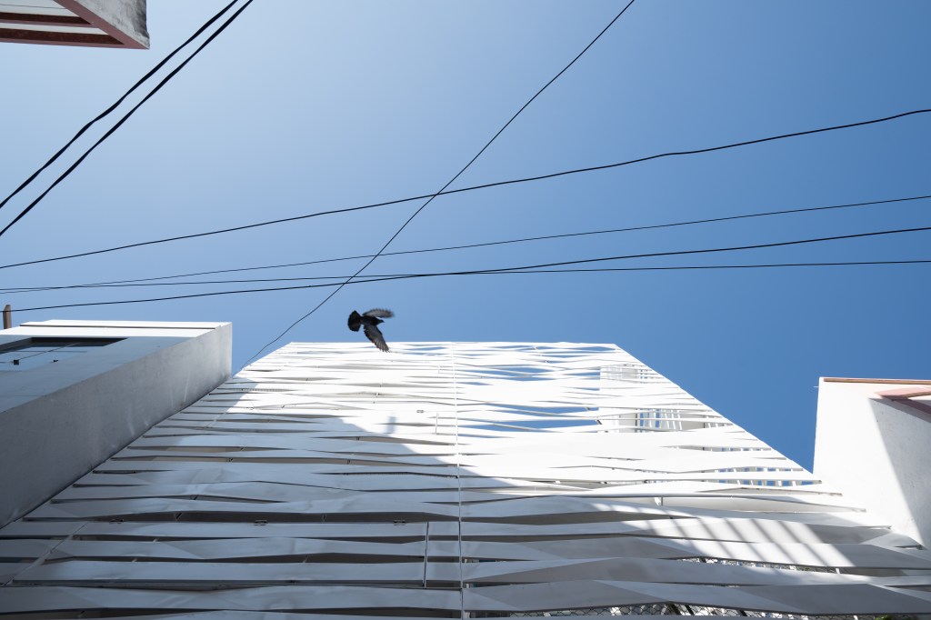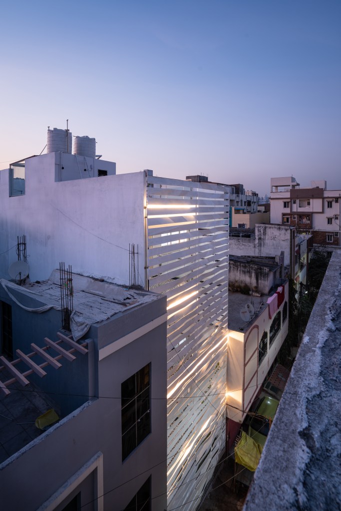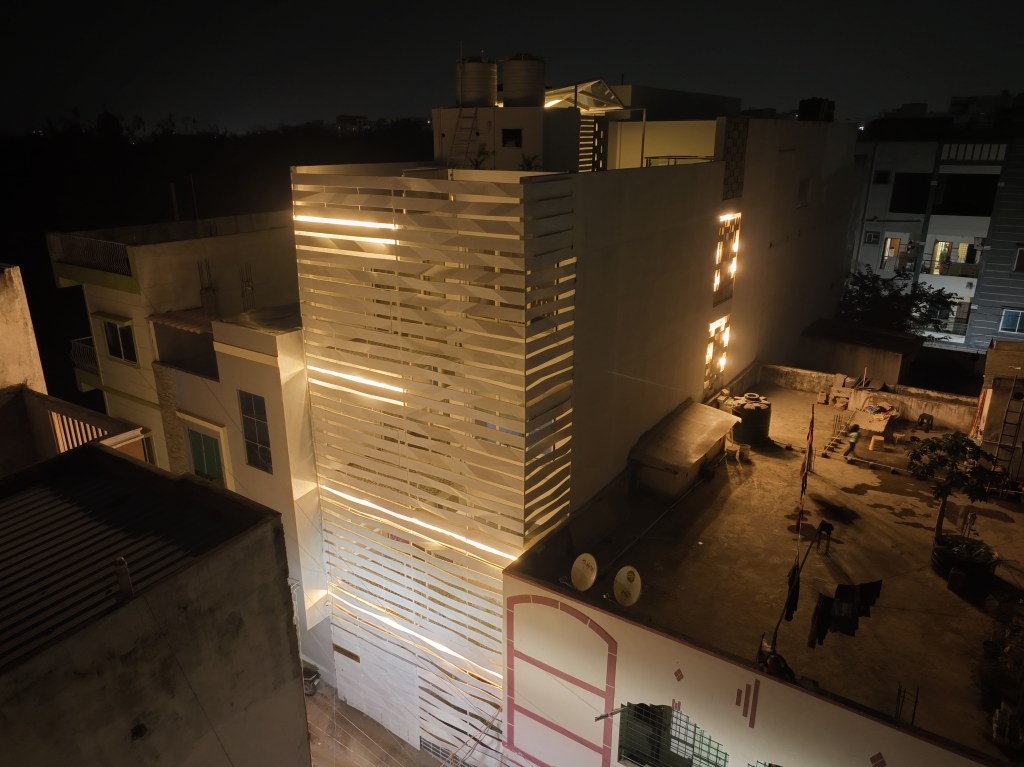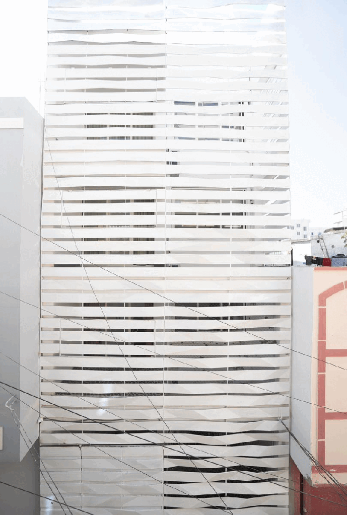 As per the byelaws, peripheral setbacks are not required for plots of 100 sq yards and under. Instead of a front setback, a small internal garden was created, enveloped by the building façade. The folded lattice skin over the front façade allows for ventilation and access to the greenery in the front yard via the internal balconies and large bedroom windows, while providing privacy from the lane. White ribbons of folded steel make the origami-inspired façade and wrap around the side of the house, casting fractured shadows and letting in strips of light that snake over the walls and floor, shifting with the seasons and time of day. This ribbon façade has been designed through various iterations of paper folding and cutting, creating an interrupted and intersecting folded/broken surface. The screen allows residents to view the lane while restricting visual access to the interior. On the upper levels, balconies from the front bedrooms overlook the internal front garden and the lane. Hydraulic-operated shutters on each level give residents the option to open up the balconies to the lane or keep them closed, creating a dynamic façade. The house is slightly set back from its neighbors, keeping within the legal boundaries of its site: while neighboring houses project overhangs onto the lane, Ribbon House has access to private gardens within its footprint, and the greenery is visible from every space in the house.