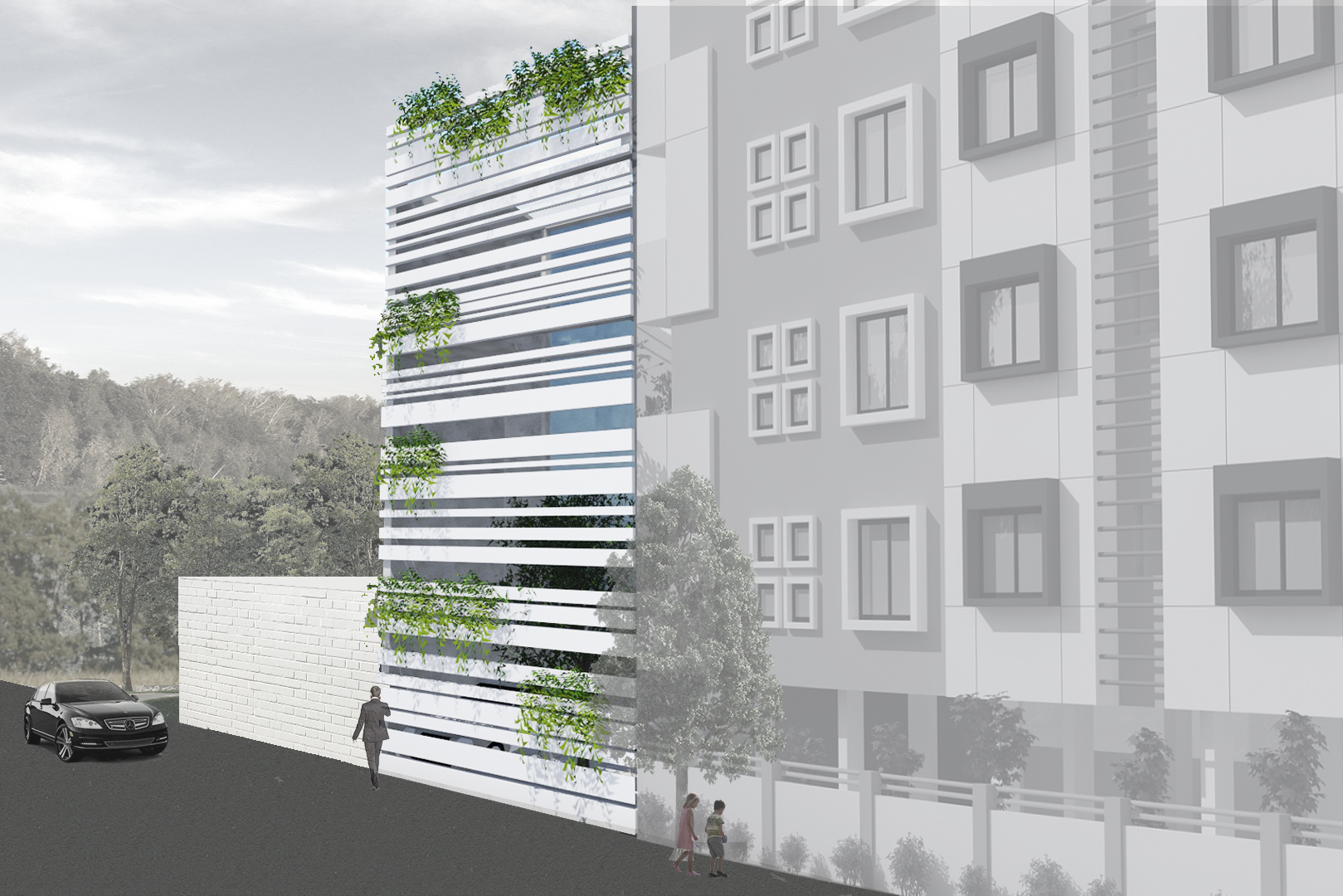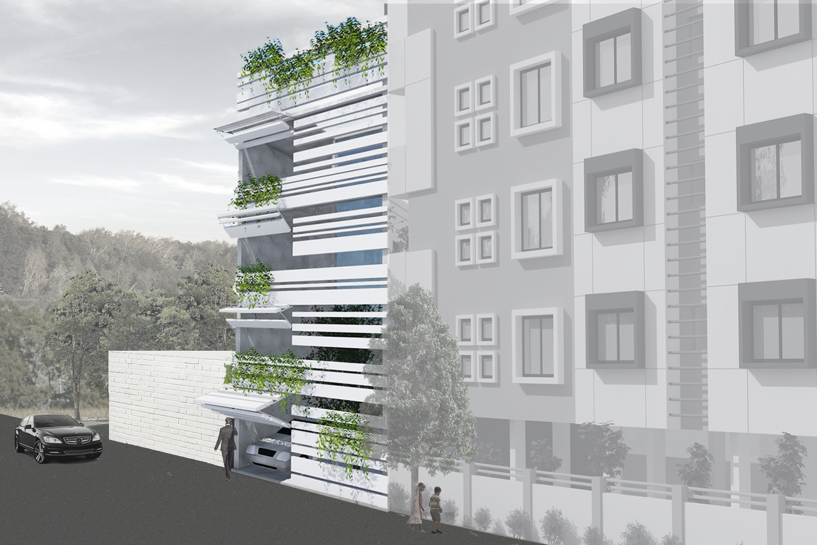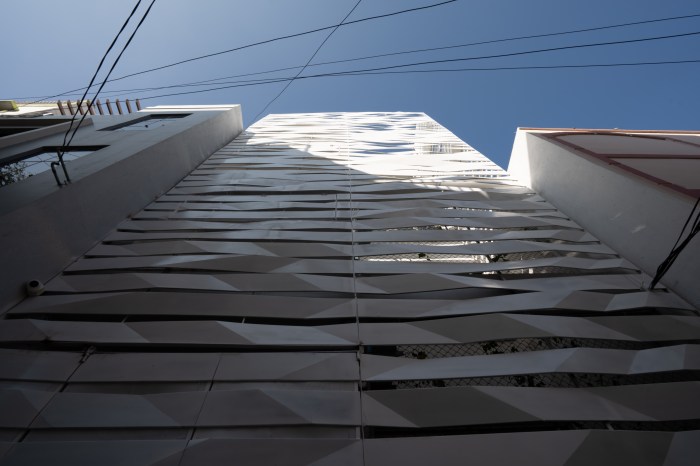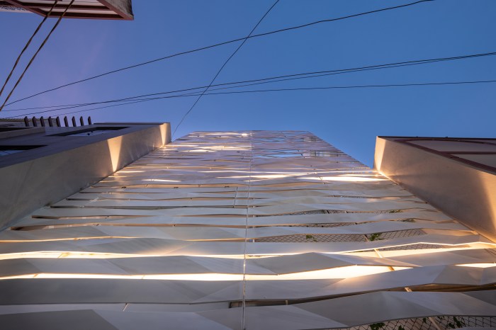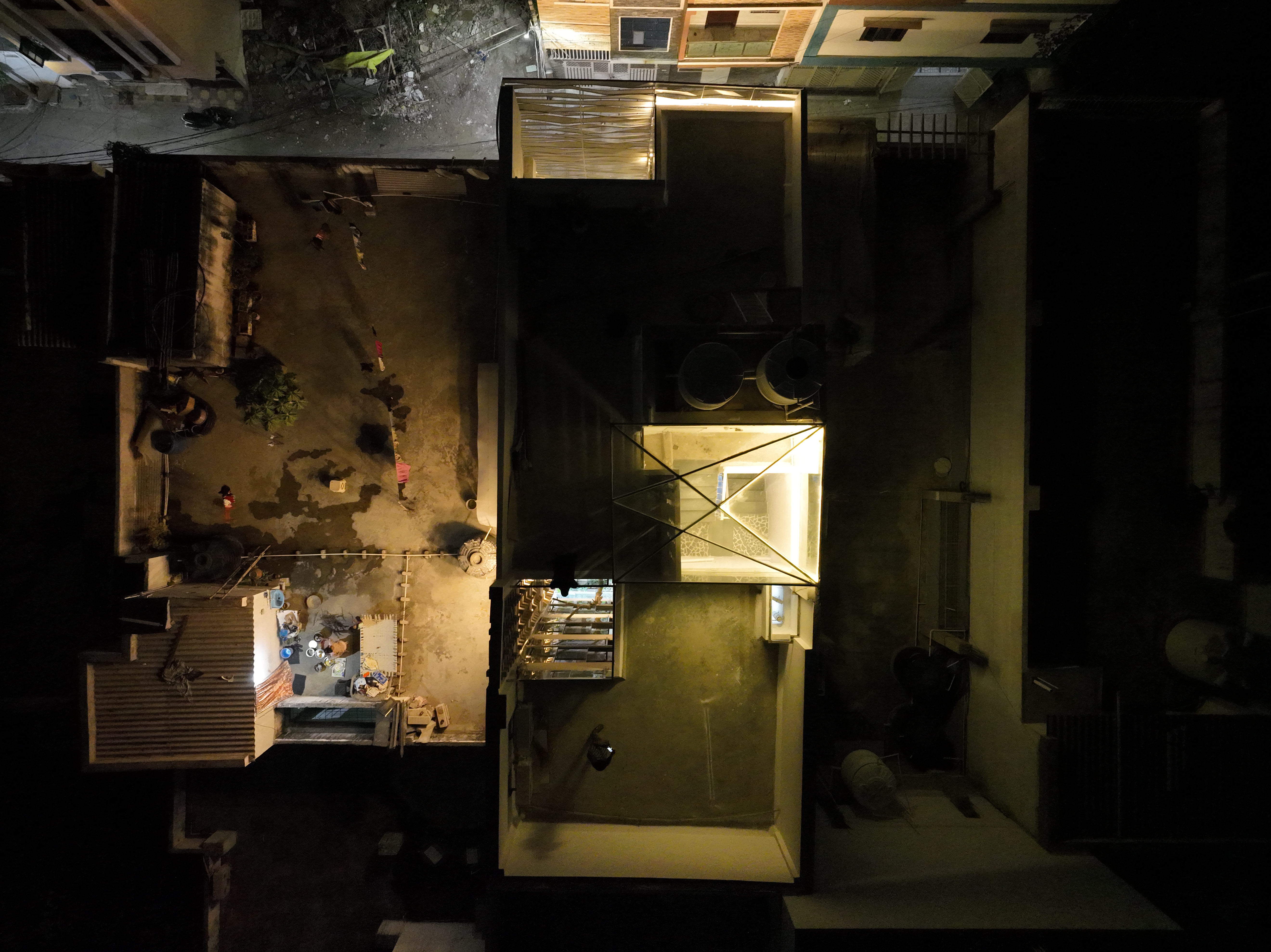 As per the byelaws, peripheral setbacks are not required for plots of 100 sq yards and under. Instead of a front setback, a small internal garden was created, enveloped by the building façade. The folded lattice skin over the front façade allows for ventilation and access to the greenery in the front yard via the internal balconies and large bedroom windows, while providing privacy from the lane. White ribbons of folded steel make the origami-inspired façade and wrap around the side of the house, casting fractured shadows and letting in strips of light that snake over the walls and floor, shifting with the seasons and time of day. This ribbon façade has been designed through various iterations of paper folding and cutting, creating an interrupted and intersecting folded/broken surface. The screen allows residents to view the lane while restricting visual access to the interior. On the upper levels, balconies from the front bedrooms overlook the internal front garden and the lane. Hydraulic-operated shutters on each level give residents the option to open up the balconies to the lane or keep them closed, creating a dynamic façade. The house is slightly set back from its neighbors, keeping within the legal boundaries of its site: while neighboring houses project overhangs onto the lane, Ribbon House has access to private gardens within its footprint, and the greenery is visible from every space in the house.