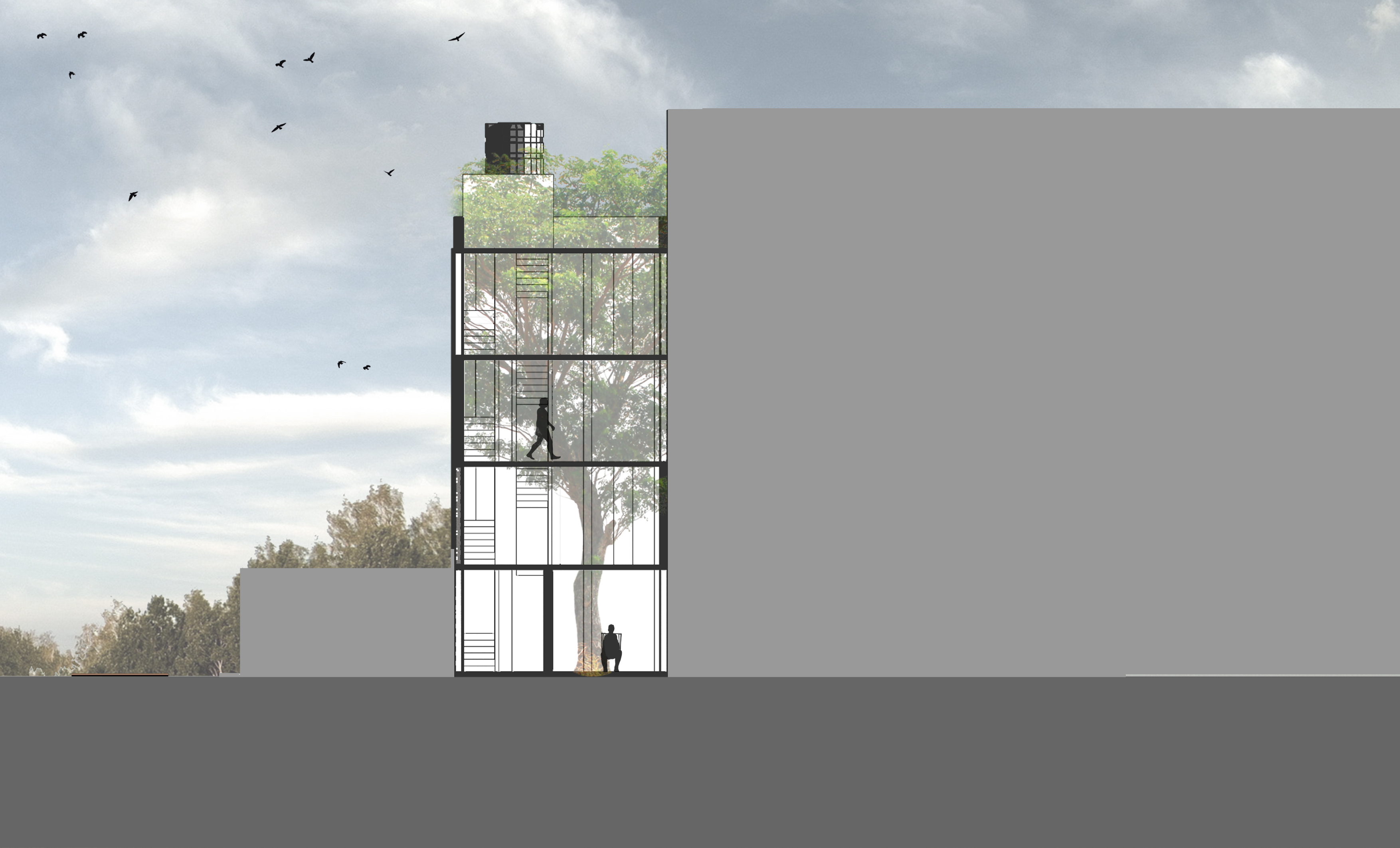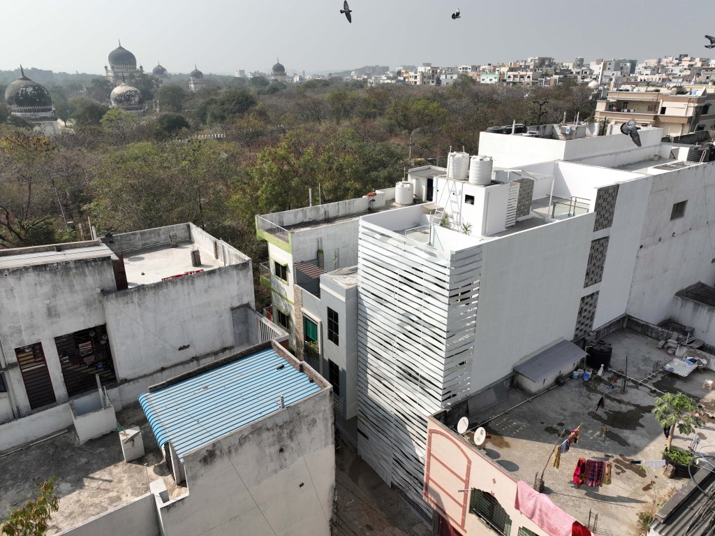 The site is a tiny plot of 100 sq yards located in a tight residential context close to the 16th-century royal mausoleum complex, the Qutb Shahi Tombs, in Hyderabad, India. The plot is at the top of a steeply-sloping lane, surrounded by neighboring houses with shared walls on three sides with a narrow lane in the front. This posed a challenge to the spatial layout, natural ventilation, and privacy of the house. The beauty of the site was an existing pair of neem trees towards the center, and views of the Tombs from a height. The brief called for two adjoining units of four levels for a brother and sister. Since the brother lives in Norway for most of the year, he expressed a desire for a Scandinavian style row house with plenty of sunlight and greenery.