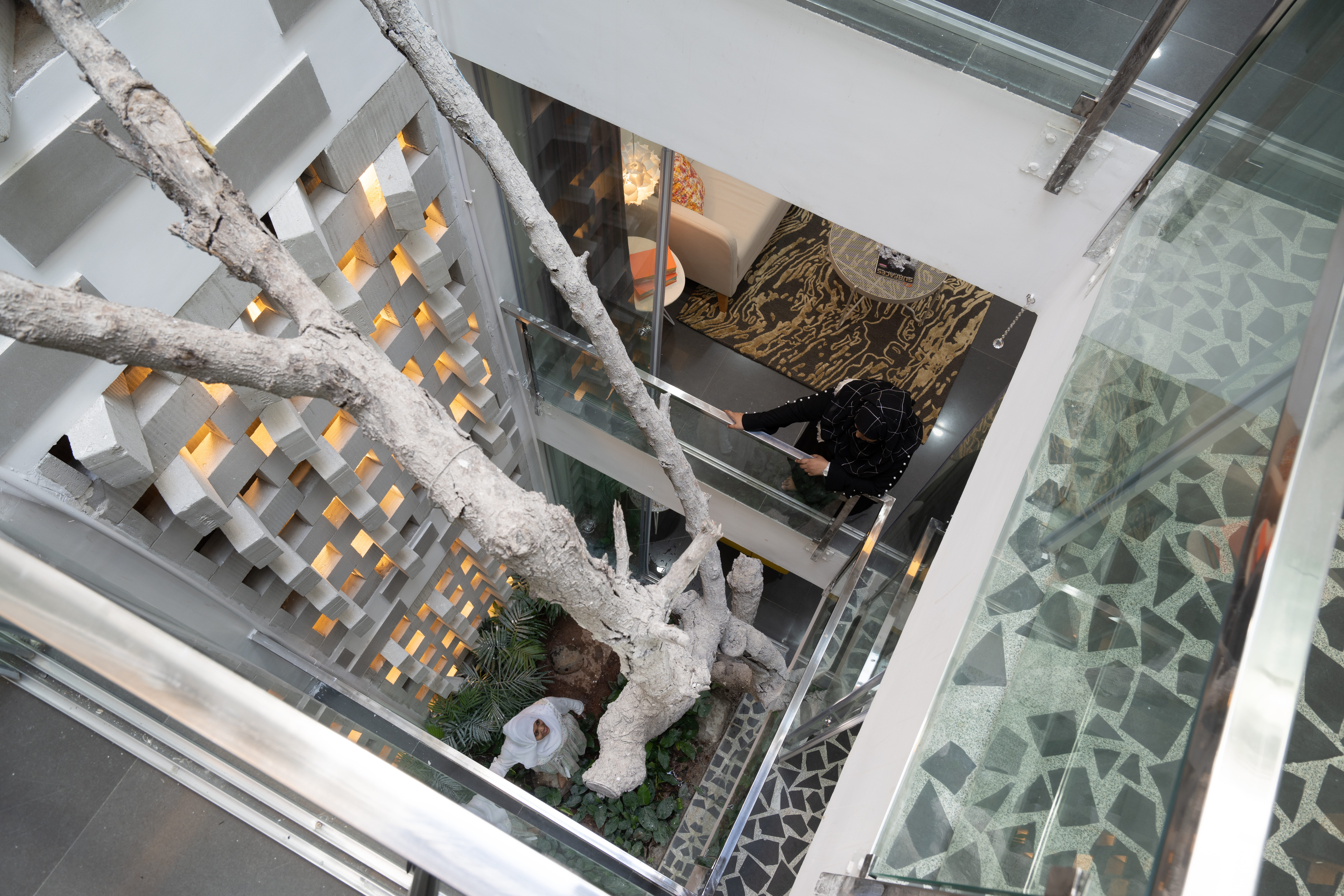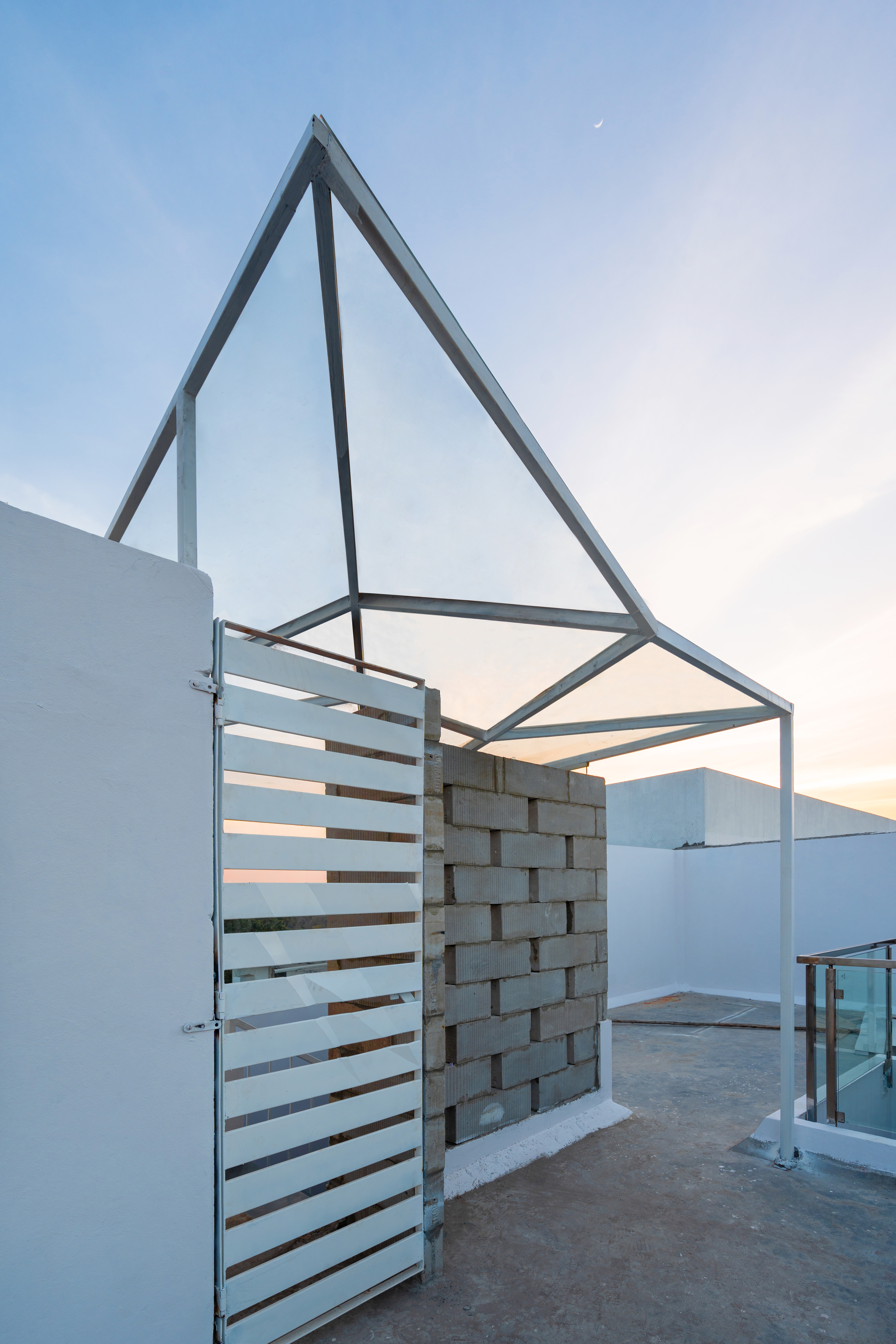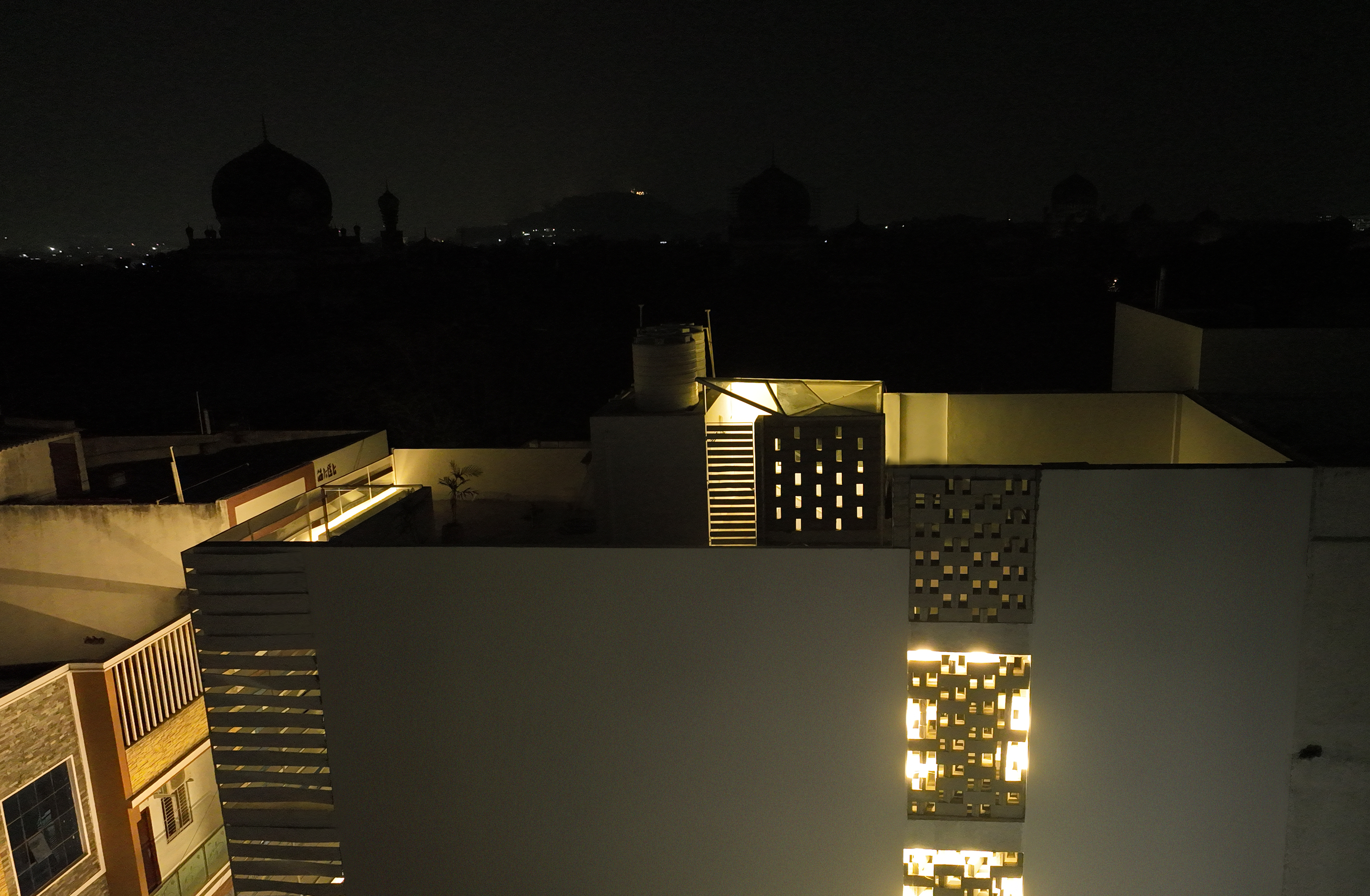 The rooftop terrace affords beautiful views of the neighboring Qutb Shahi Tombs and the green complex, and the Golconda Fort in the distance. The staircase is topped with a glass canopy that appears to be a folded surface, that lights the staircase naturally during the daytime and throws down a glow in the night. During the monsoon, raindrops fall onto the glass and can be enjoyed from below.