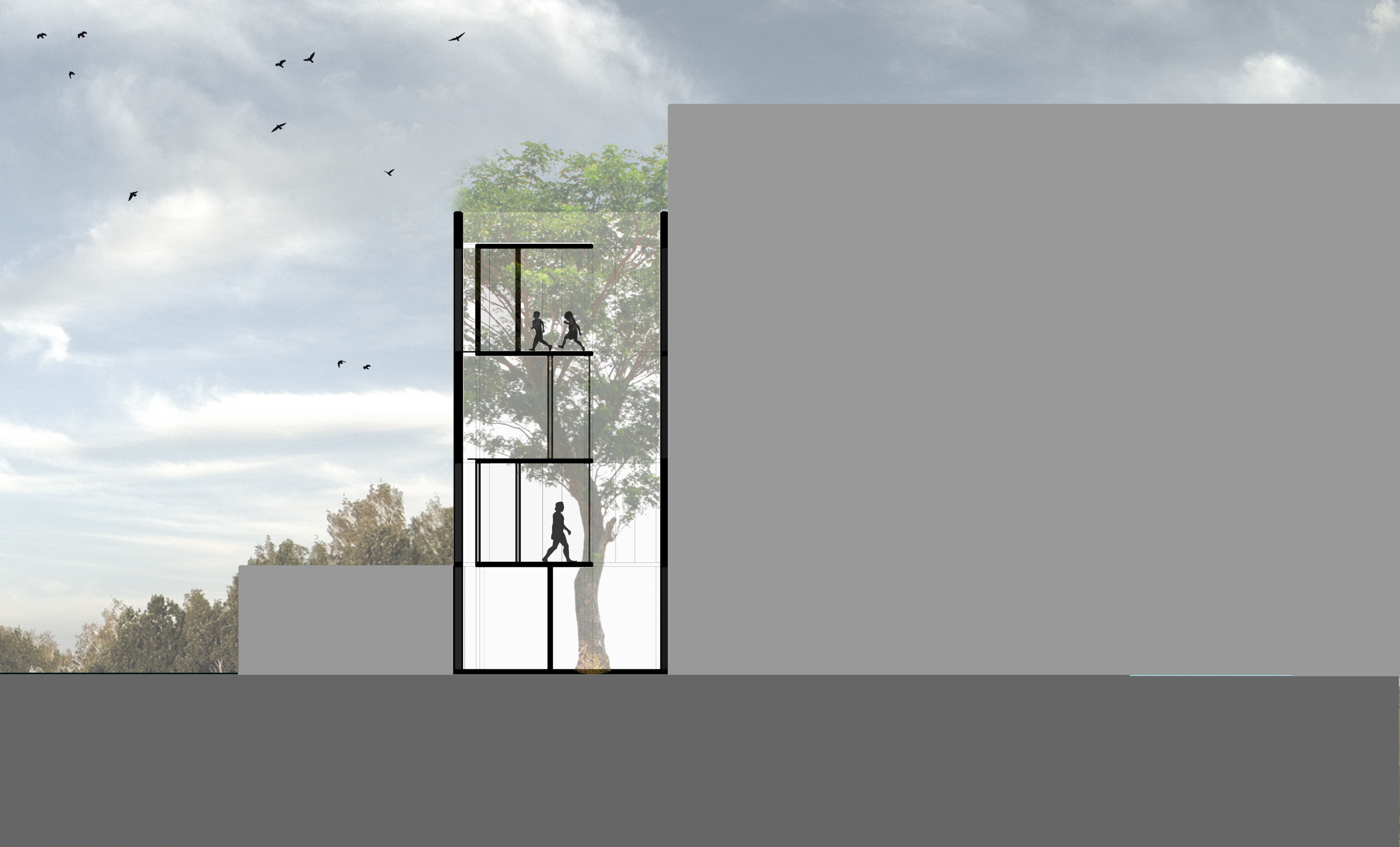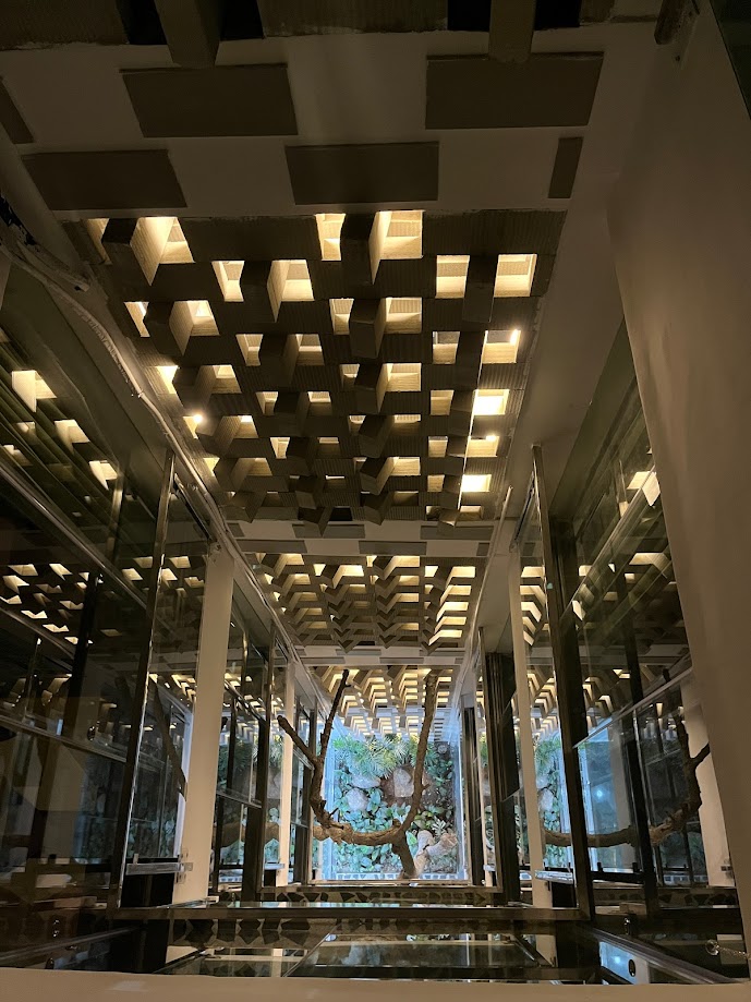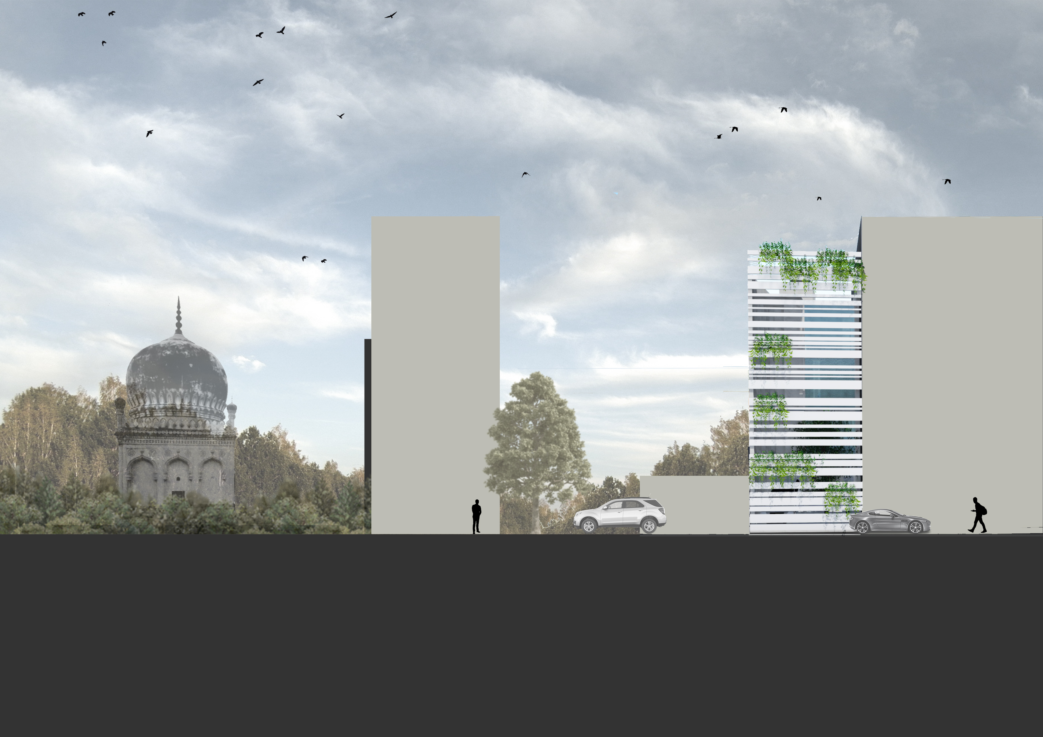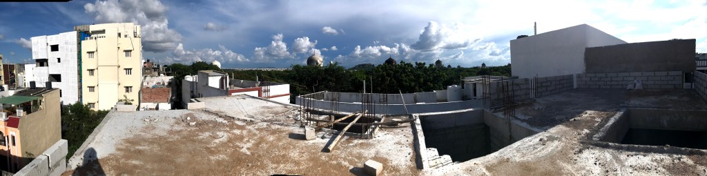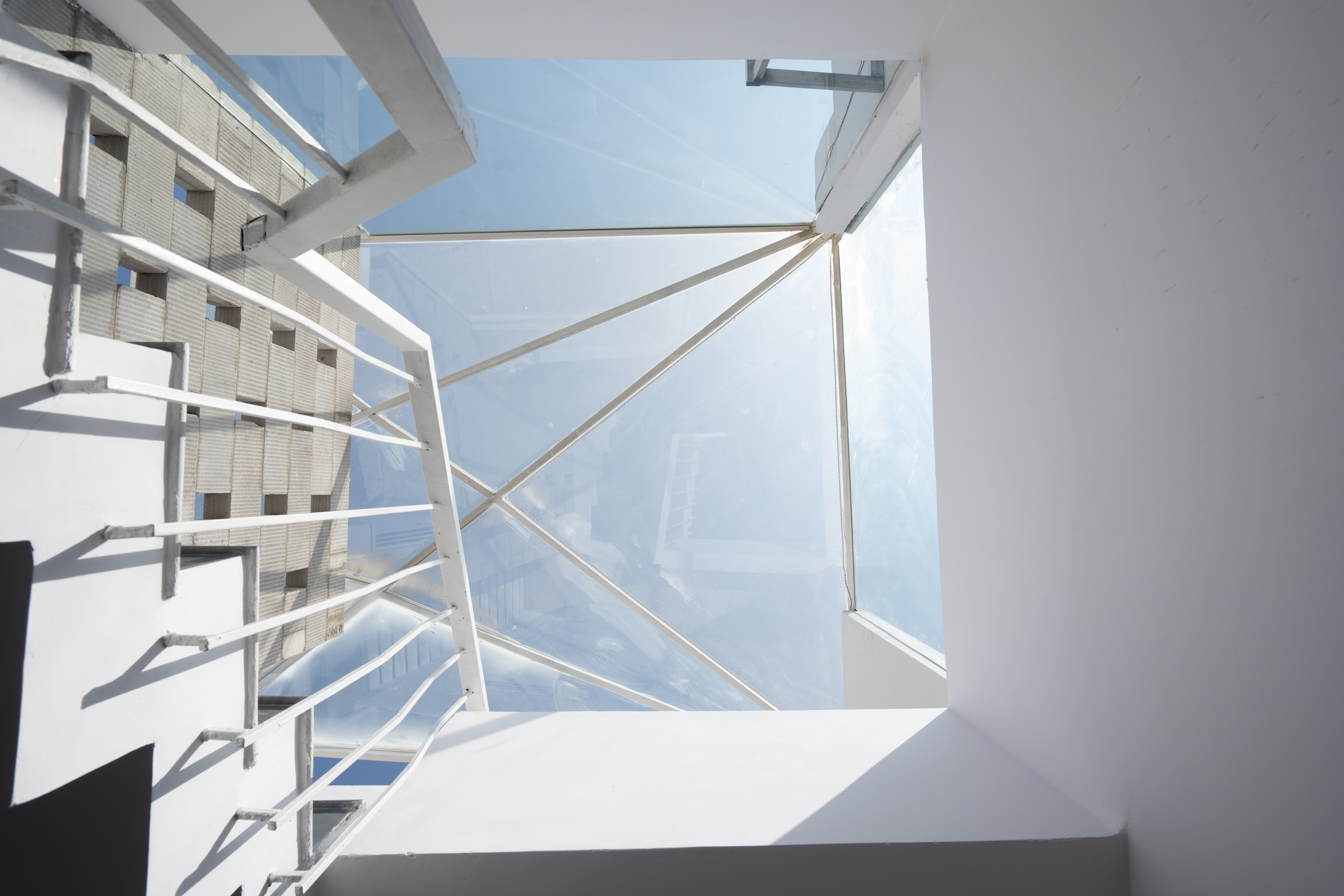The rooftop terrace affords beautiful views of the neighboring Qutb Shahi Tombs and the green complex, and the Golconda Fort in the distance. The staircase is topped with a glass canopy that appears to be a folded surface, that lights the staircase naturally during the daytime and throws down a glow in the night. During the monsoon, raindrops fall onto the glass and can be enjoyed from below.