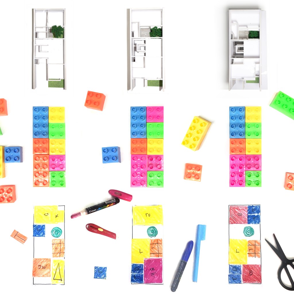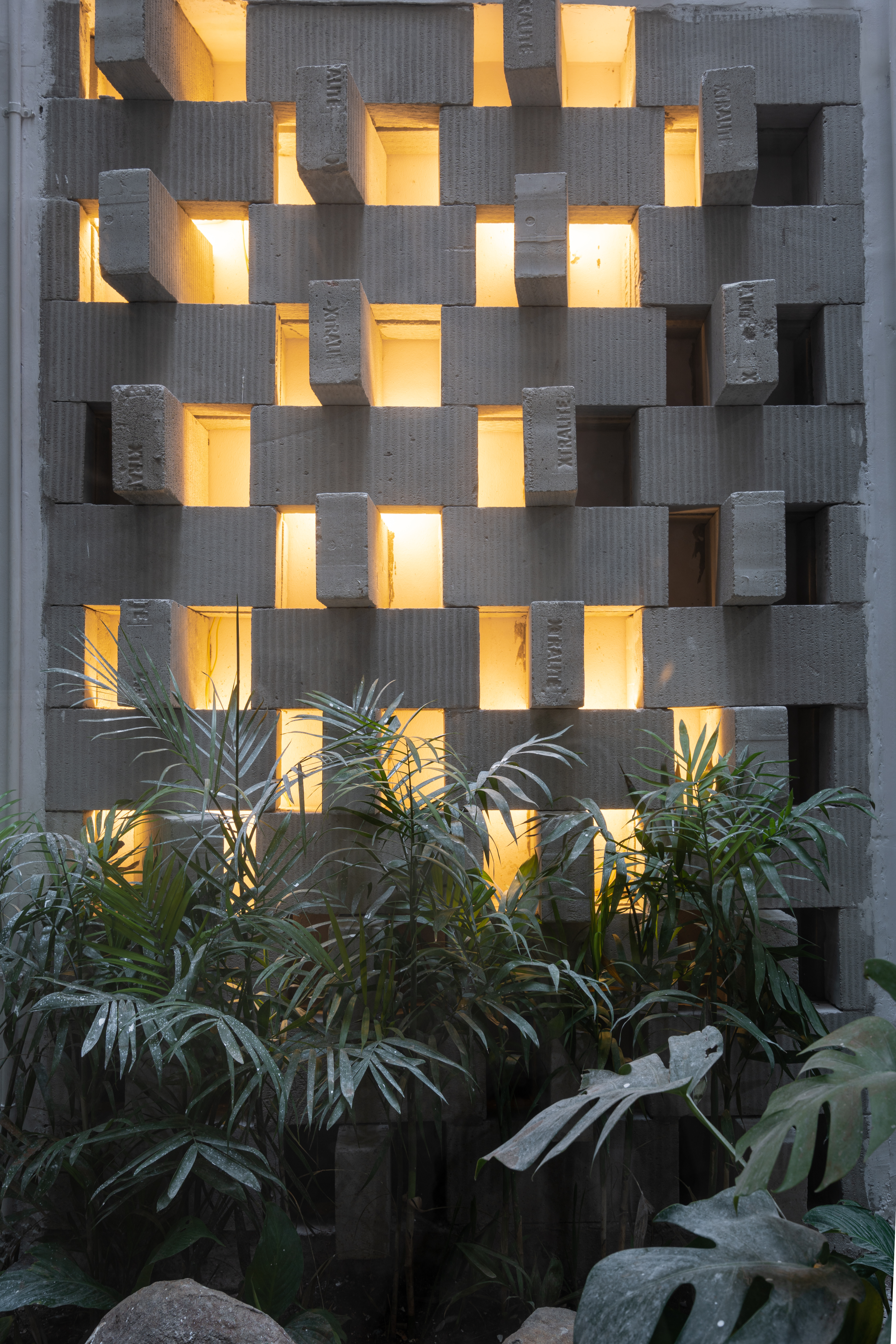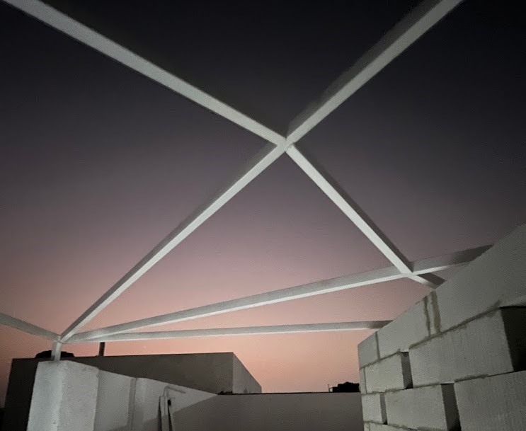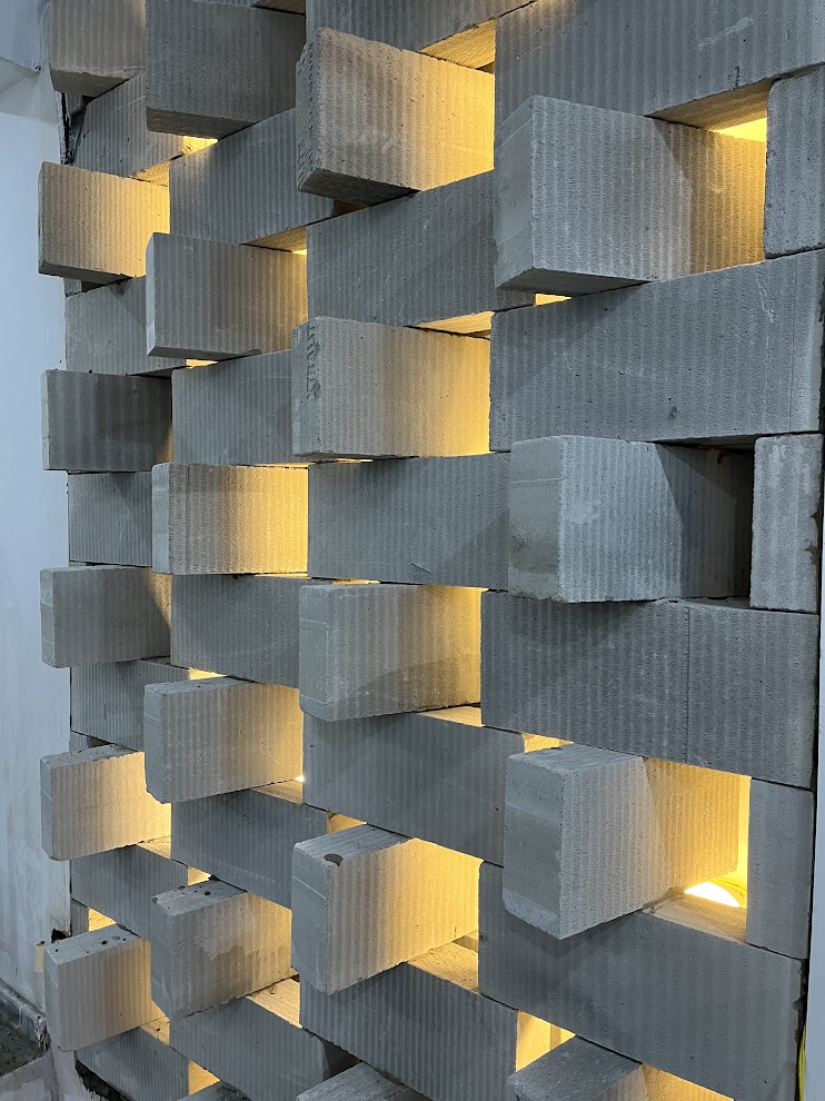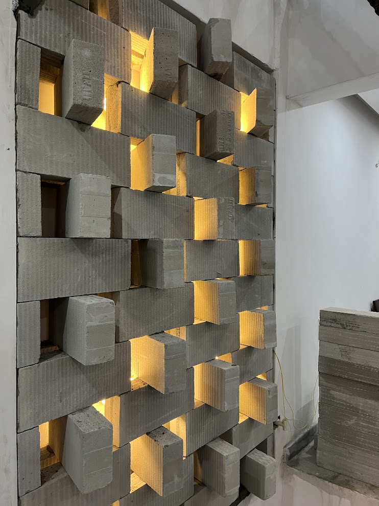 A perforated light-weight concrete block wall was designed in the shared space with the neighboring house. This allows for privacy while letting in cool air from the North into the courtyard. The Peekaboo wall uses computational design to play with angles of rotation of each concrete block to create an undulating geometric surface that restricts visibility but invites sunlight to cast interesting shadows in the interior. We applied the use of augmented reality tools for assembly of the Peekaboo wall, reducing the need for excessive measurement and mistakes on site. Through this process, we trained masons to use their smart phones during construction.