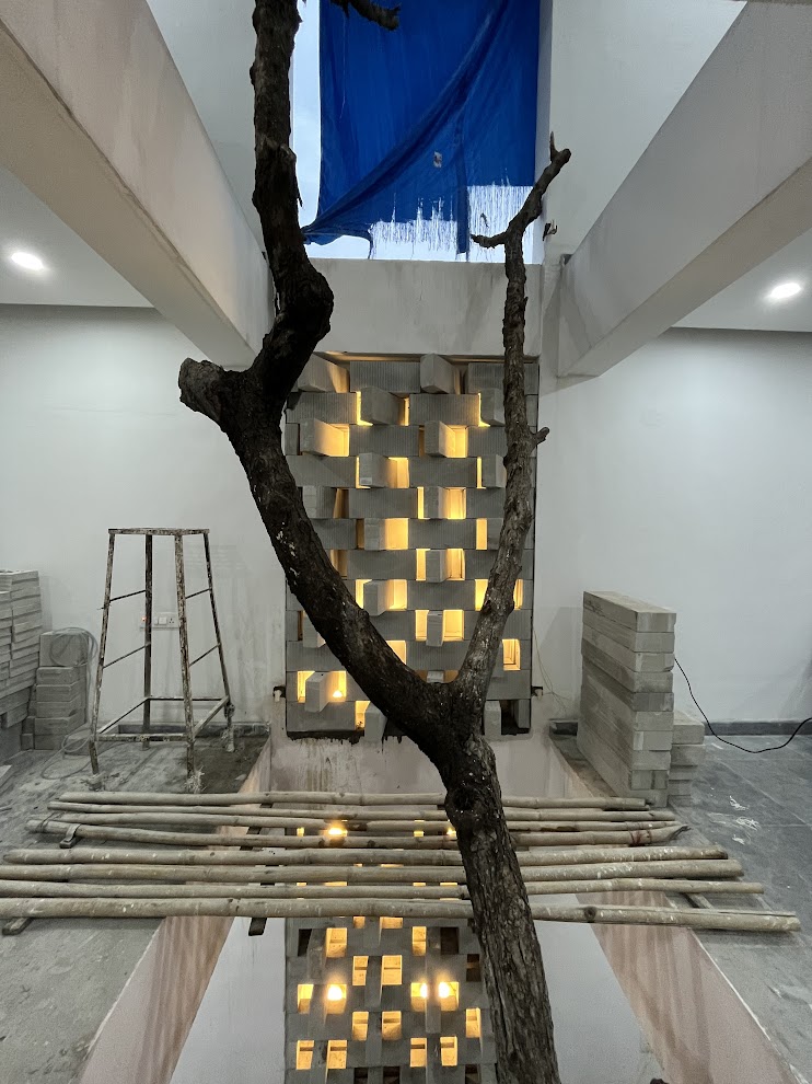 Once the design was completed, the client asked us to take up execution as well. After many halts due to the pandemic and its aftereffects, the construction has been completed. Being involved in execution gave us greater control over the quality of the built space and details, and allowed us to take design decisions on-site during construction. We had the opportunity to lower the wastage of material on site by repurposing it in various ways. Execution also allowed us to customize many aspects of the design, including lighting and furniture.