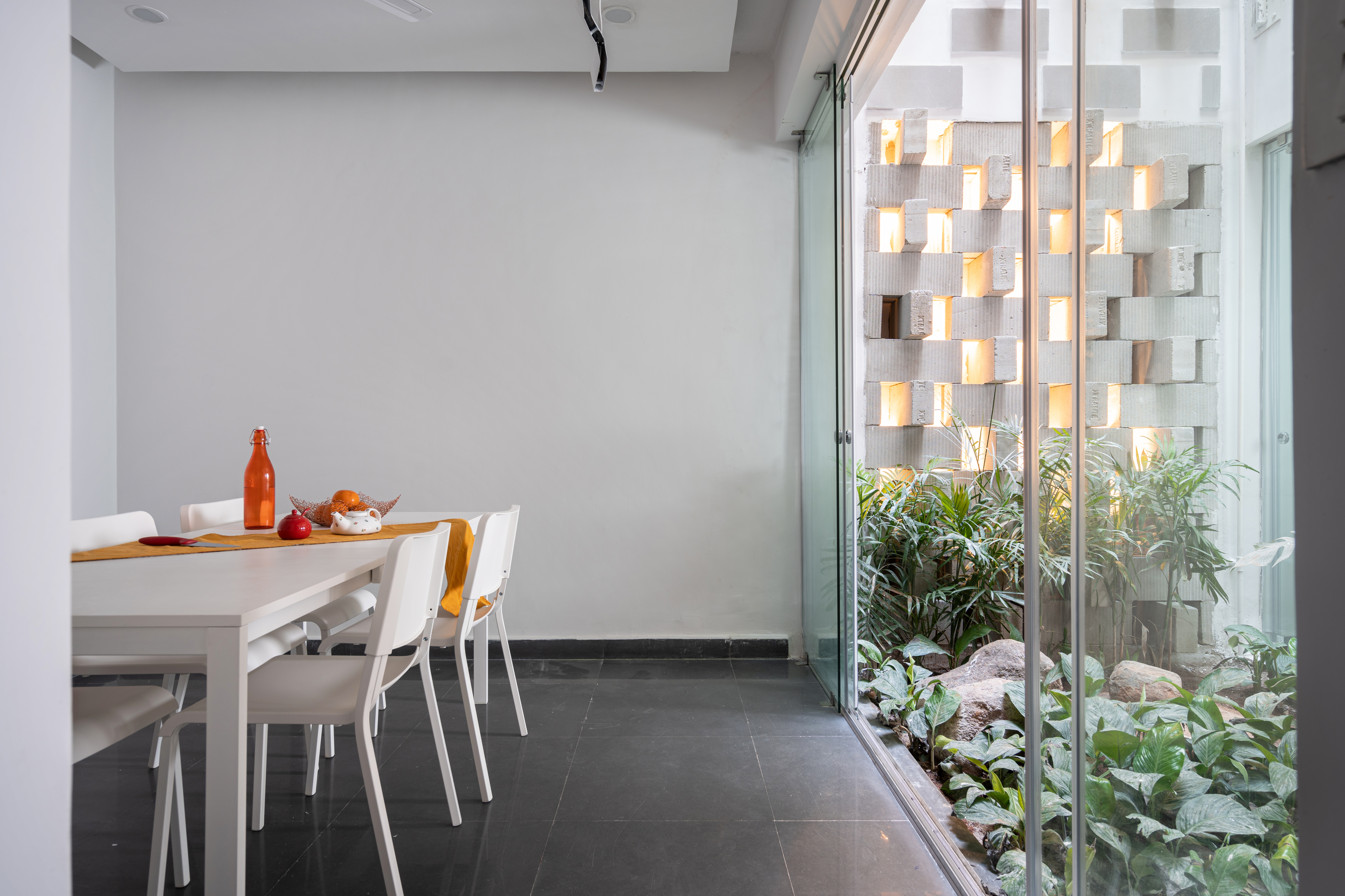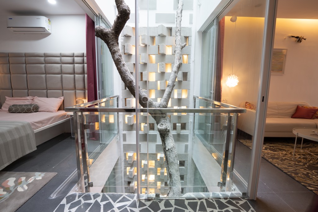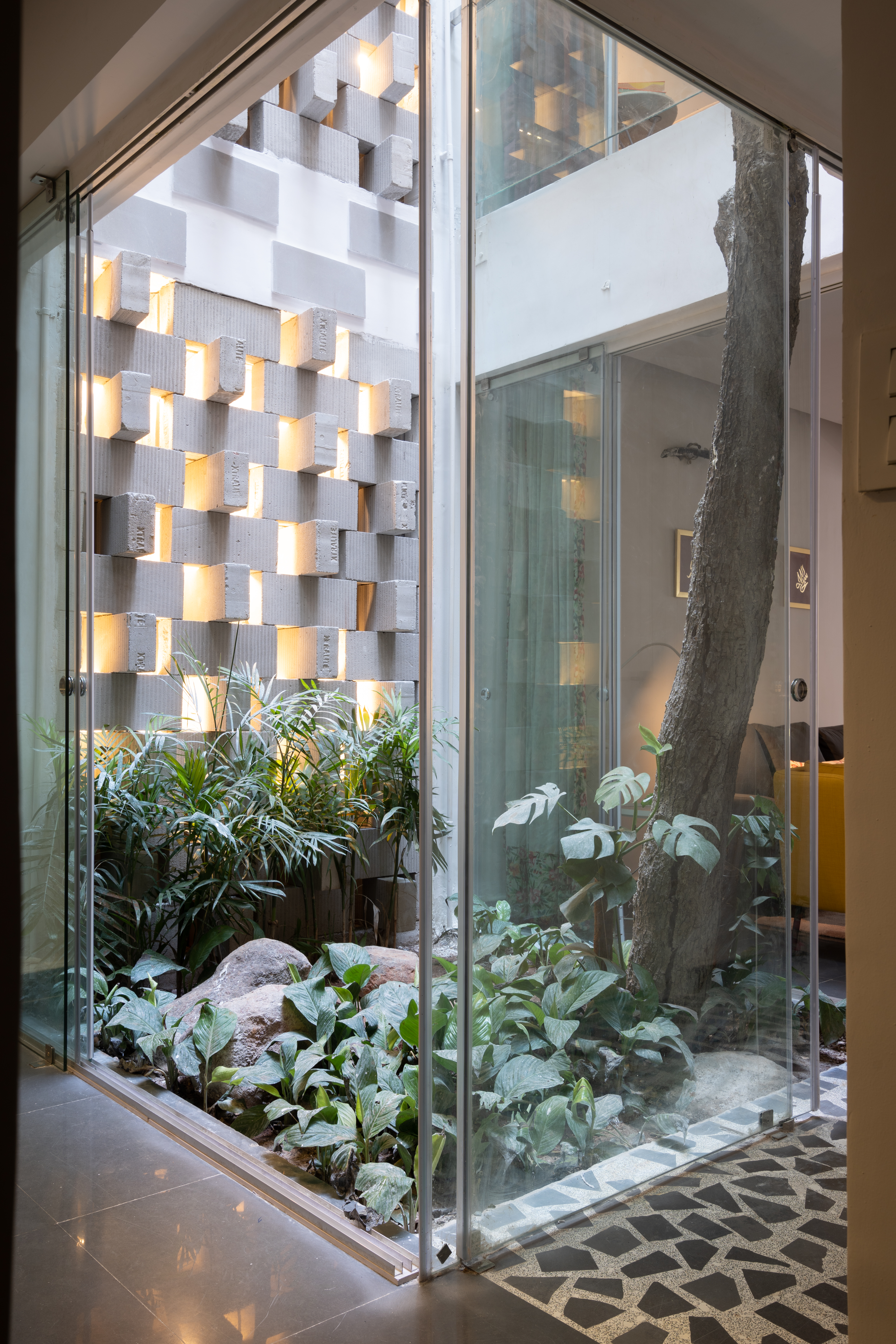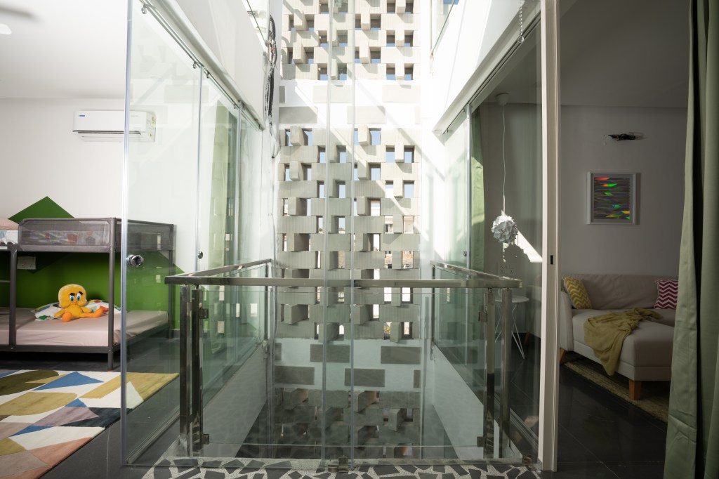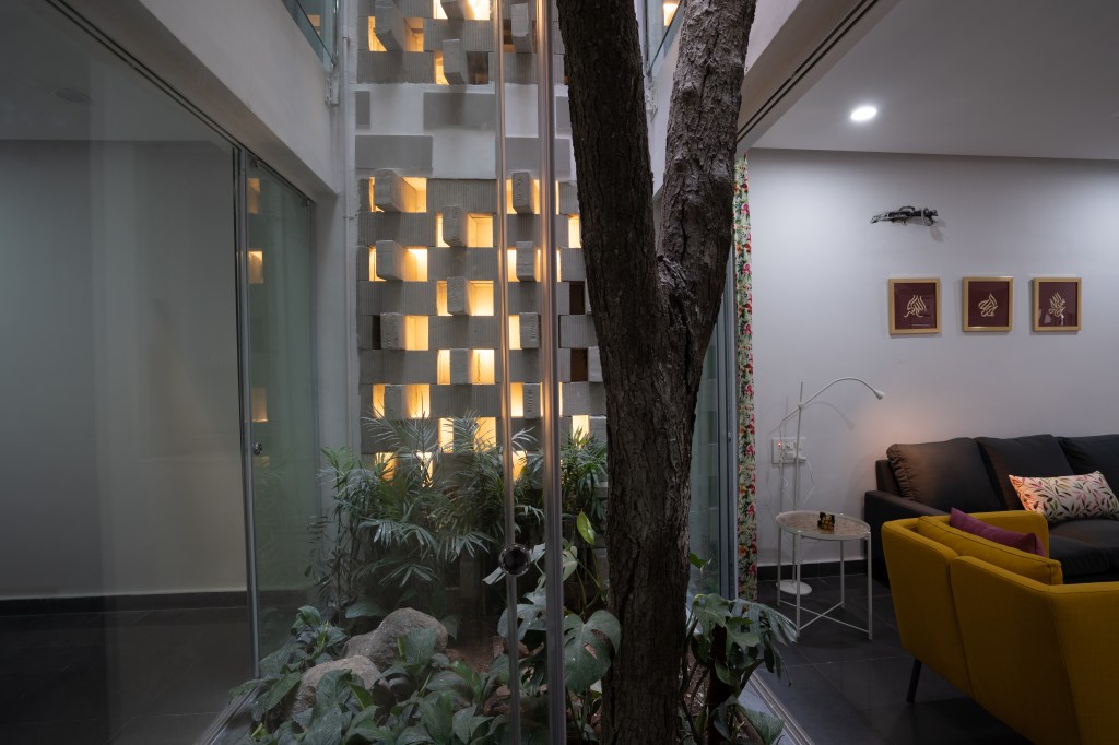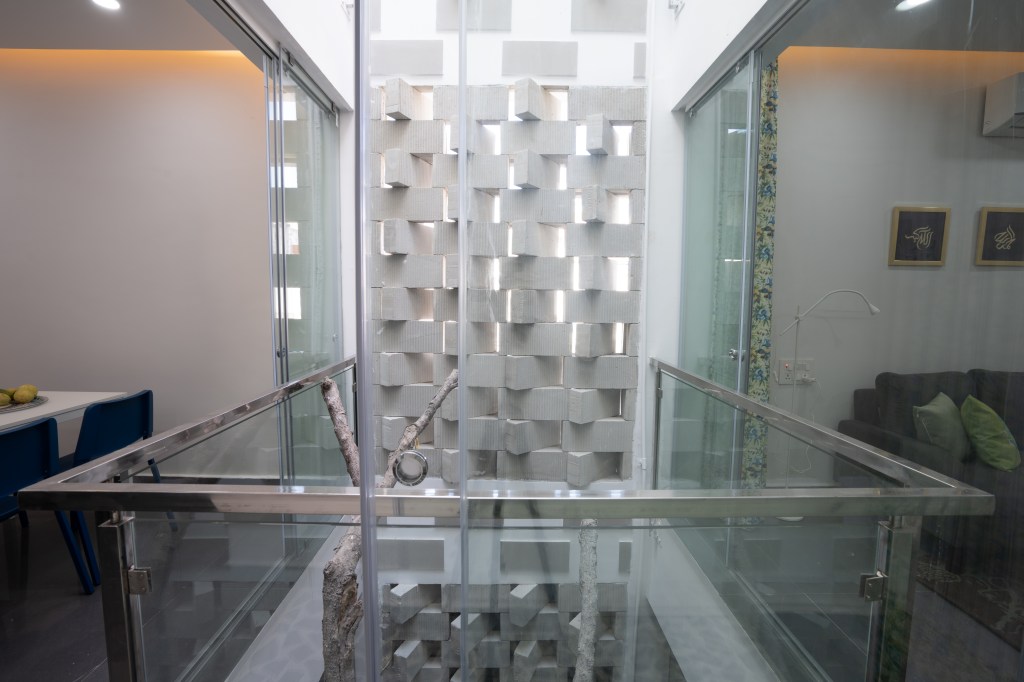 The courtyard effectively divides spaces, creating a broken plan and eliminating the need for solid walls: instead it is enclosed in frameless sliding glass doors that welcome interaction with the garden on the ground floor and create verandahs on alternate upper levels to overlook this green space. During the heat of the summer, the courtyard and perforated wall act as a wind tunnel and direct a breeze to cool the interior of the house. The air is especially fresh and clean due to proximity to the Tombs complex, which is a protected area filled with indigenous trees and plants, as well as step wells. In the monsoon, rain falls directly into the courtyard and can be enjoyed from inside the house.