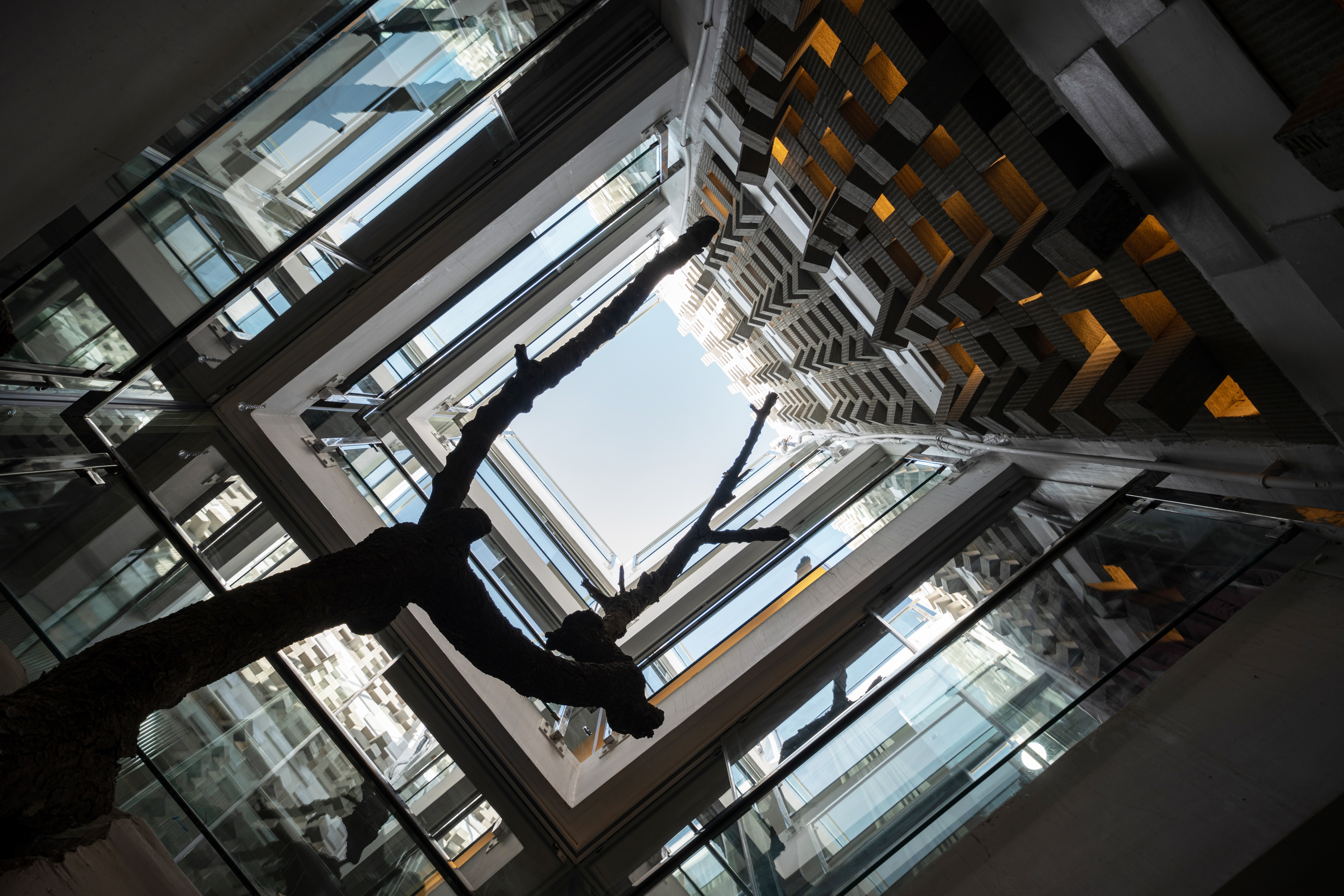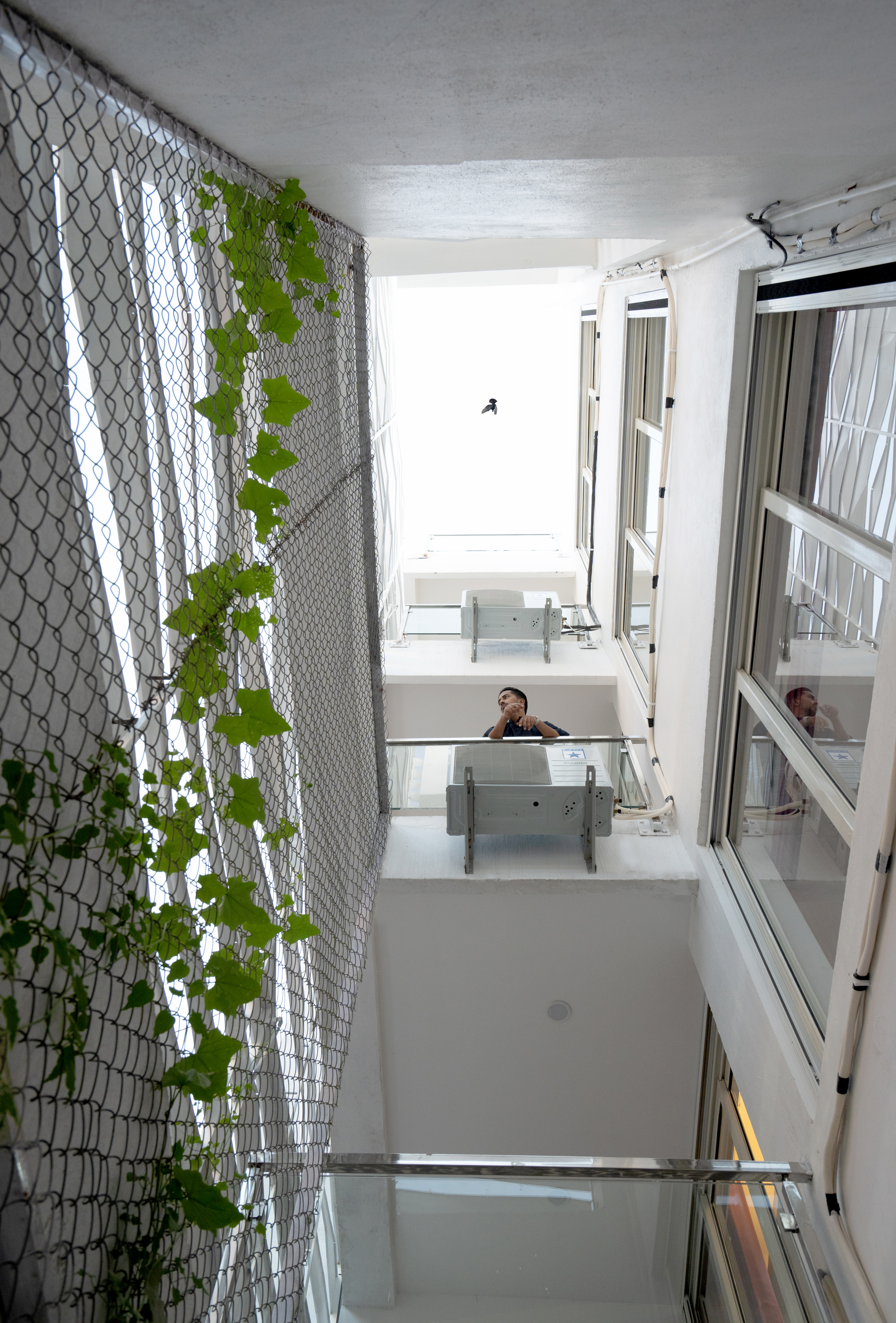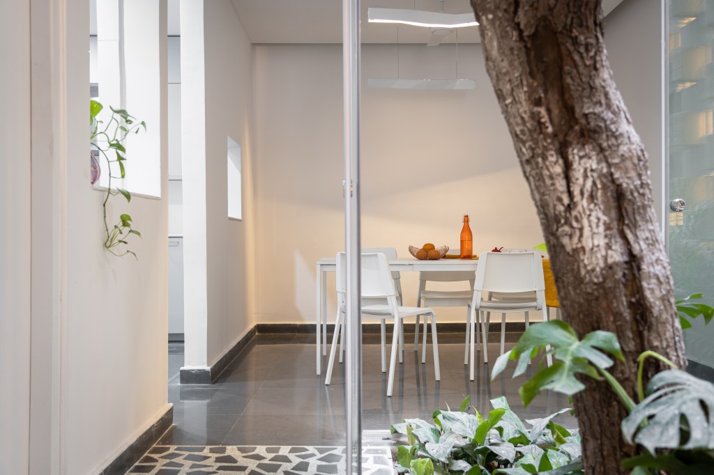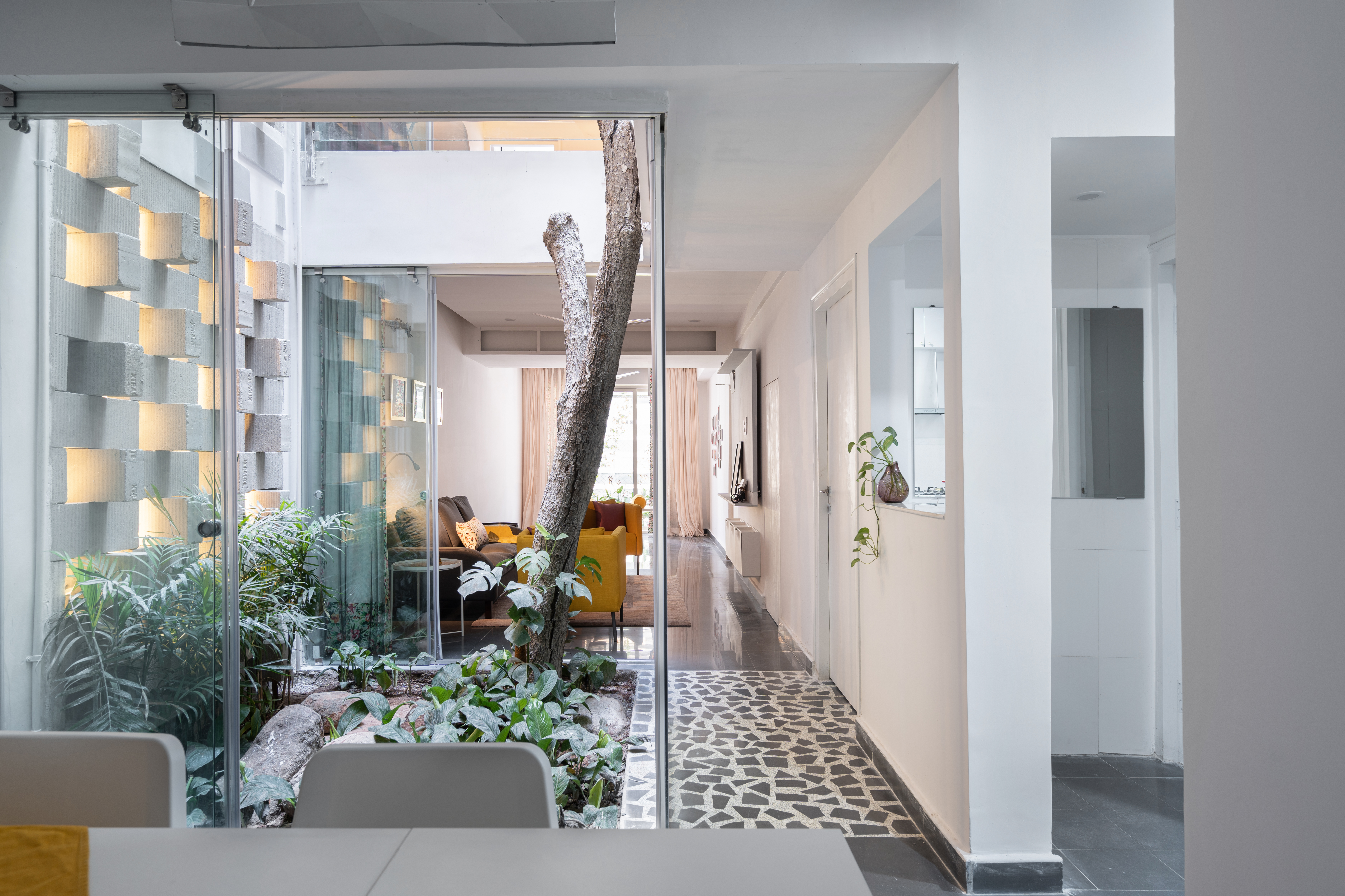 The courtyard effectively divides spaces, creating a broken plan and eliminating the need for solid walls: instead it is enclosed in frameless sliding glass doors that welcome interaction with the garden on the ground floor and create verandahs on alternate upper levels to overlook this green space. During the heat of the summer, the courtyard and perforated wall act as a wind tunnel and direct a breeze to cool the interior of the house. The air is especially fresh and clean due to proximity to the Tombs complex, which is a protected area filled with indigenous trees and plants, as well as step wells. In the monsoon, rain falls directly into the courtyard and can be enjoyed from inside the house.