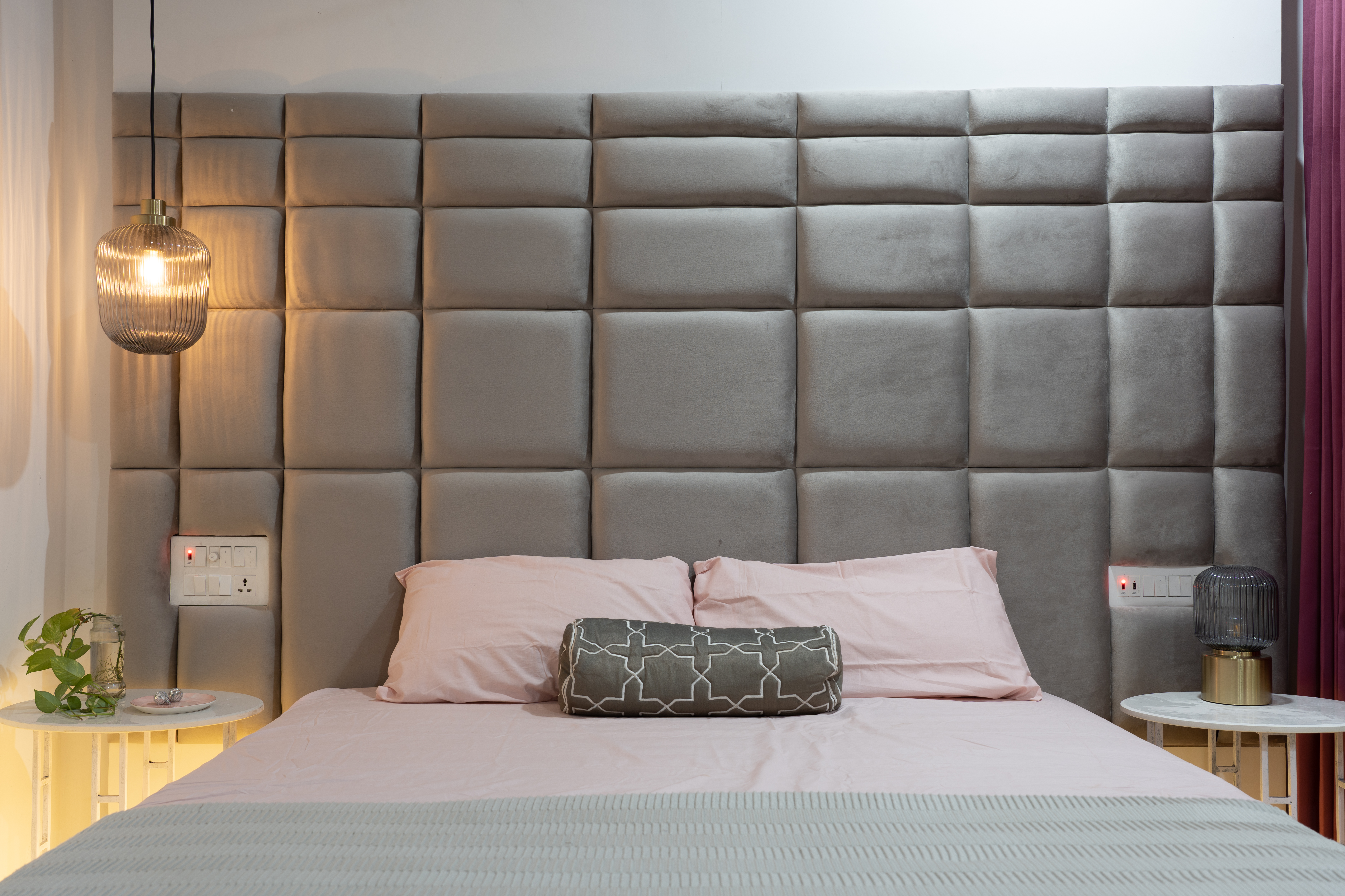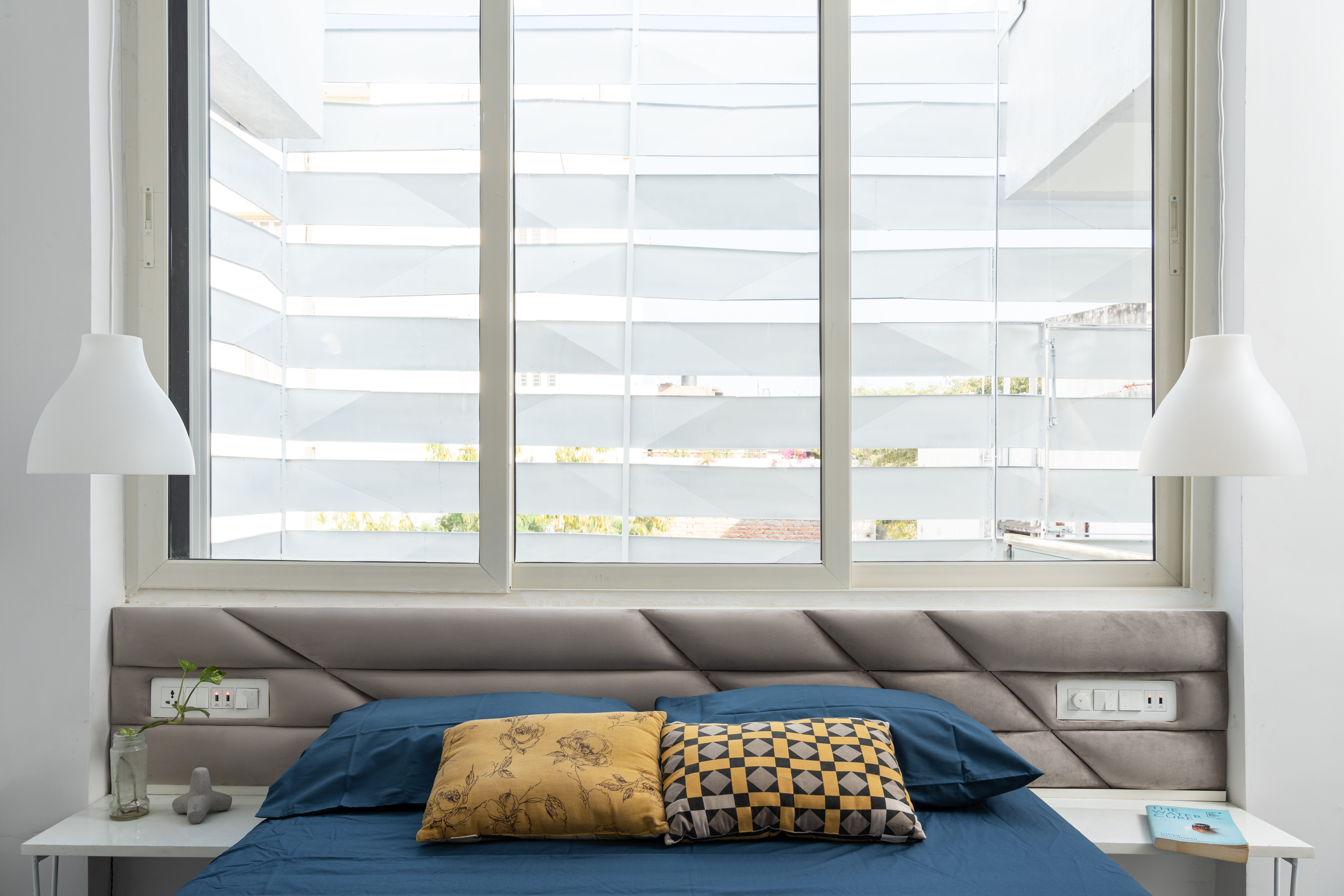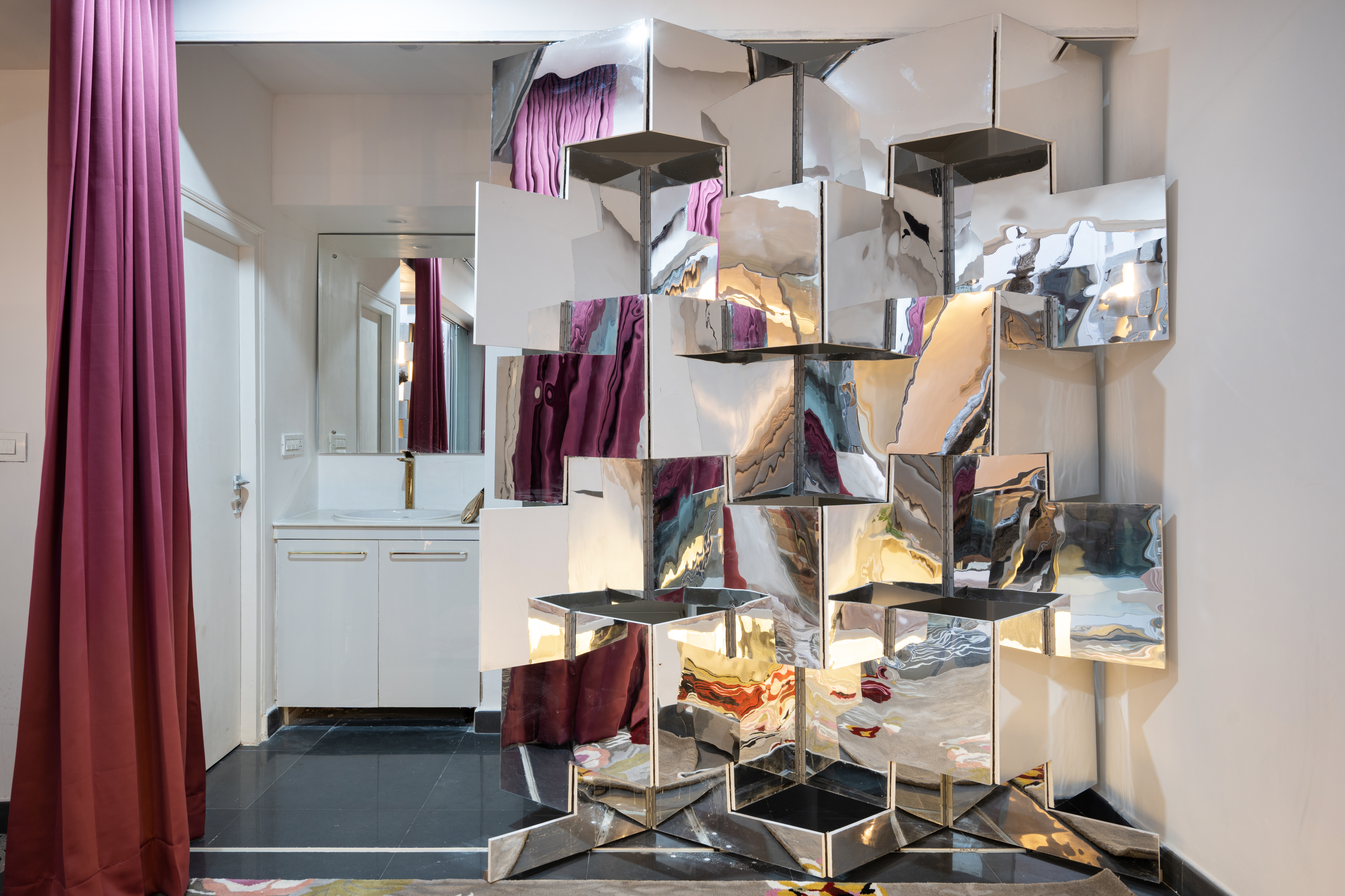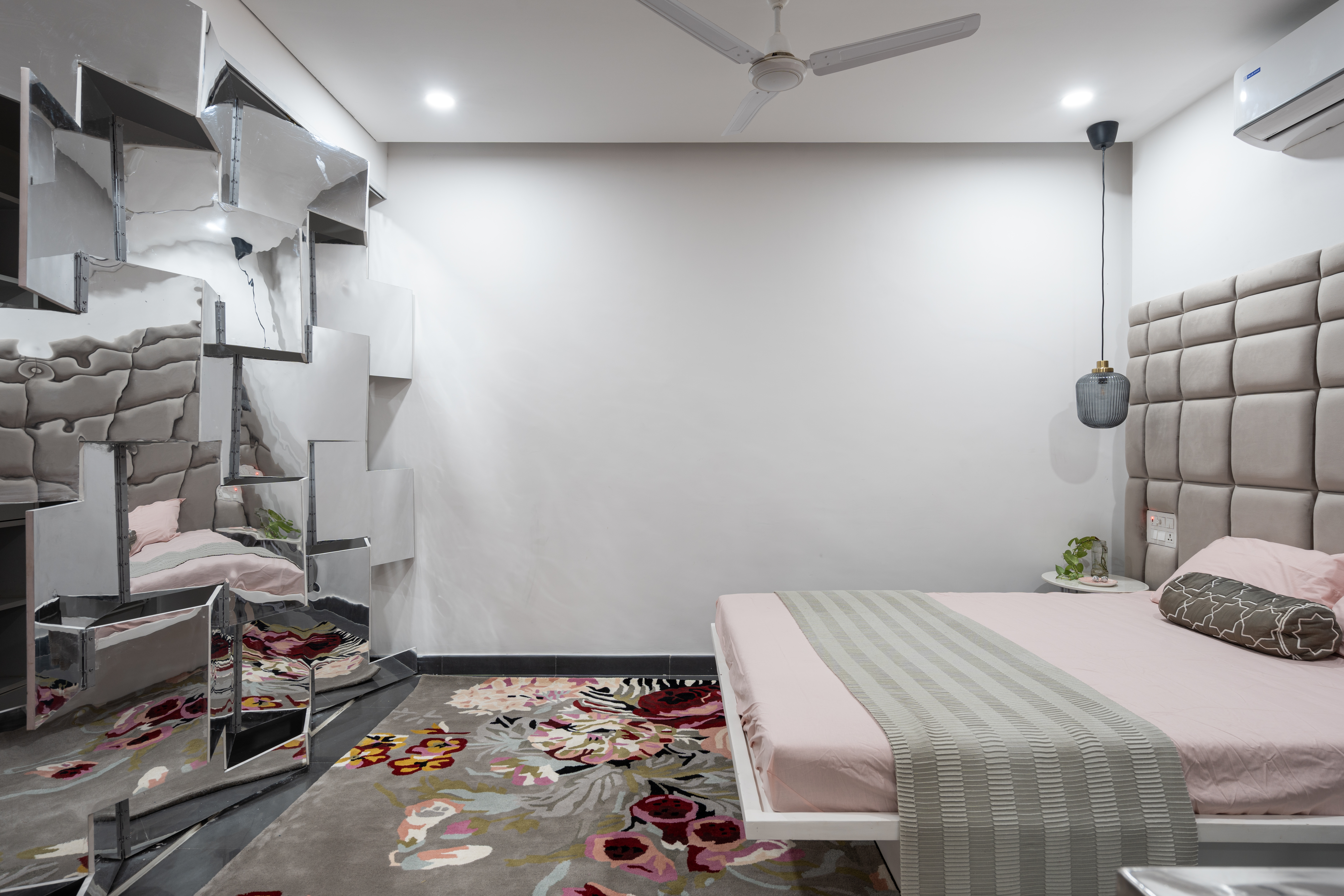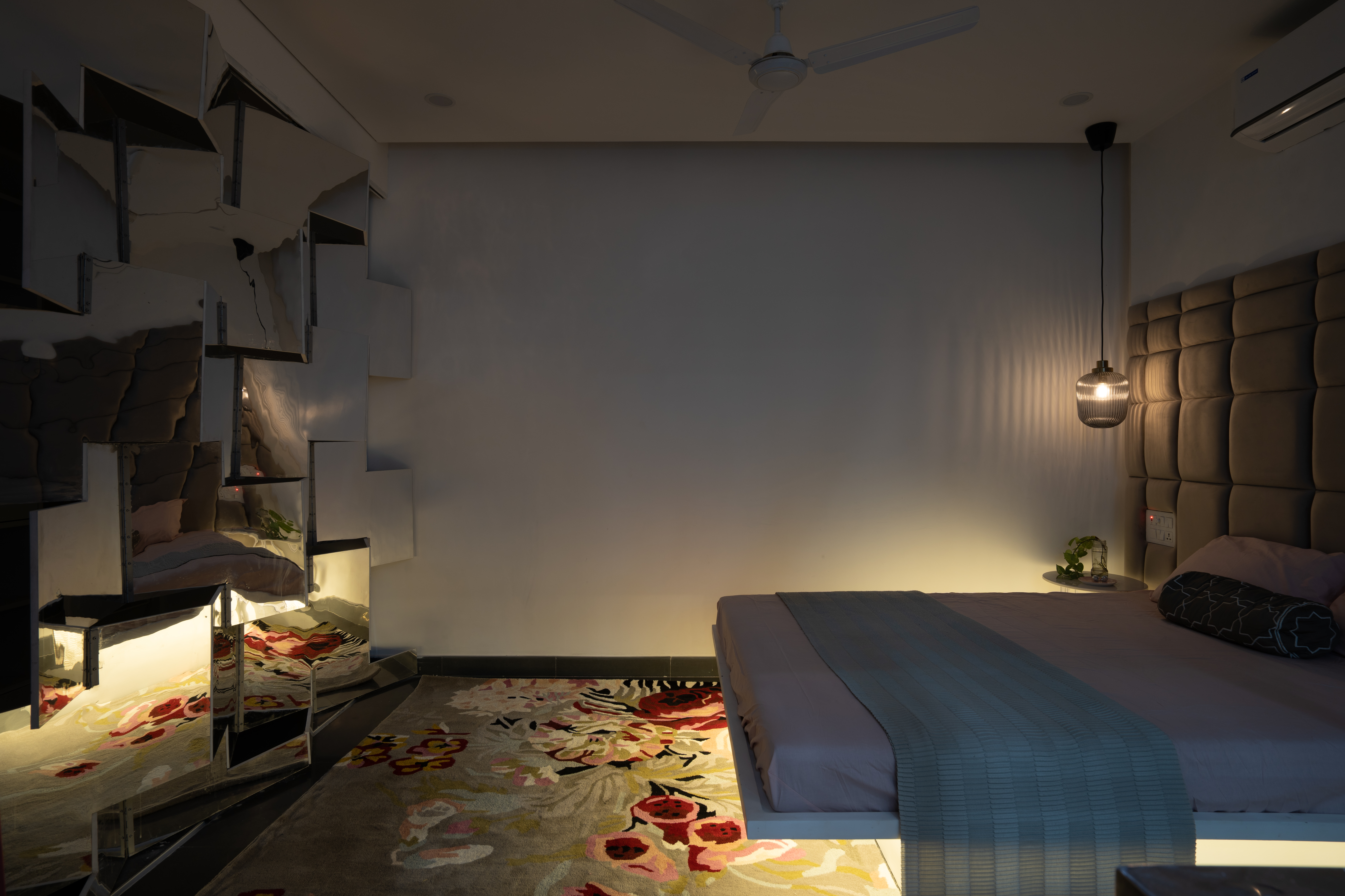 We practice repetition of motifs in a prototypical manner throughout the same project. At every level, the front bedroom headboards have been customized to reflect the folds of the façade at that level. The master bedroom has a larger tufted headboard that seems to continue the grid of the Peekaboo wall. Opposite to the bed is Fold, an origami-inspired foldable partition between the master bedroom and the dressing area, clad in mirrored laminate that reflects the various lights and textures of the room, expanding the space visually.