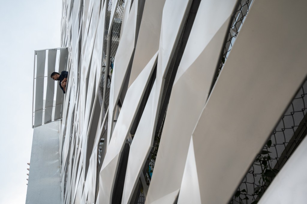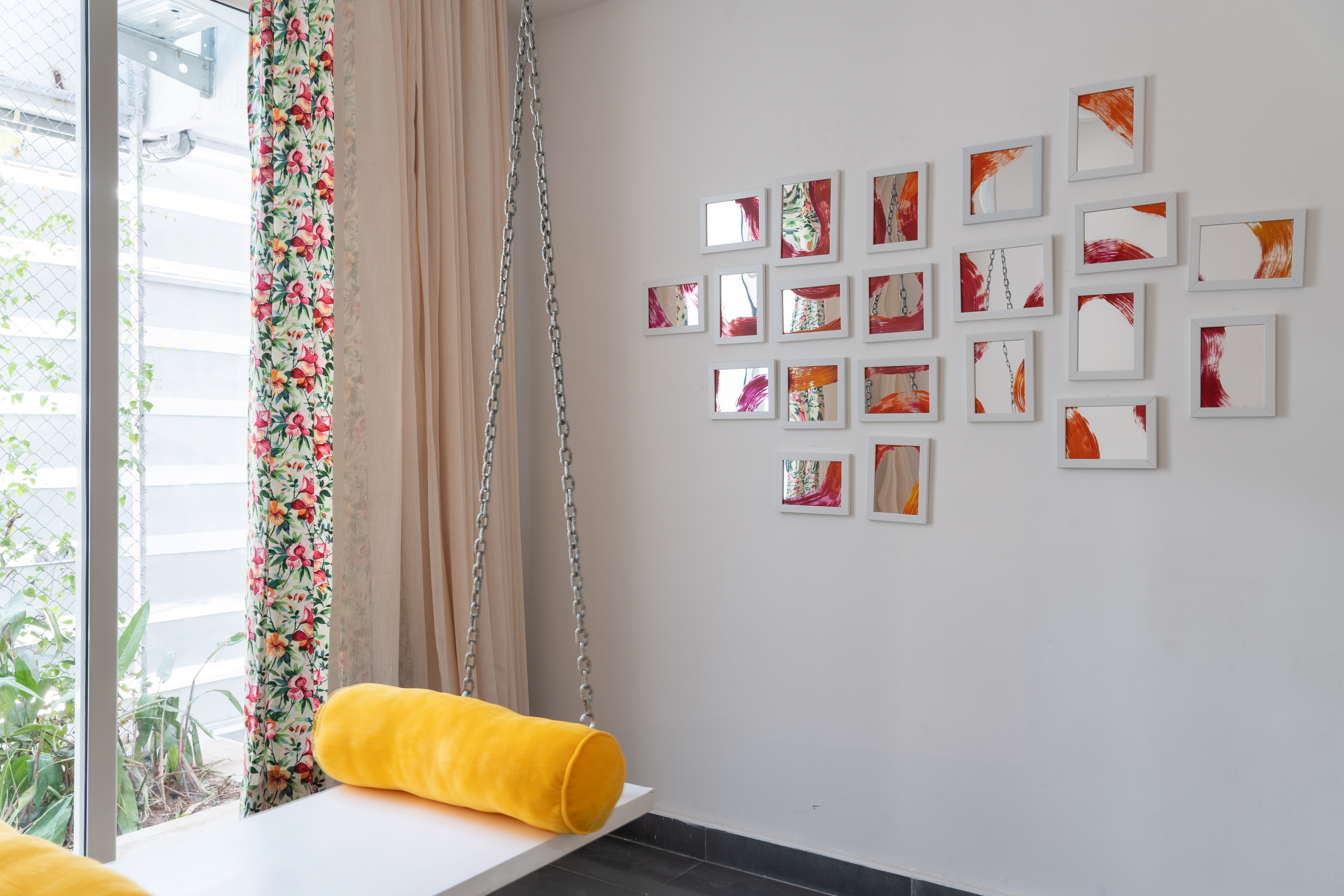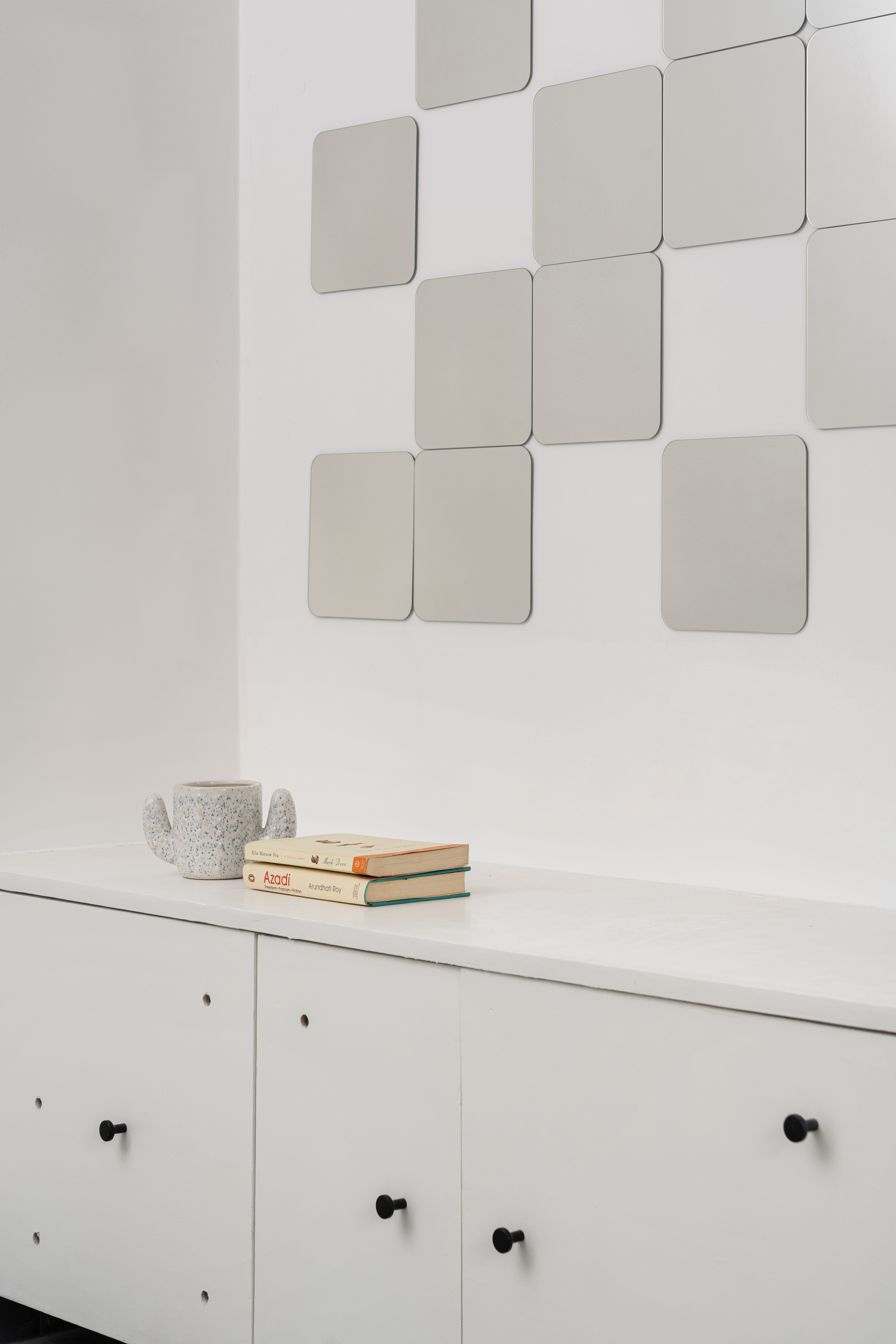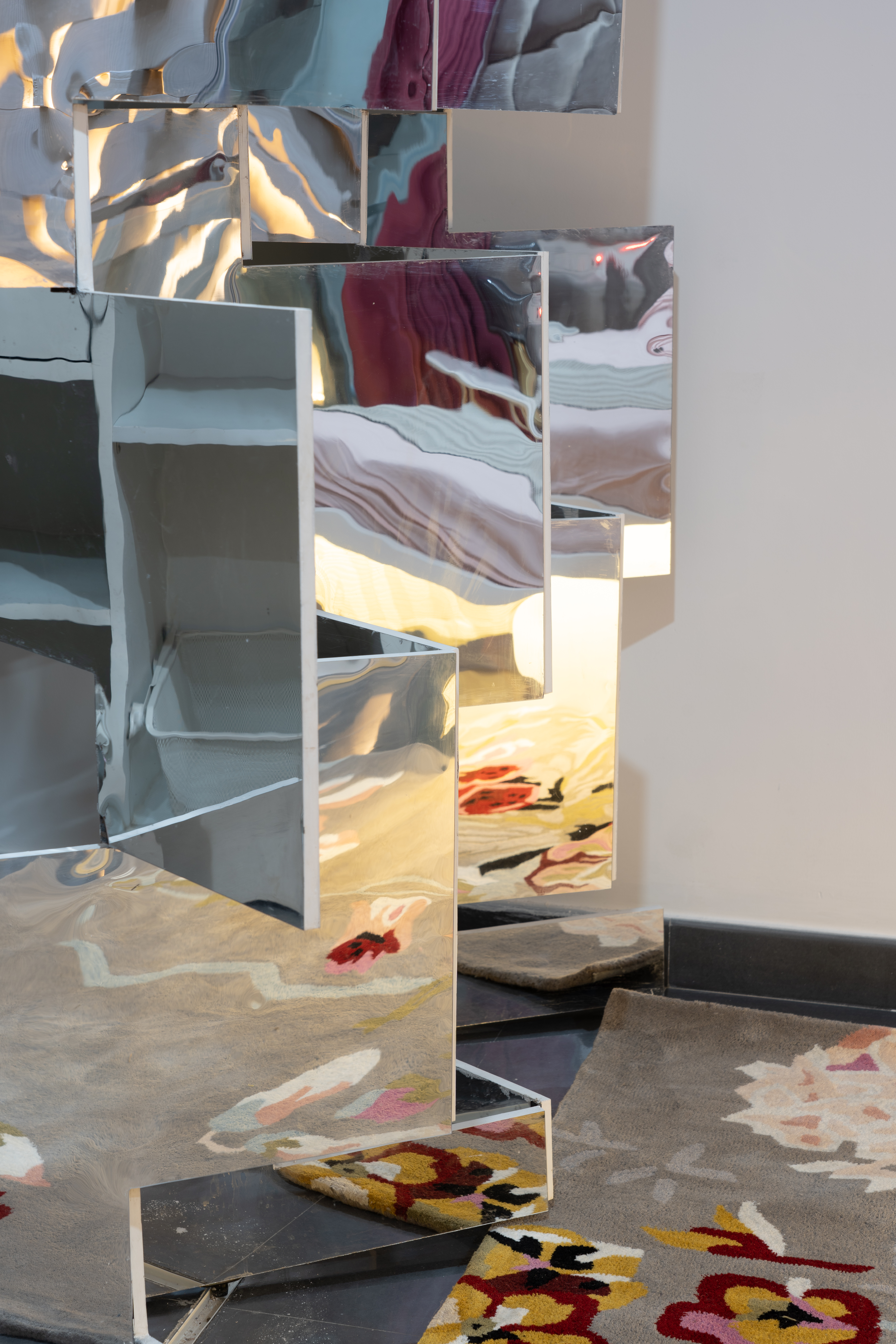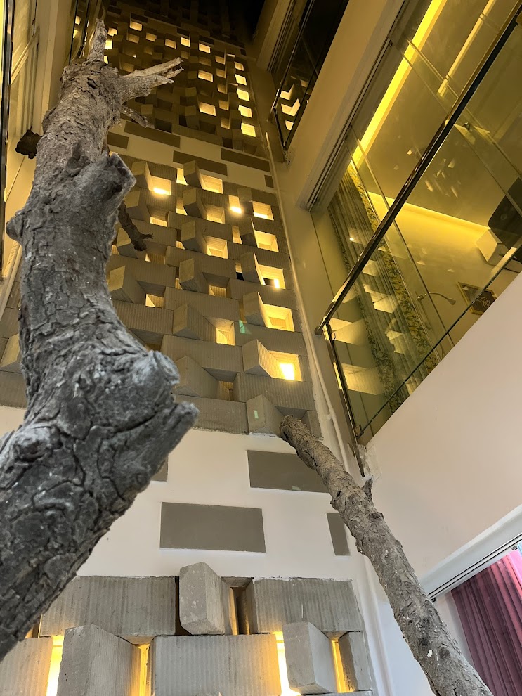 We practice repetition of motifs in a prototypical manner throughout the same project. At every level, the front bedroom headboards have been customized to reflect the folds of the façade at that level. The master bedroom has a larger tufted headboard that seems to continue the grid of the Peekaboo wall. Opposite to the bed is Fold, an origami-inspired foldable partition between the master bedroom and the dressing area, clad in mirrored laminate that reflects the various lights and textures of the room, expanding the space visually.
