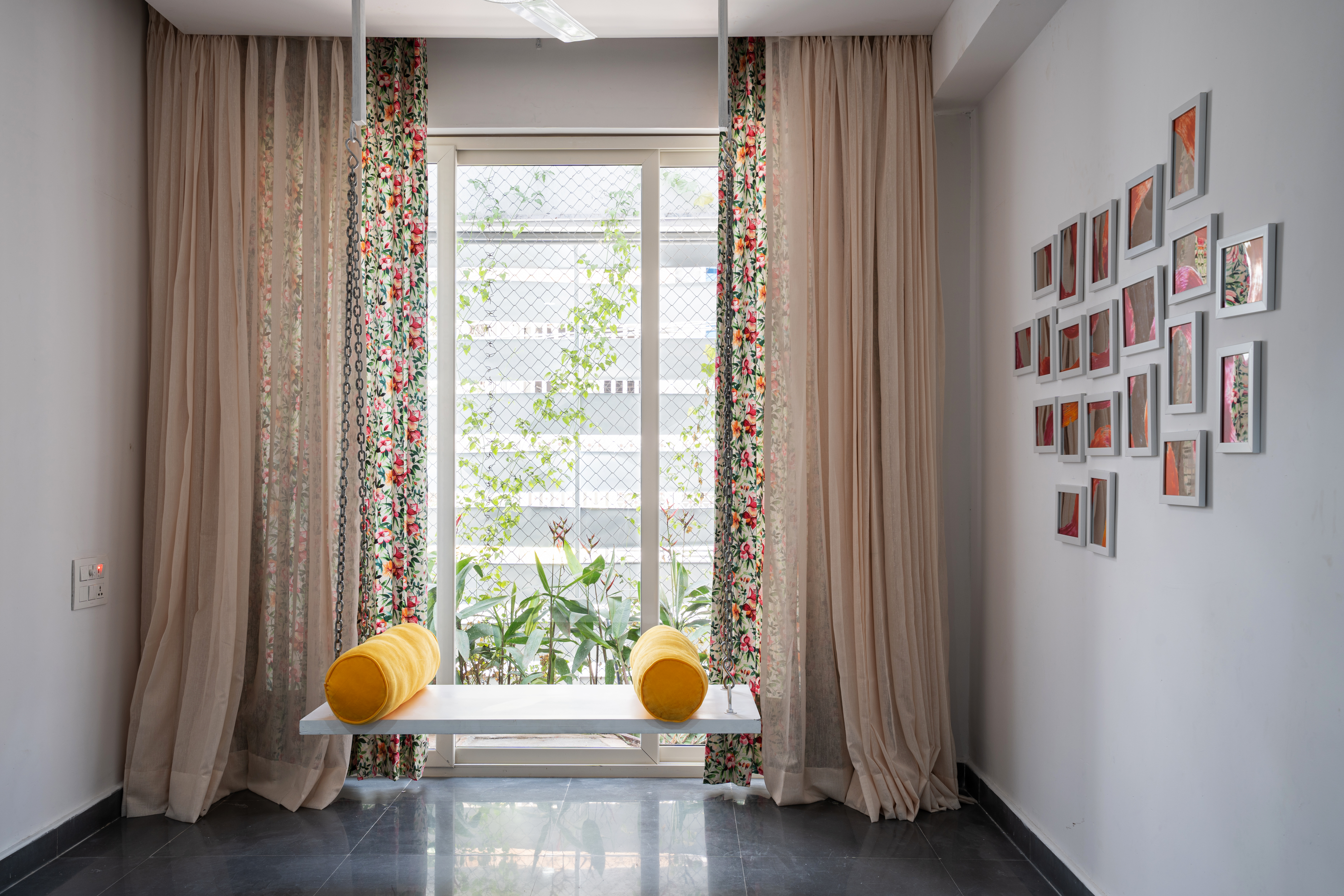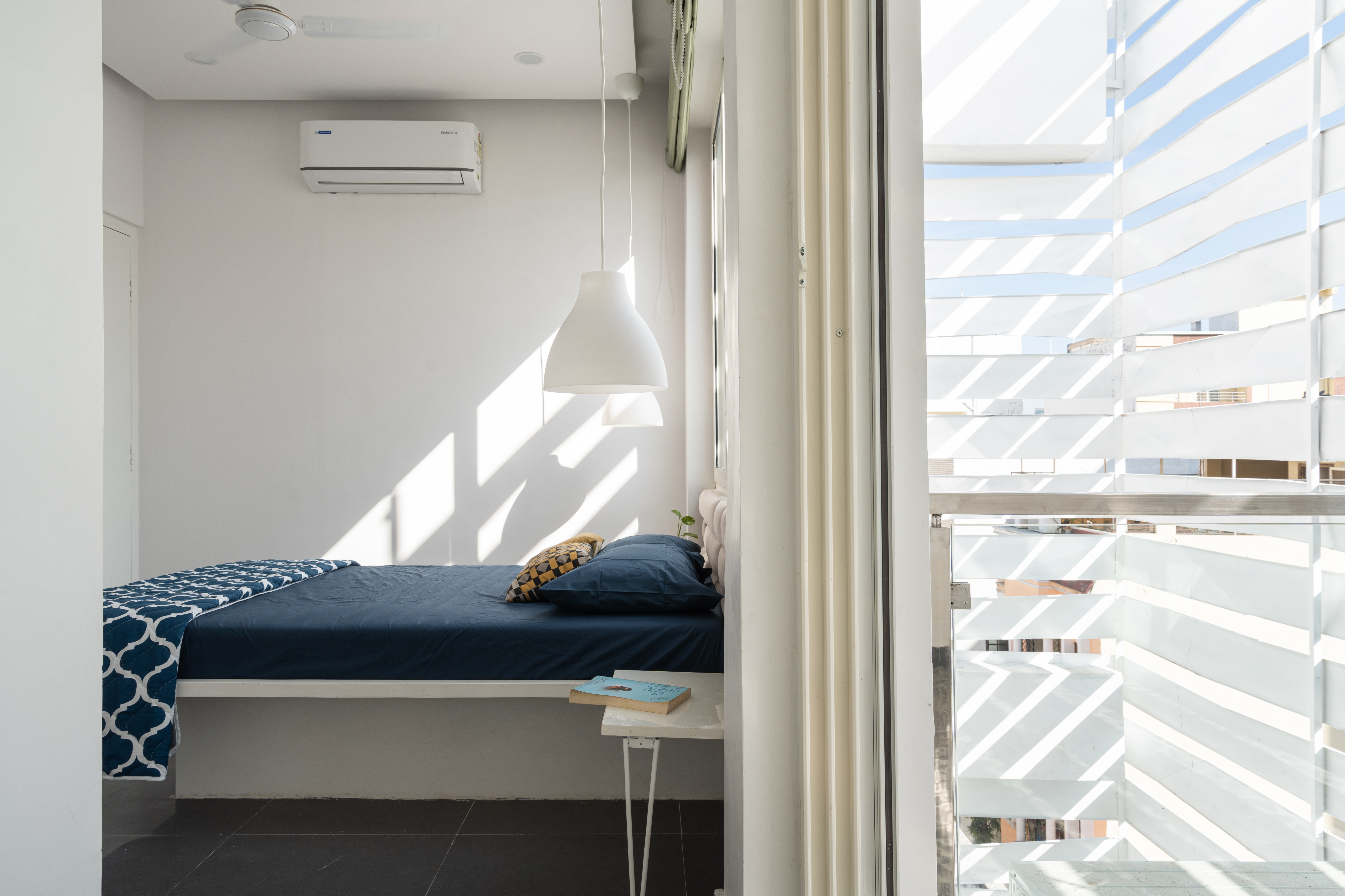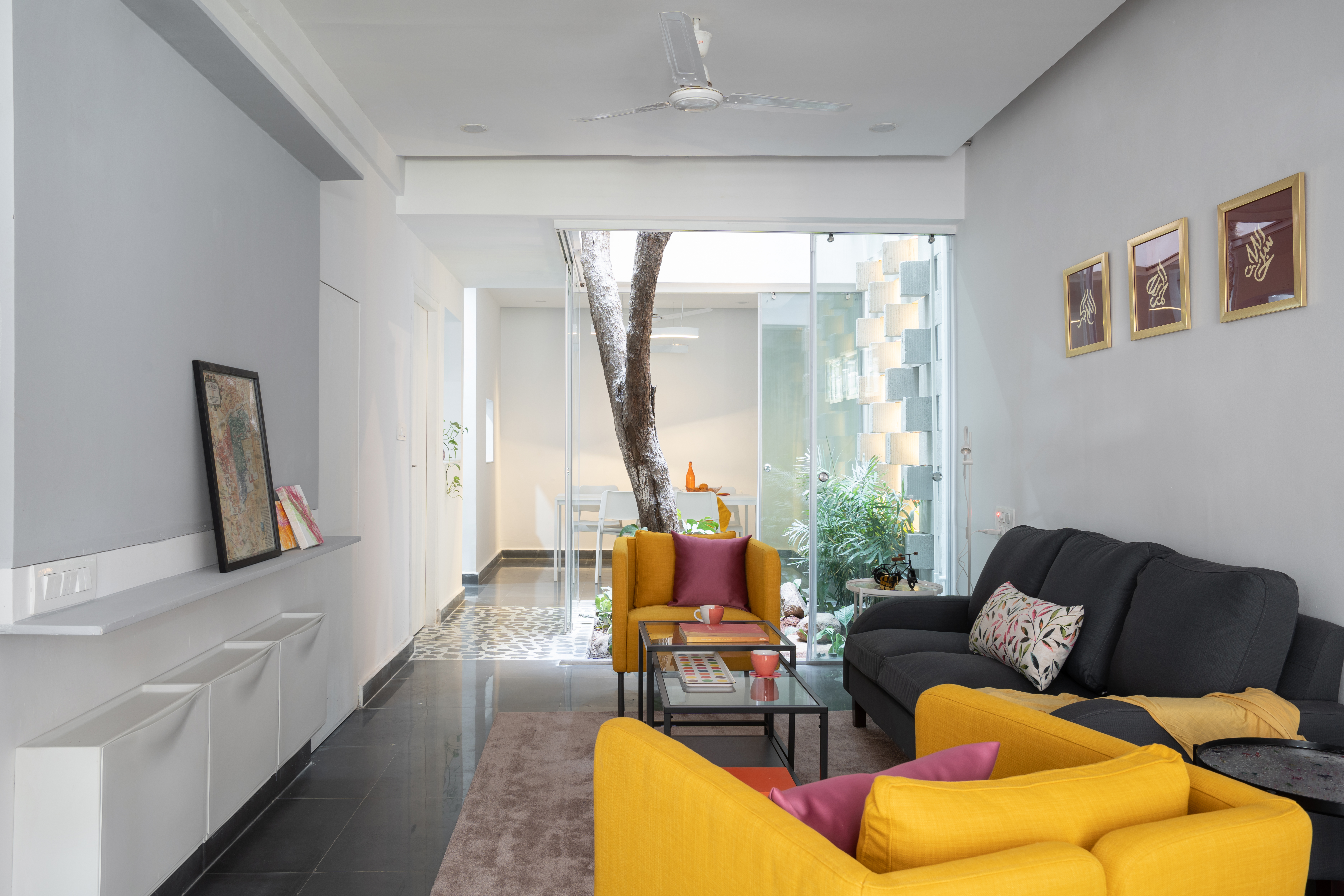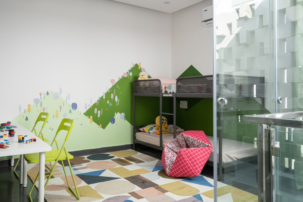 Due to limited area, many space-saving measures had to be adopted in this house, such as built-in wardrobes and convertible side tables in the front bedrooms. The architectural color palette was intentionally restrained, white dominant to create a sense of spaciousness. In the interiors, pops of bright colors create warm and cool themes from the two units, and a mural depicting mountains was custom-designed for the children’s bedroom. The master bedroom and the children’s bedroom are on alternate levels, and have adjoining verandahs connected to the courtyard. There are multiple possible combinations for function and privacy. Fluted glass doors can be locked to enclose these verandahs within the rooms, or remain open. The frameless glass sliding doors open up to reveal the corner of the verandah to enjoyed fresh air from inside the room.