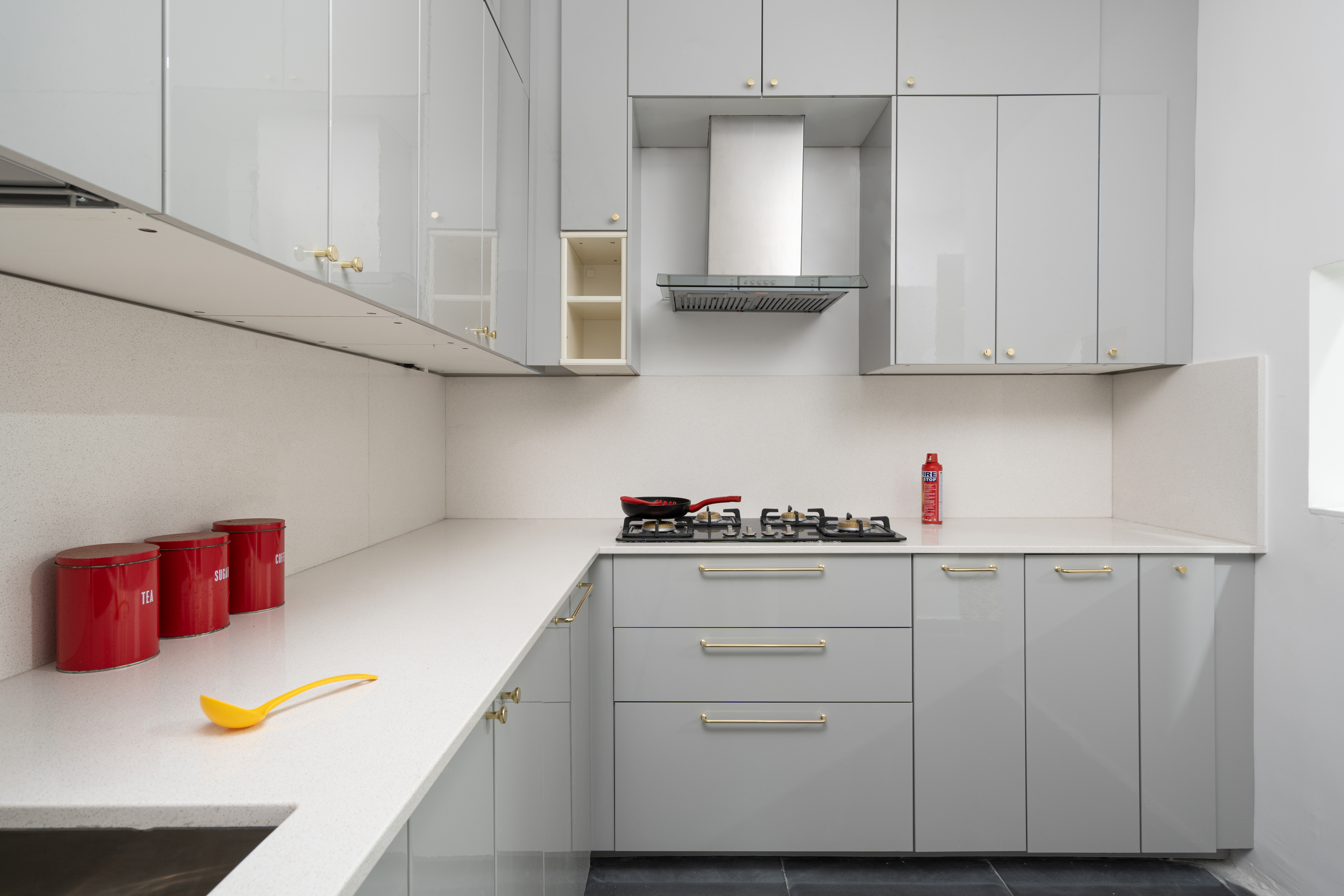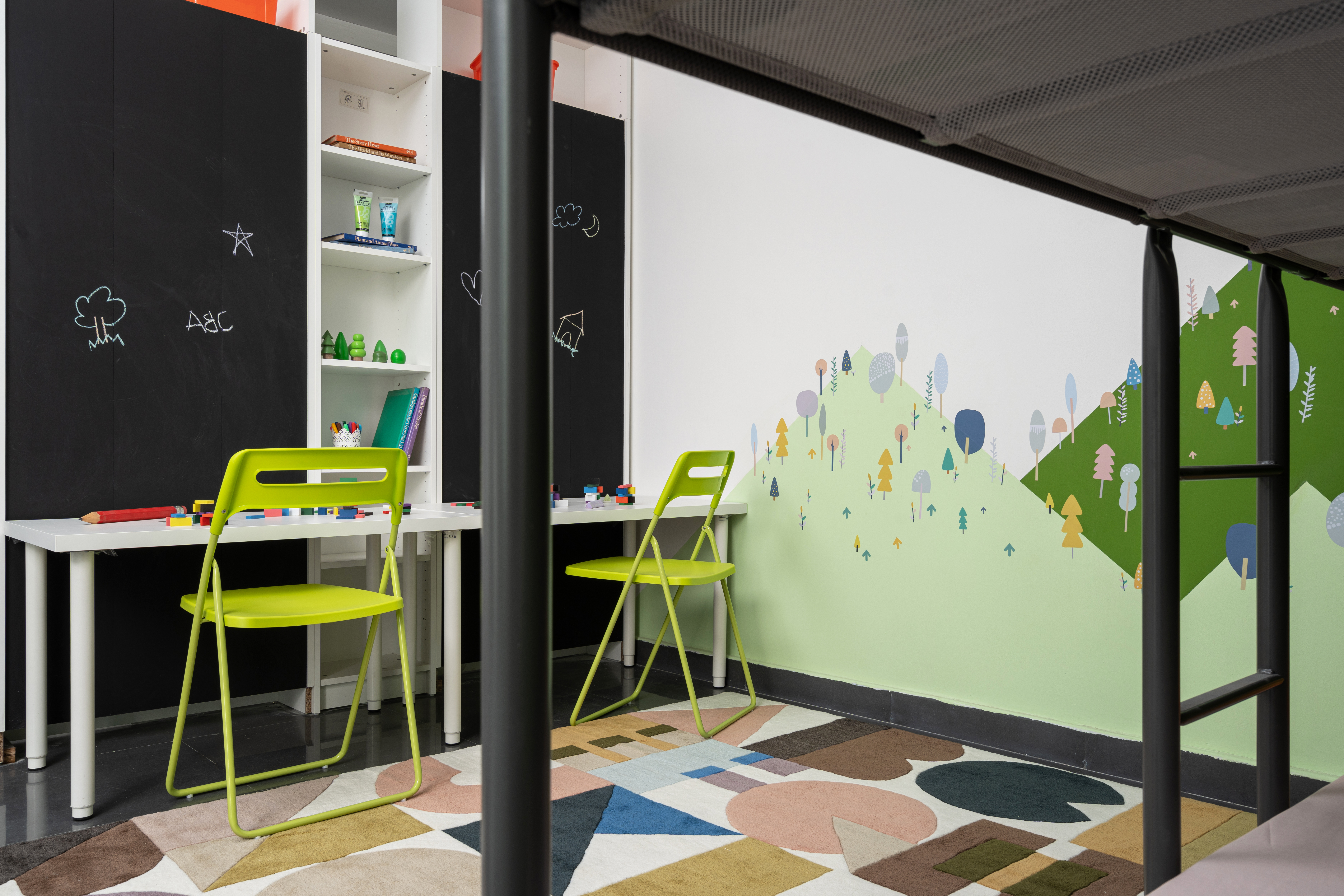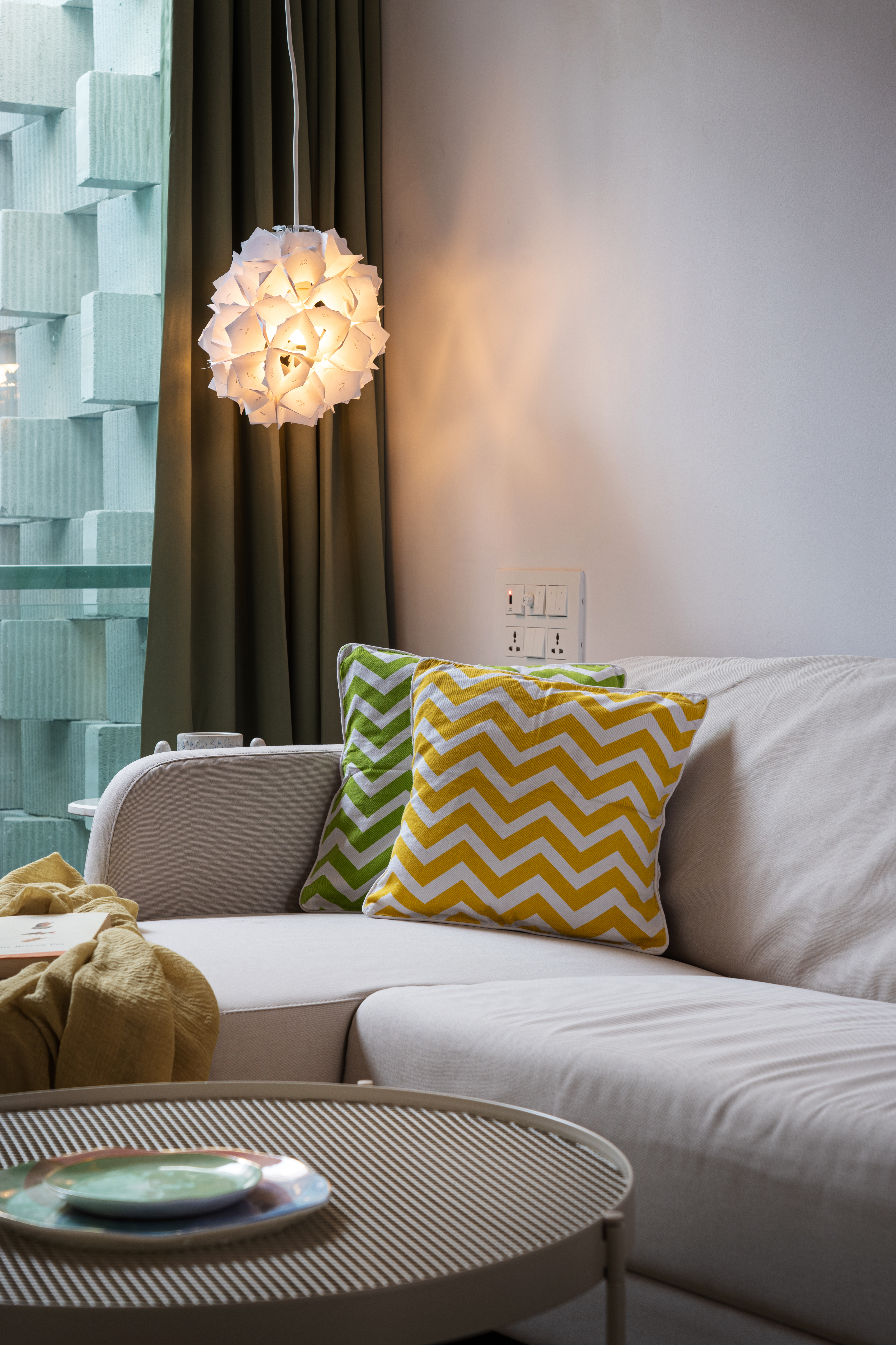 Due to limited area, many space-saving measures had to be adopted in this house, such as built-in wardrobes and convertible side tables in the front bedrooms. The architectural color palette was intentionally restrained, white dominant to create a sense of spaciousness. In the interiors, pops of bright colors create warm and cool themes from the two units, and a mural depicting mountains was custom-designed for the children’s bedroom. The master bedroom and the children’s bedroom are on alternate levels, and have adjoining verandahs connected to the courtyard. There are multiple possible combinations for function and privacy. Fluted glass doors can be locked to enclose these verandahs within the rooms, or remain open. The frameless glass sliding doors open up to reveal the corner of the verandah to enjoyed fresh air from inside the room.