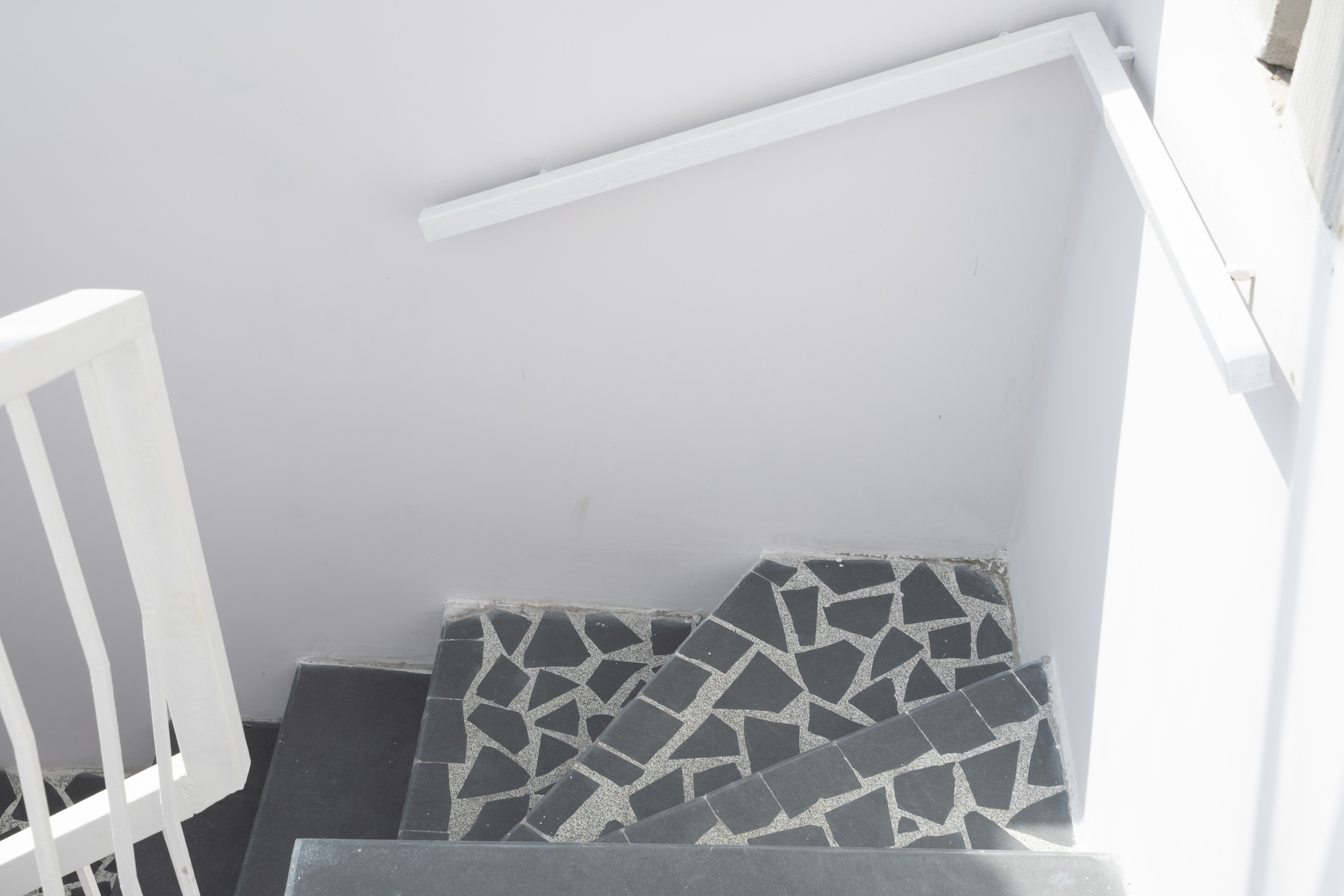 We have been concerned with the use of local materials, material economy and reduction of wastage. Locally-sourced Tandur blue slate has been used for the flooring, and in-situ mosaic flooring was created using stone wastage from the site to demarcate semi-open spaces (balconies and verandahs) within the broken plan. As space was constrained, the staircase is narrow with four winders, which could not be floored with a single tile due to their odd shape. These winders have also been paved in mosaic flooring and stand out from the rest of the staircase. Wastage from toilet countertops has been converted to customized side tables and benches. The garage at the entrance has been paved with rough, unfinished Tandur stone in crazy paving, to mimic the mosaic flooring of the semi-open areas. Though it is a very small site, the hilly topography of the area posed a challenge. The parking floor is a ramp in itself, designed as a doubly-curved surface in order to reconcile the difference in slope between the steep lane and the site, and the lack of length available for an external ramp. The broken stone helps pave this surface evenly. A customized folding gate was designed to continue the ribbons in the façade and in response to the slope of the lane and site.