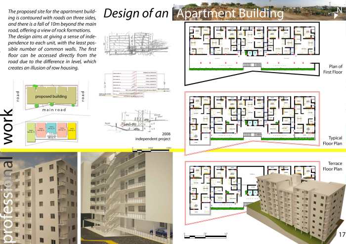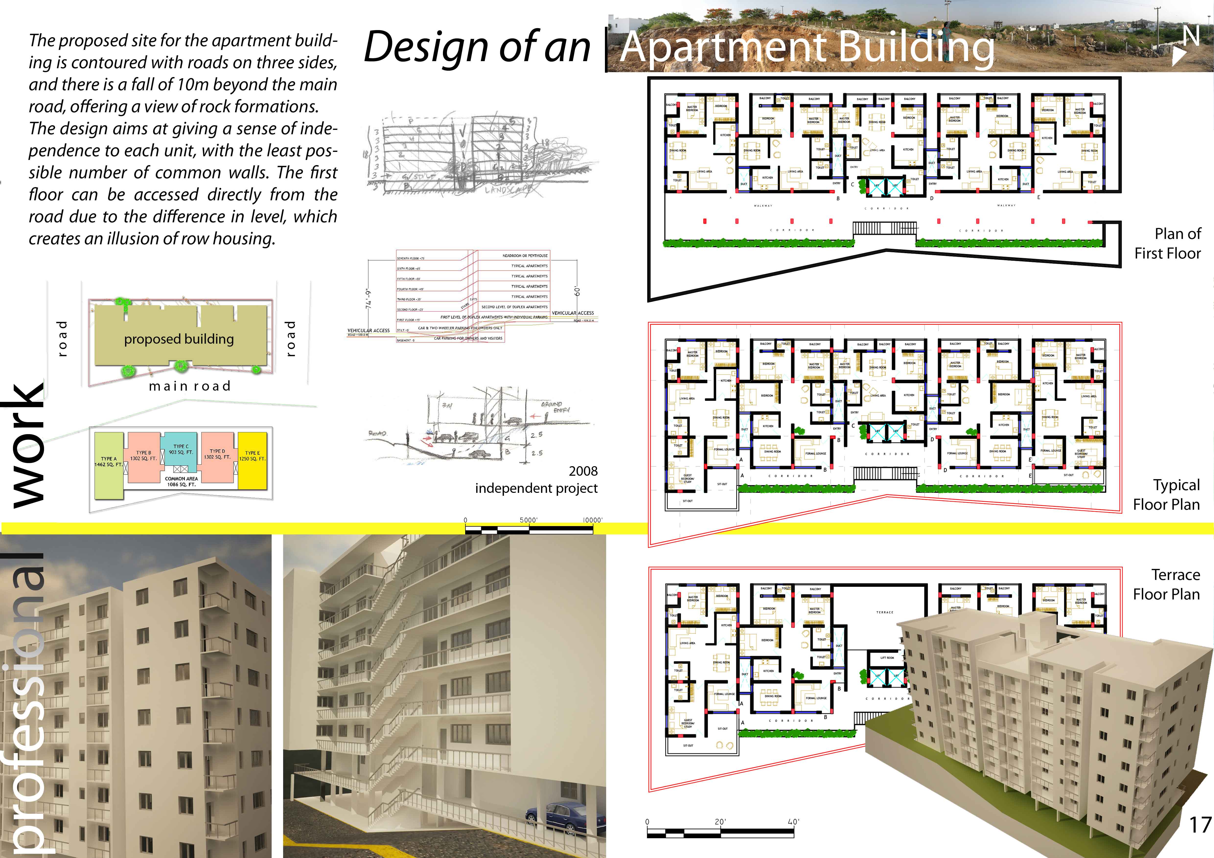Located on an undulating site with views of the Golconda Fort and the Qutb Shahi Tombs, this apartment complex was proposed with direct access from two different abutting roads to the ground floor stilt parking, as well as the first floor. While the other four floors were typical in plan, the first floor was designed as a block of row houses with a connection to the side road and parking space in front of each house.