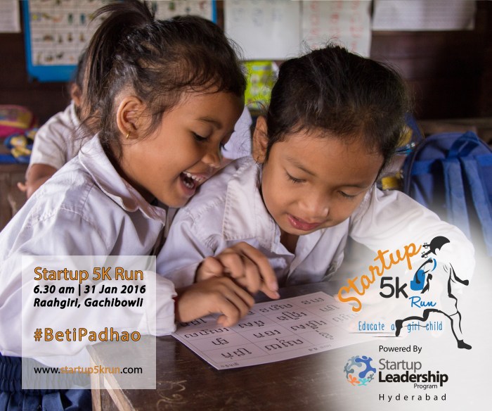 Social media posters designed for the Startup 5K Run organized by the Startup Leadership Program Hyderabad, held at Raahgiri on 31 January, 2016. All proceeds from the Run were donated to various non-profit foundations promoting the education of girls from disadvantaged backgrounds.