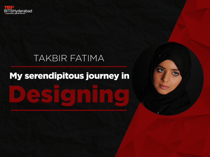 DesignAware Director Takbir Fatima was invited to give a TEDx talk at BITS Pilani Hyderabad. She spoke about the danger of what she calls the Single-solution Syndrome, and how multiple approaches to the design process allow designers to question, learn, evolve, connect and unearth during the design journey. Using examples of her work at DesignAware, Takbir took the audience us through the creative journey, the unique challenges of the design process and how she connected the dots to arrive at various unexpected solutions.