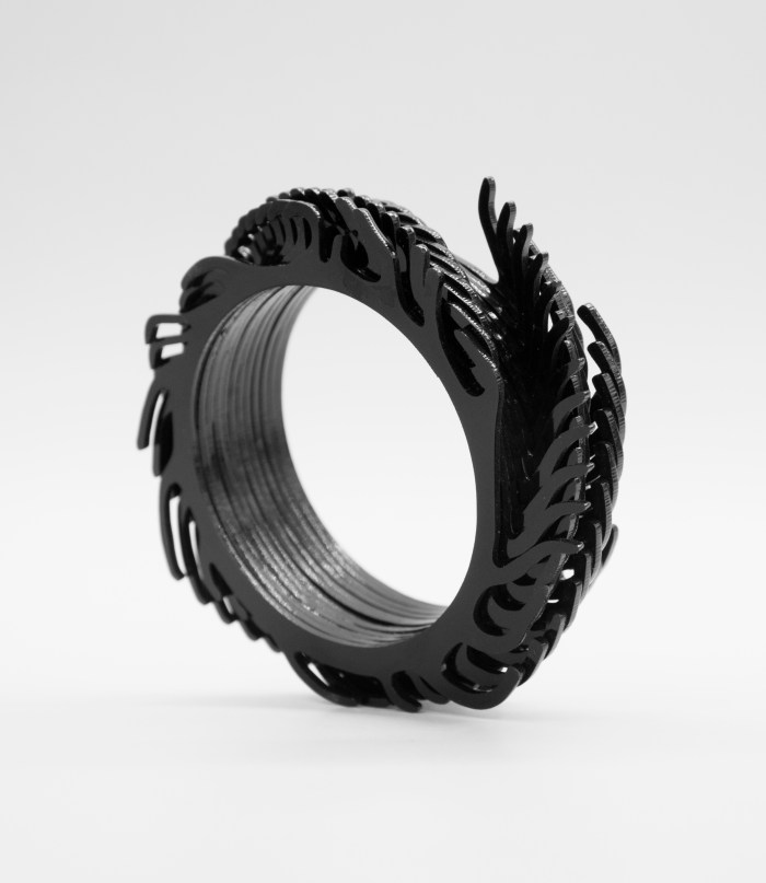 The Tangle Bangle is organic in form, and its curvaceous layers are reminiscent of the body structures of nautical creatures, perhaps the tentacles of an octopus. The structure appears random, but is actually the same pattern repeated over layers, but with slight rotation of angle with each layer.