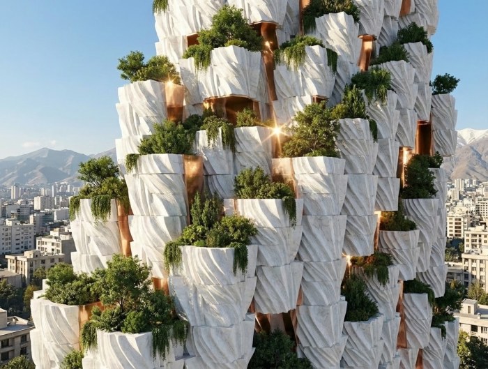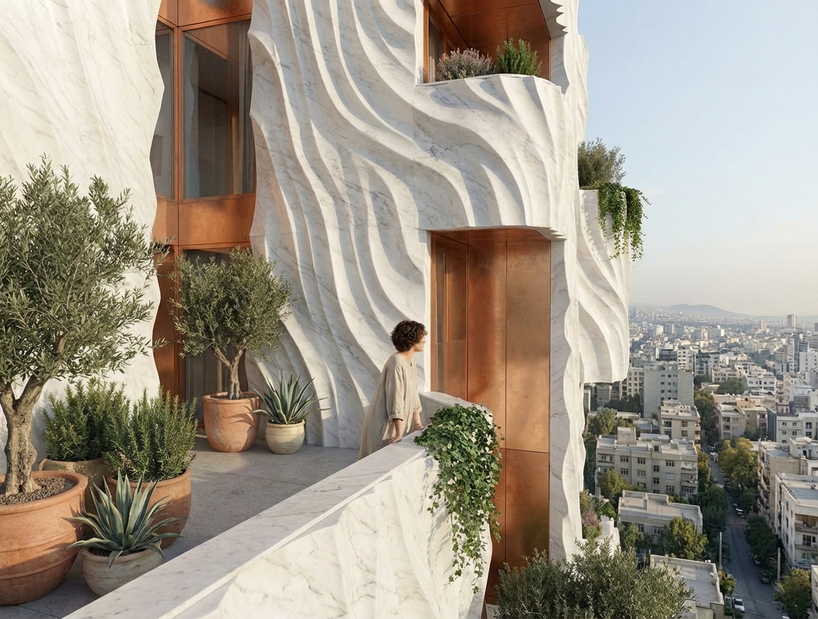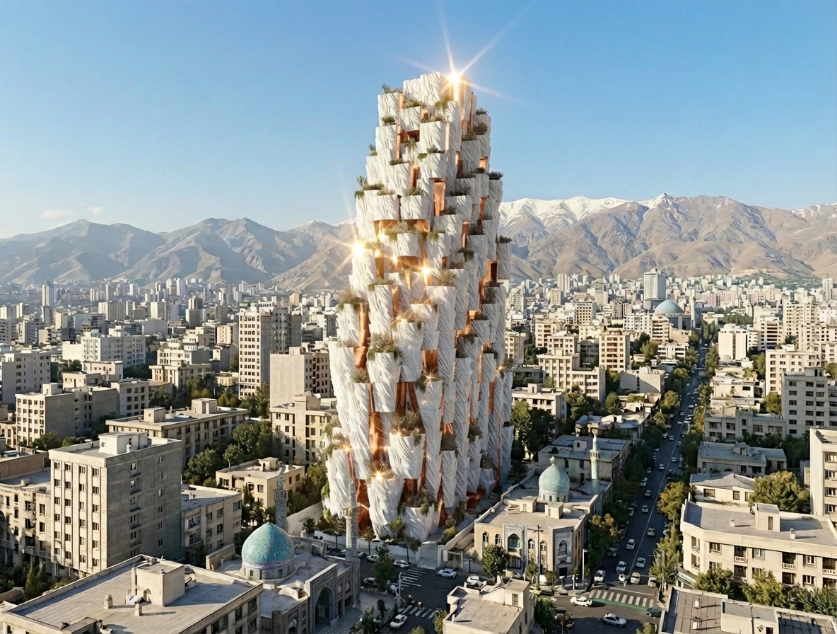 Warm copper accents are woven into the façade and balcony recesses, catching the light and aging gracefully over time, adding a quiet sense of understated luxury. Planted balconies soften the tower’s mass, introducing nature vertically into the city and mediating Tehran’s climate through shade, greenery, and depth. The result is a residential tower that balances solidity and softness: rooted in material tradition, yet distinctly contemporary—an inhabitable landscape carved in stone.