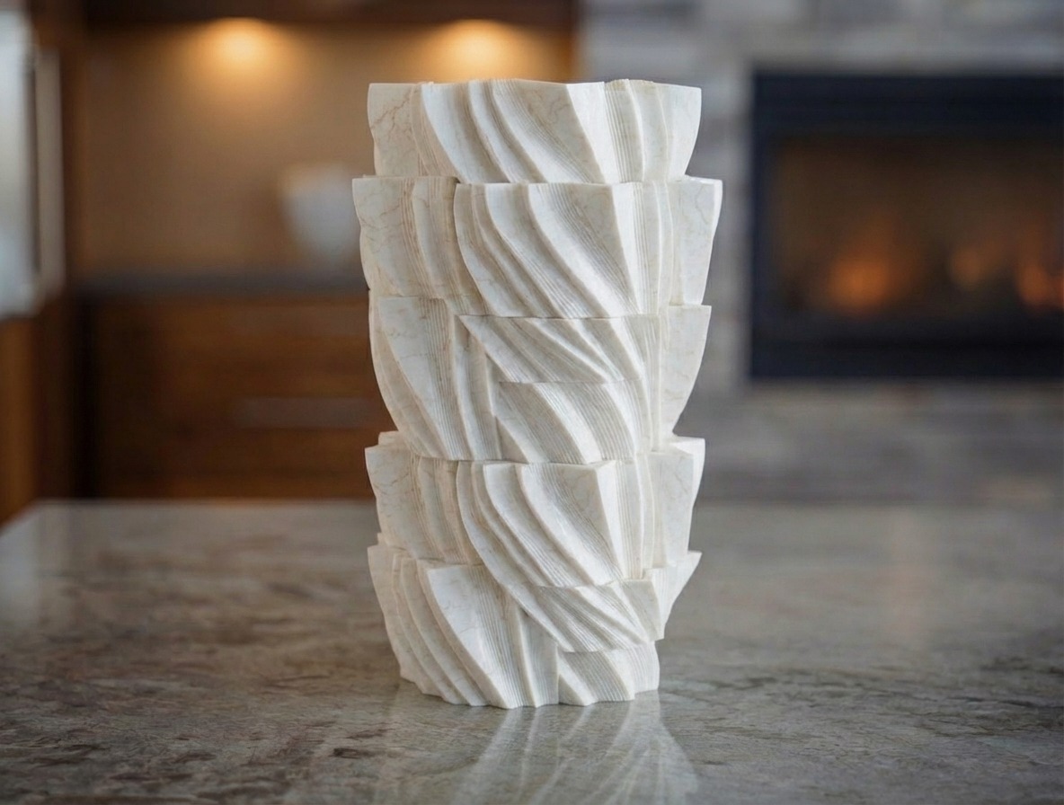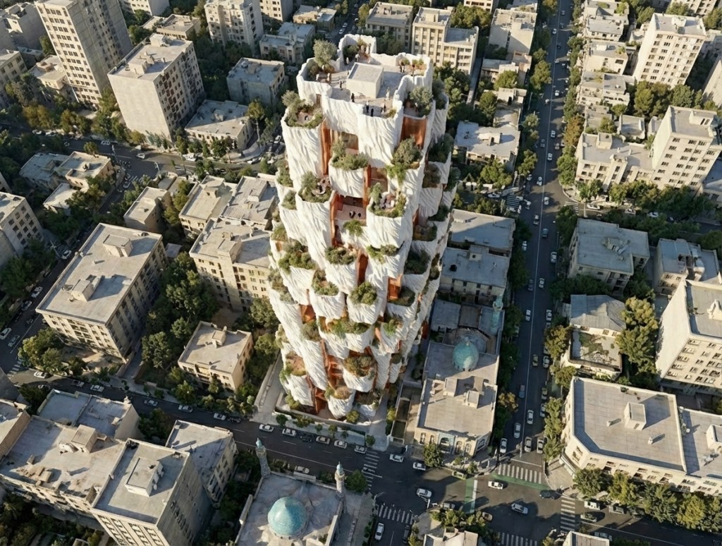 Rising from the dense urban fabric of Tehran, this residential tower is carved in travertine in a contemporary reinterpretation of Iranian ornamentation. The building’s form is inspired by stacked ceramic vases, a quiet homage to the country’s long tradition of handicraft and material culture. Each layer is subtly staggered and recessed, creating a rhythmic, sculpted façade where carving becomes structure, shading, and identity.