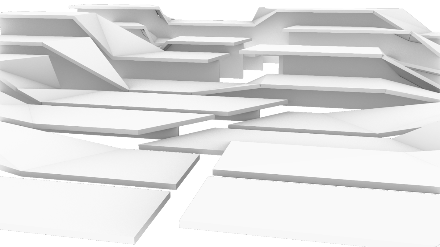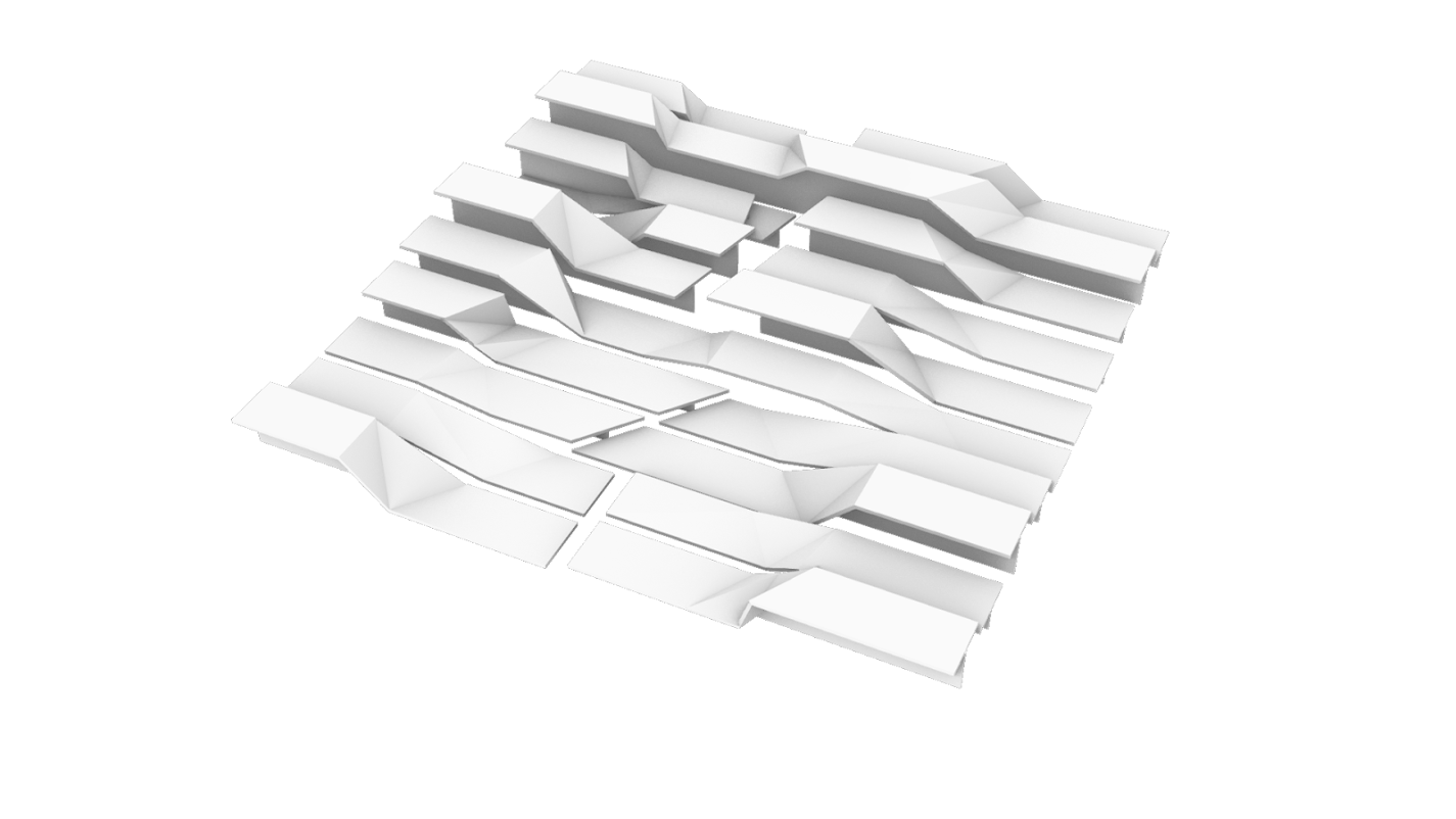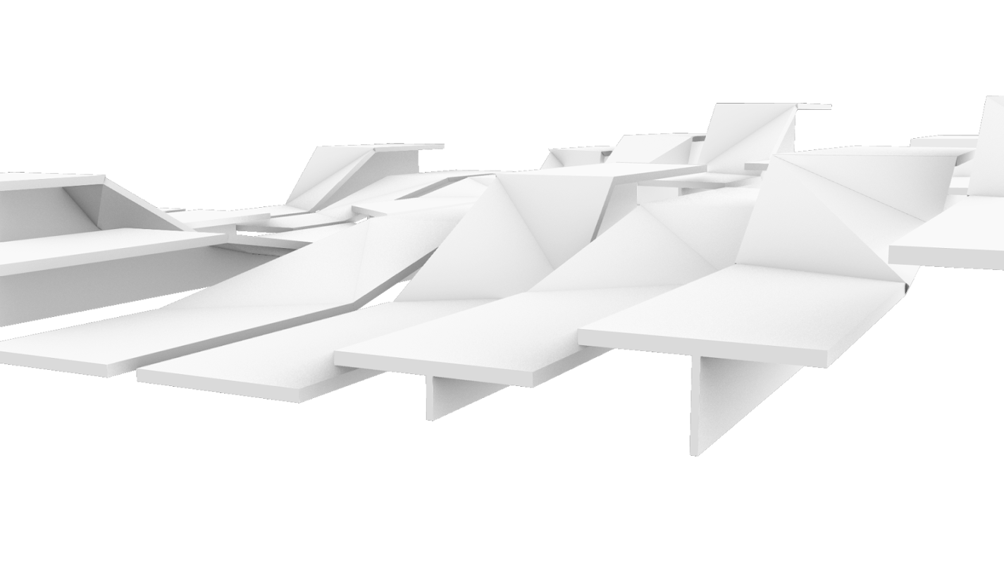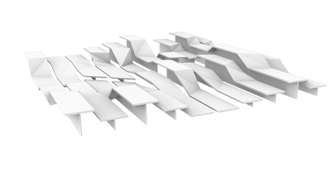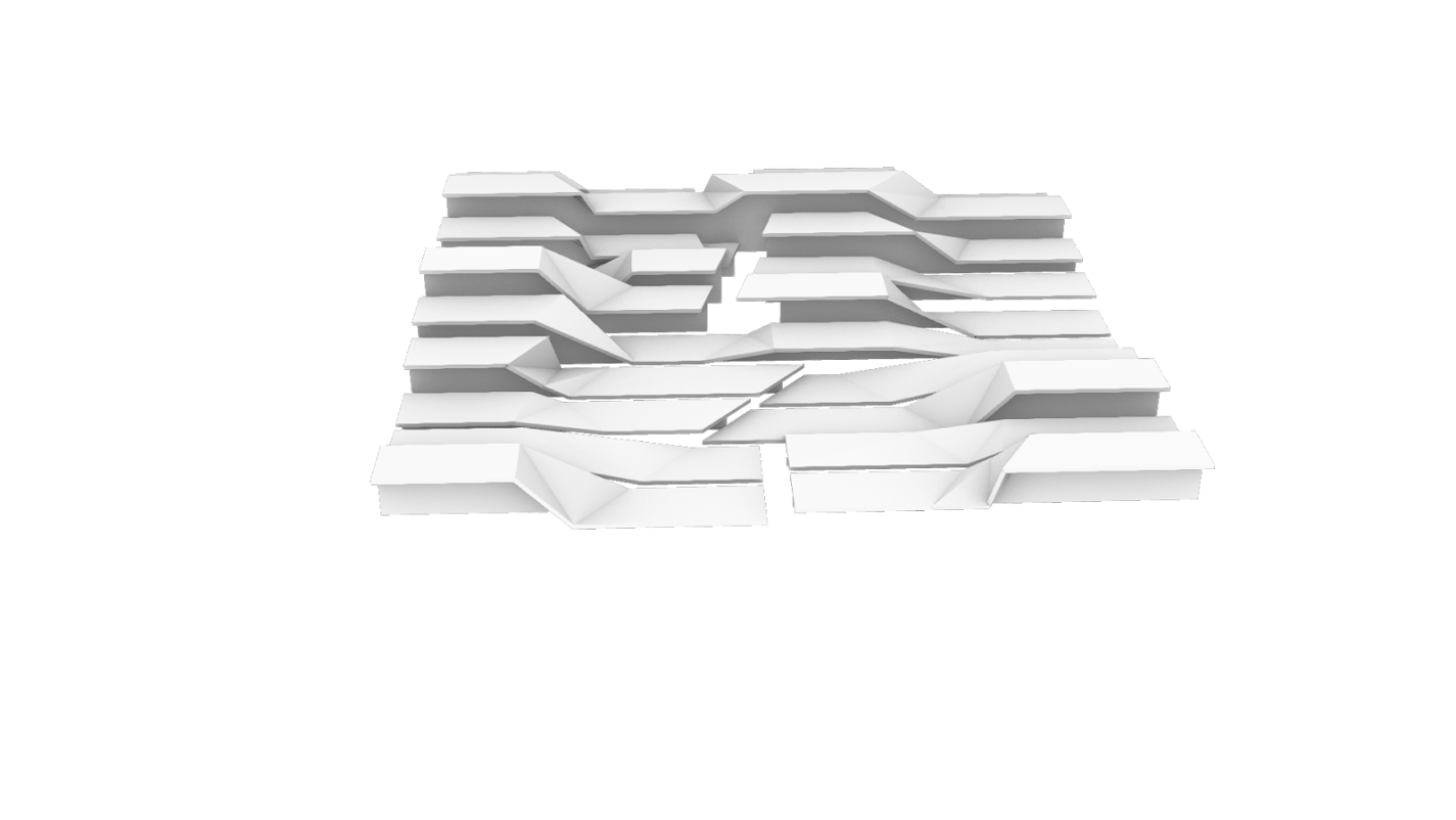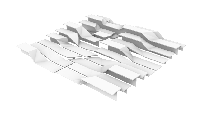 Arrived at through a series of topological explorations with strips of paper, the surfaces morph and transform from one height setting to an- other, broken and connected at once. When unoccupied by humans, Unfolding becomes an undulating, fractured, sculptural landscape.