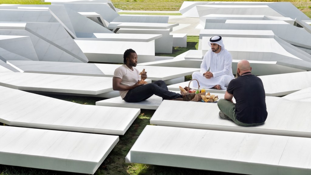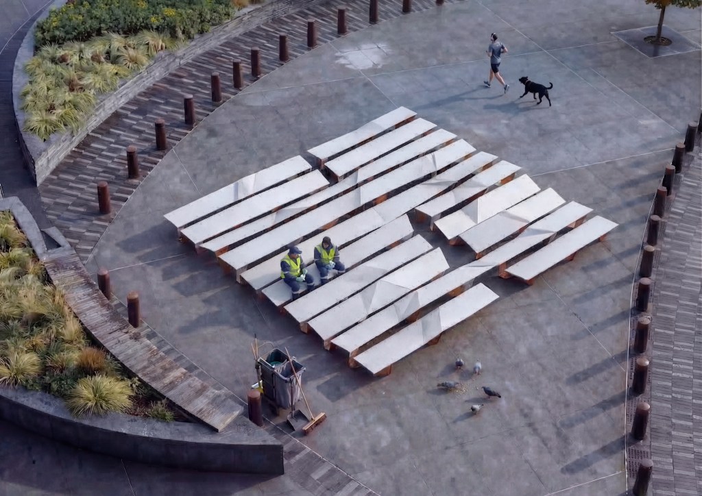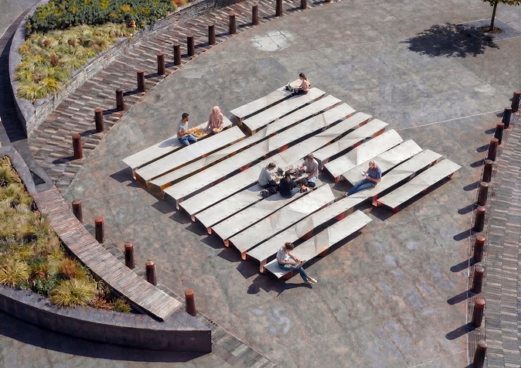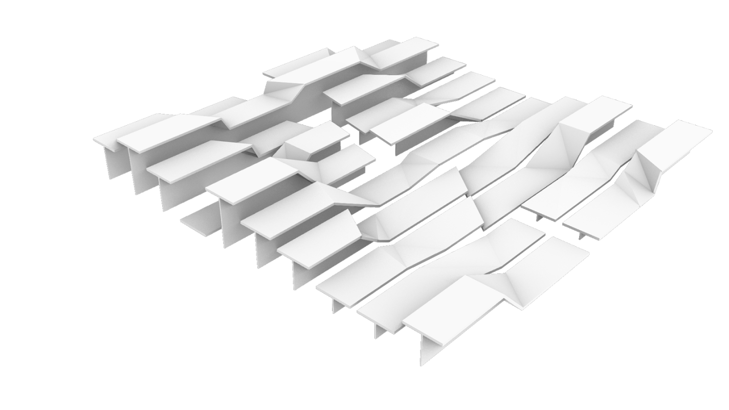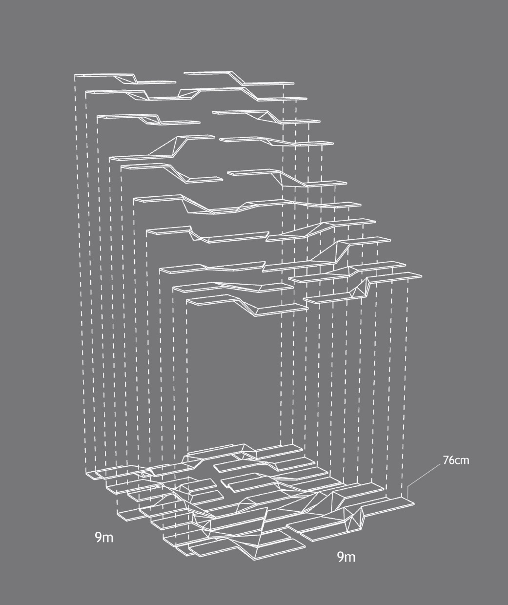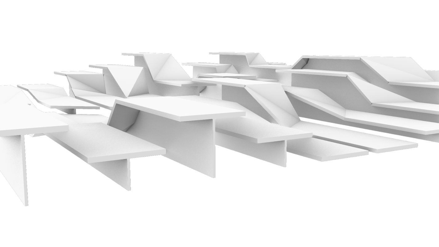Arrived at through a series of topological explorations with strips of paper, the surfaces morph and transform from one height setting to an- other, broken and connected at once. When unoccupied by humans, Unfolding becomes an undulating, fractured, sculptural landscape.
