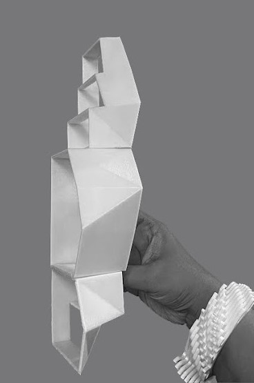 Unfolding is a continuous surface that bends, turns, creases, folds, un- folds, and takes diverse forms that turn into tables and seats of varying heights inspired by various traditions. There is the standing counter, that is commonly seen in tiffin centers in South India, where idli-vada are served and eaten quickly and on-the-go. The counter can also serve karak chai during a break in a busy work day. The roadside café table is for sitting down at and enjoying a snack while seeing the world pass by, inspired by outdoor European cafés. The chowki is a traditional subcon- tinental low table that serves meals to people seated on the floor cross-legged, and can also serve tea and samosas or pide during the evening, often with a Persian sofreh or dasterkhwan draped over it. The chabudai is a traditional Japanese low table, paired with a tatami mat for the tea ceremony, with space, time and care dedicated to it. Finally, the majlis, by definition is a gathering place with qahwah and finger foods as an excuse to meet friends and have conversations, white sitting or reclining on cushions.