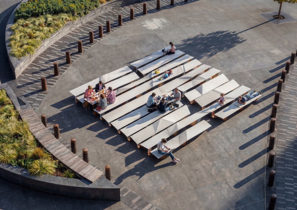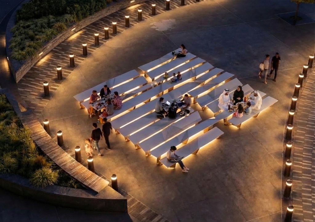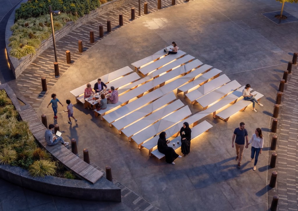 Unfolding welcomes all manners of gathering, eating, drinking, work- ing, discussing, sitting alone or together, standing or reclining, each with its cultural significance. It encourages the unraveling of stories and spreading of ideas. The urban intervention is like the open-air agora, with the focus on the table surface, which can be used as a table or a seat at different heights, as one feels comfortable. Cushions, table runners, mats, and other accessories added to different levels of the surface make it more personalized. There is no right or wrong way to be Unfolding.