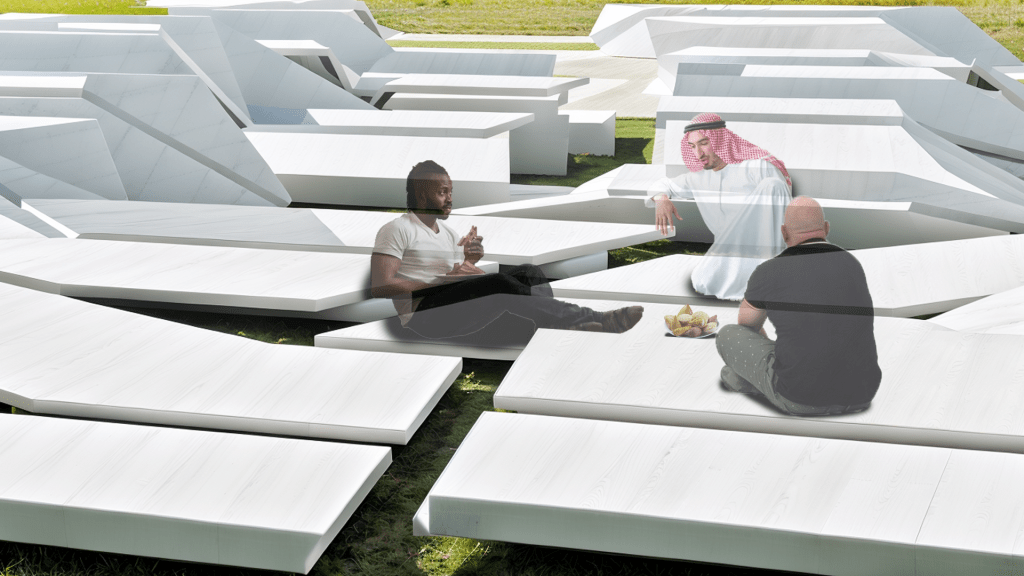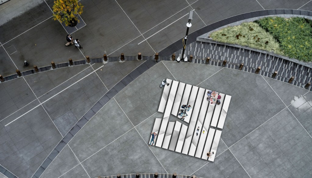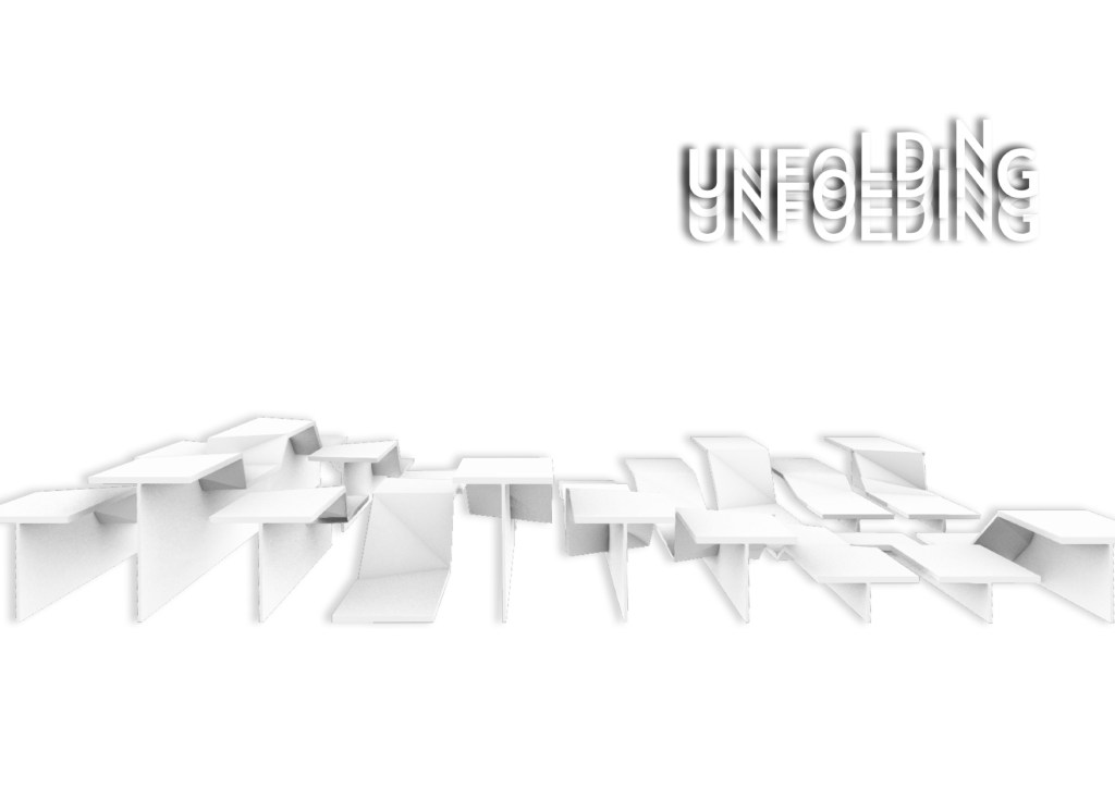 Arrived at through a series of topological explorations with strips of paper, the surfaces morph and transform from one height setting to an- other, broken and connected at once. When unoccupied by humans, Unfolding becomes an undulating, fractured, sculptural landscape.