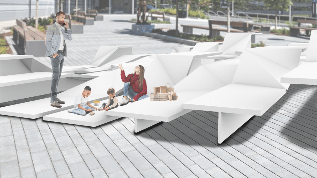 Unfolding welcomes all manners of gathering, eating, drinking, work- ing, discussing, sitting alone or together, standing or reclining, each with its cultural significance. It encourages the unraveling of stories and spreading of ideas. The urban intervention is like the open-air agora, with the focus on the table surface, which can be used as a table or a seat at different heights, as one feels comfortable. Cushions, table runners, mats, and other accessories added to different levels of the surface make it more personalized. There is no right or wrong way to be Unfolding.
