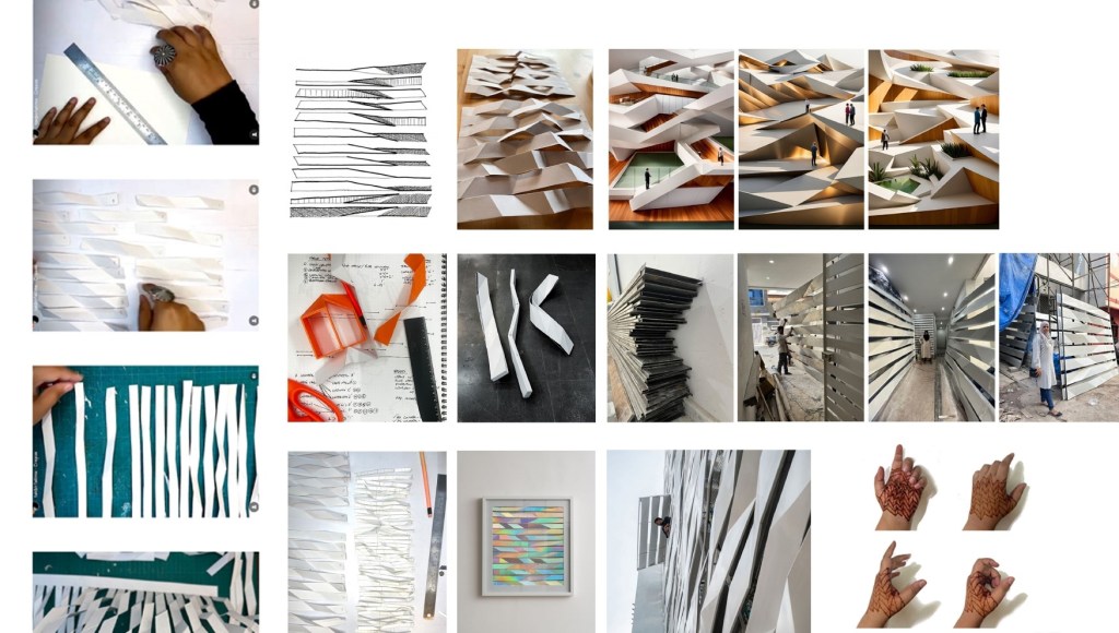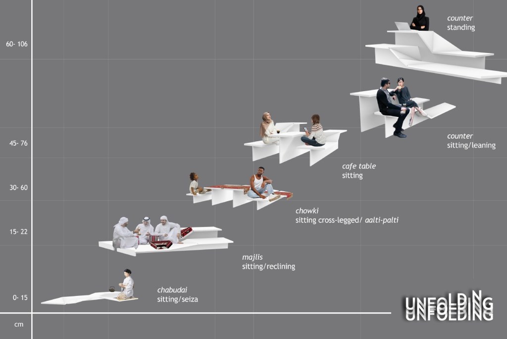 Unfolding is a continuous surface that bends, turns, creases, folds, un- folds, and takes diverse forms that turn into tables and seats of varying heights inspired by various traditions. There is the standing counter, that is commonly seen in tiffin centers in South India, where idli-vada are served and eaten quickly and on-the-go. The counter can also serve karak chai during a break in a busy work day. The roadside café table is for sitting down at and enjoying a snack while seeing the world pass by, inspired by outdoor European cafés. The chowki is a traditional subcon- tinental low table that serves meals to people seated on the floor cross-legged, and can also serve tea and samosas or pide during the evening, often with a Persian sofreh or dasterkhwan draped over it. The chabudai is a traditional Japanese low table, paired with a tatami mat for the tea ceremony, with space, time and care dedicated to it. Finally, the majlis, by definition is a gathering place with qahwah and finger foods as an excuse to meet friends and have conversations, white sitting or reclining on cushions.