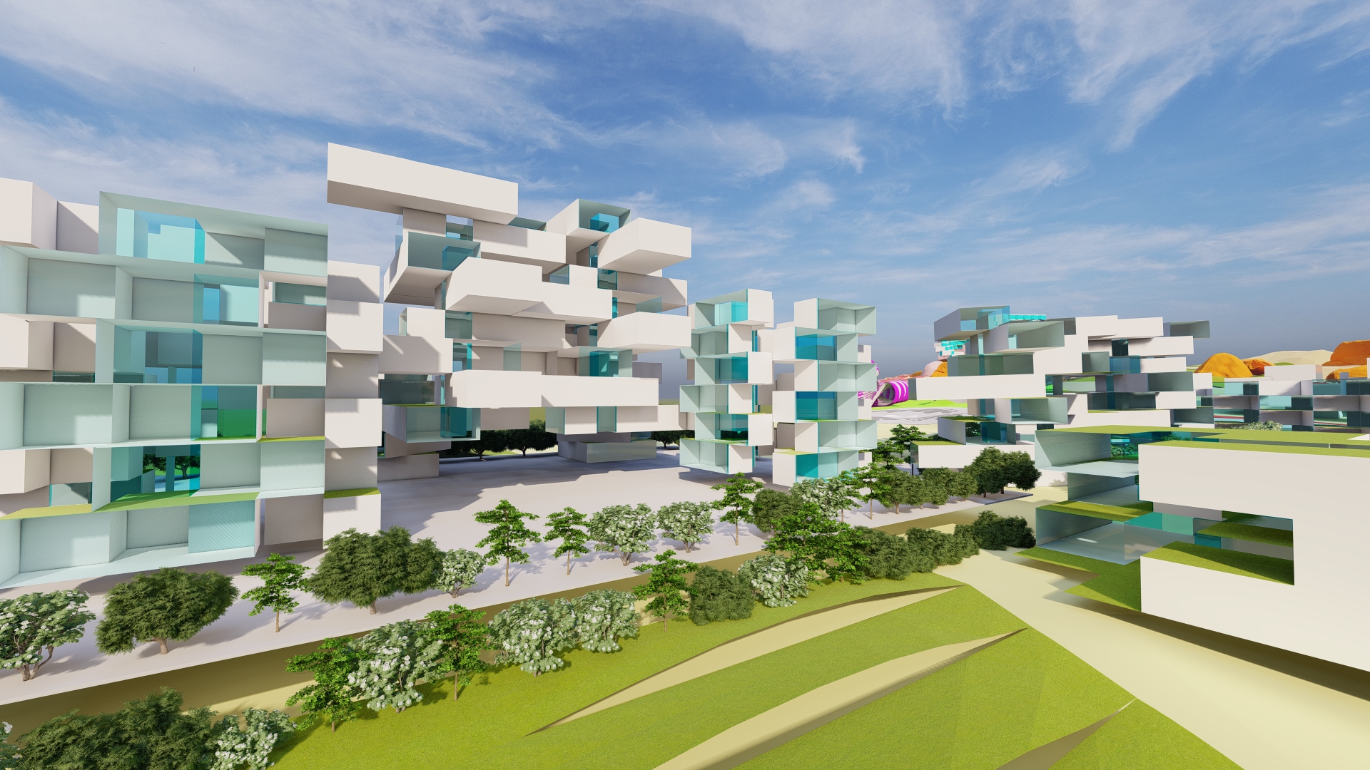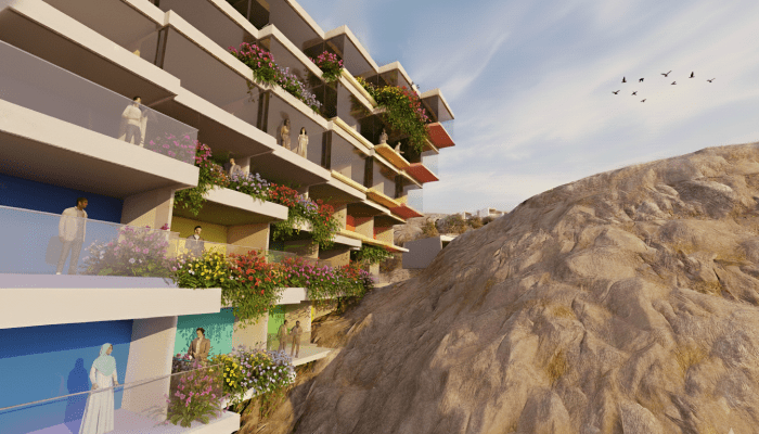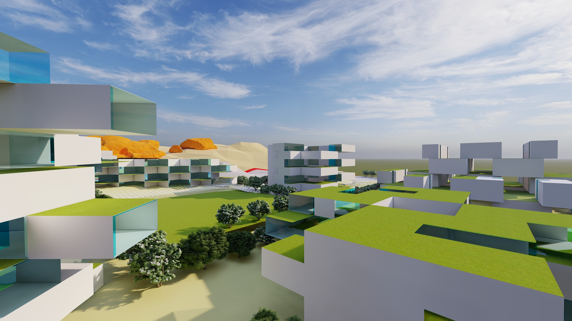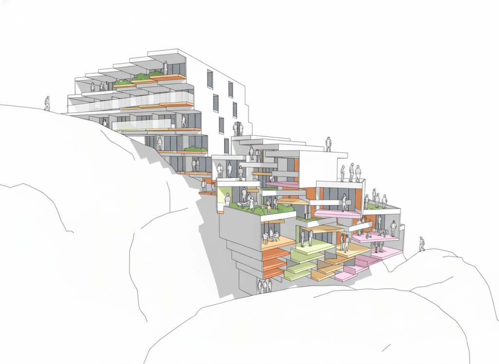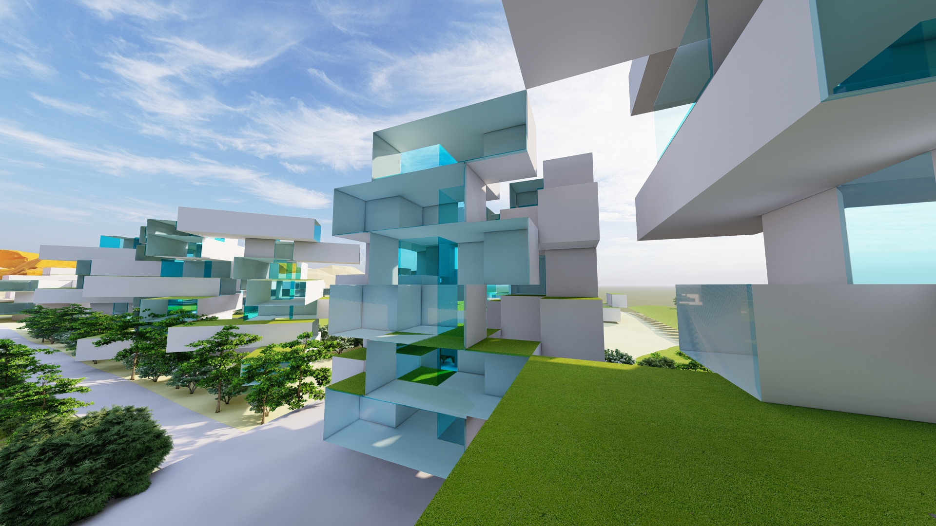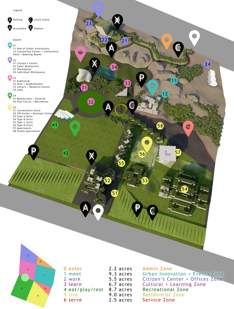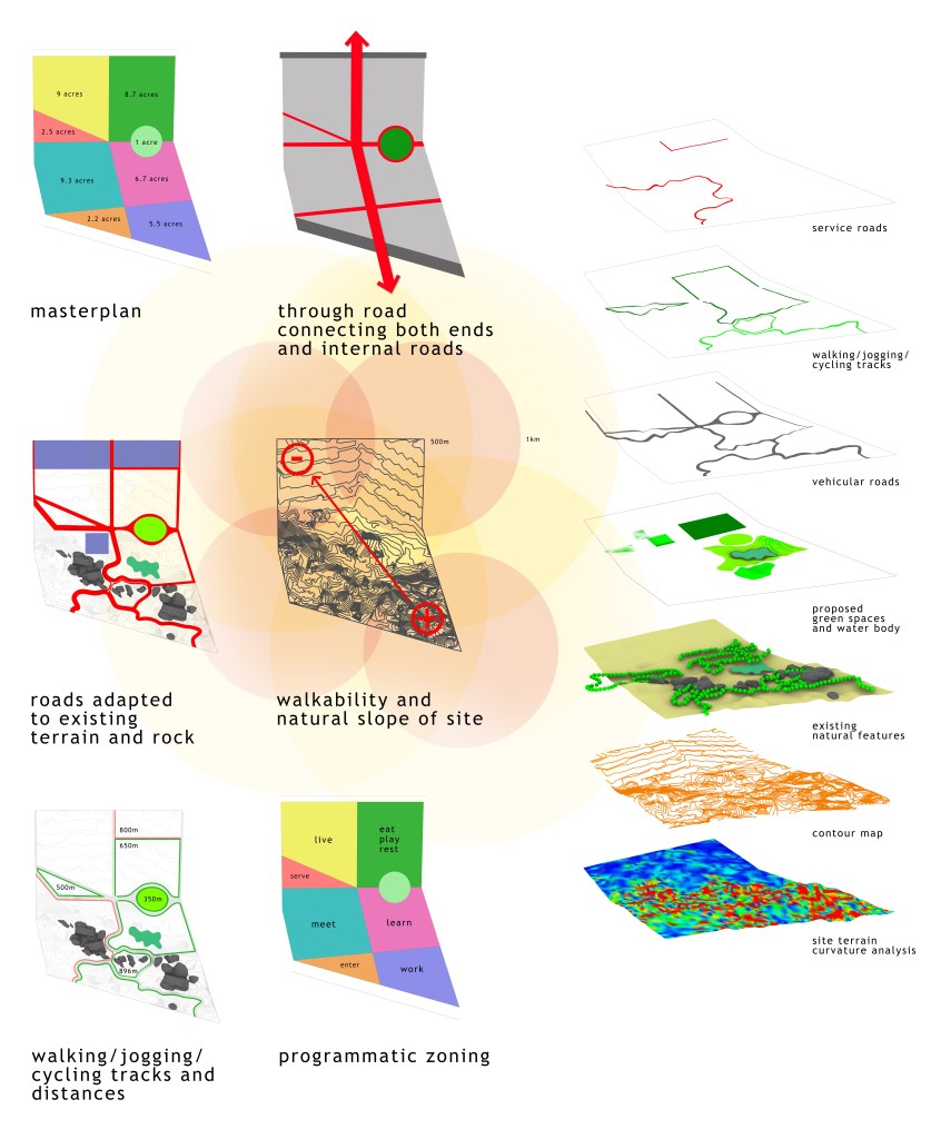 The design responds to the terrain in many ways: in structuring the built form along its levels, as well as in staggering the built form into levels to mimic the topography. In order to retain the natural contour, podiums are introduced at the lowest entry level of each complex. This creates a continuous, connected common space that becomes a common public zone, open to all, housing cafes and public amenities. The podium also ensures universal accessibility and ease of navigation. Upper levels are more exclusive and restricted to private zones for workers.