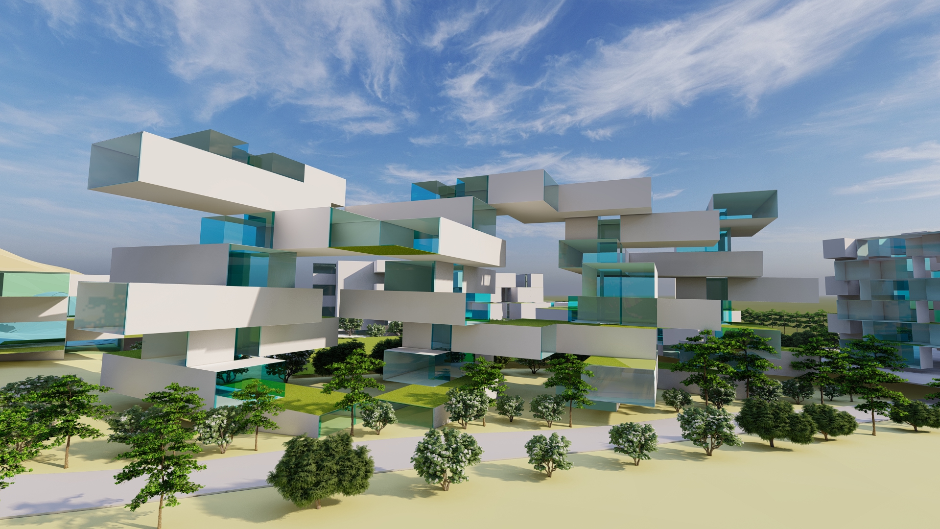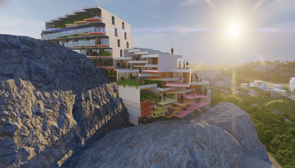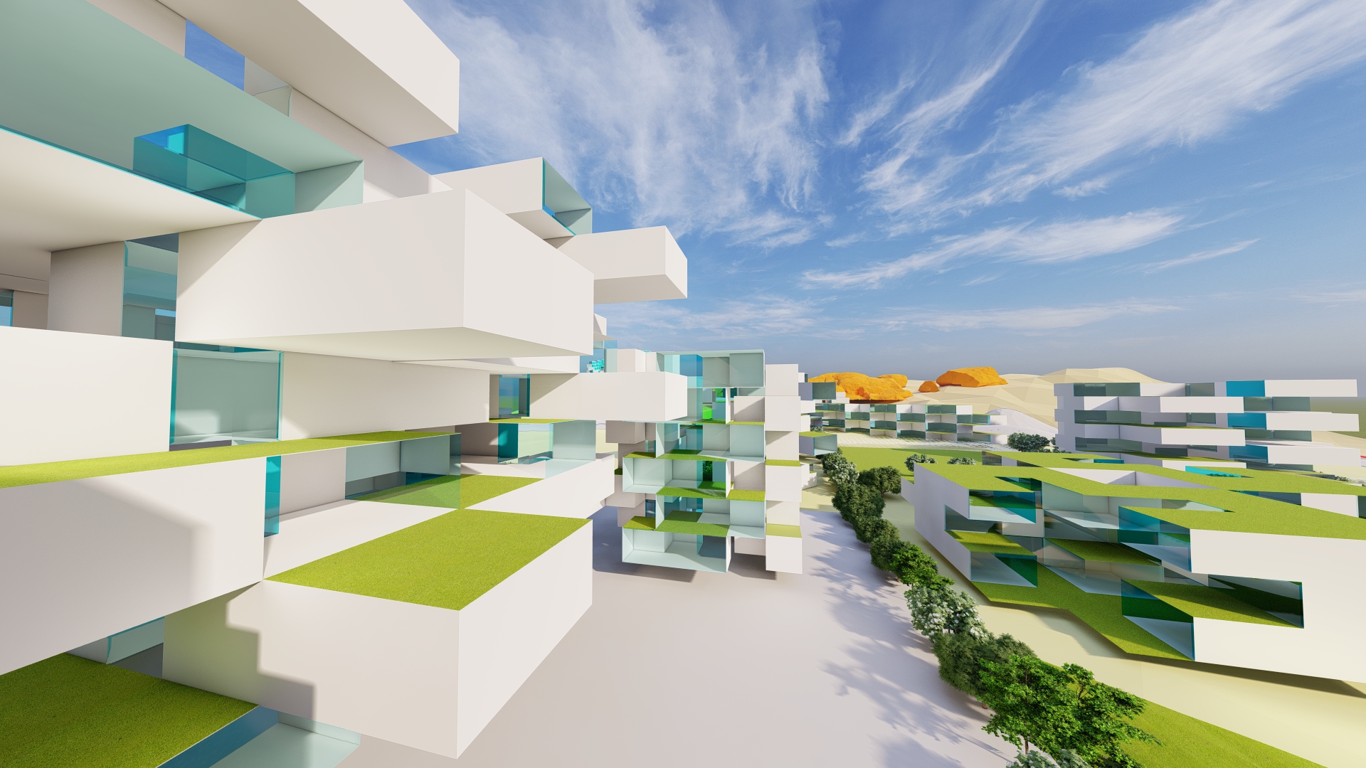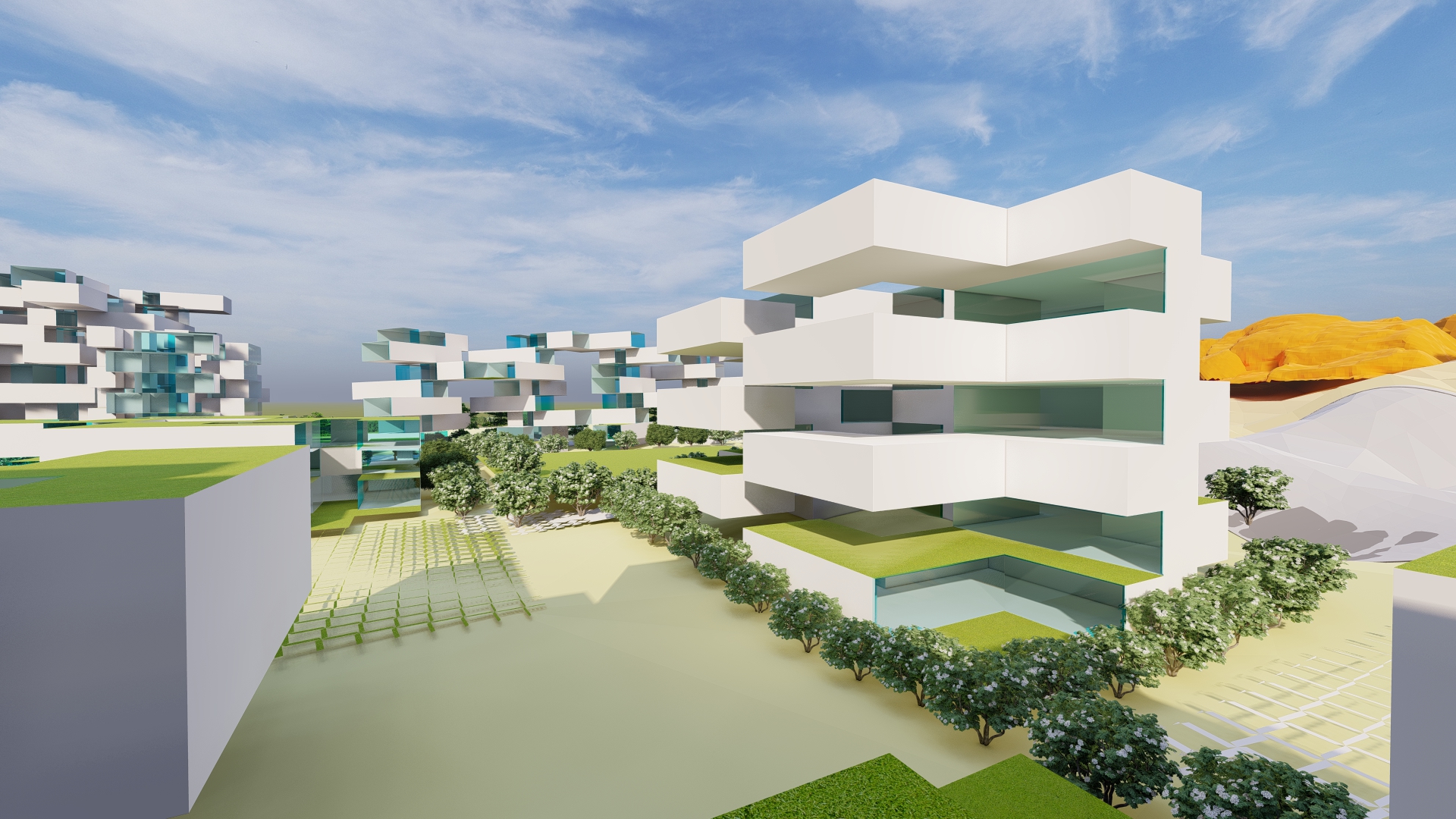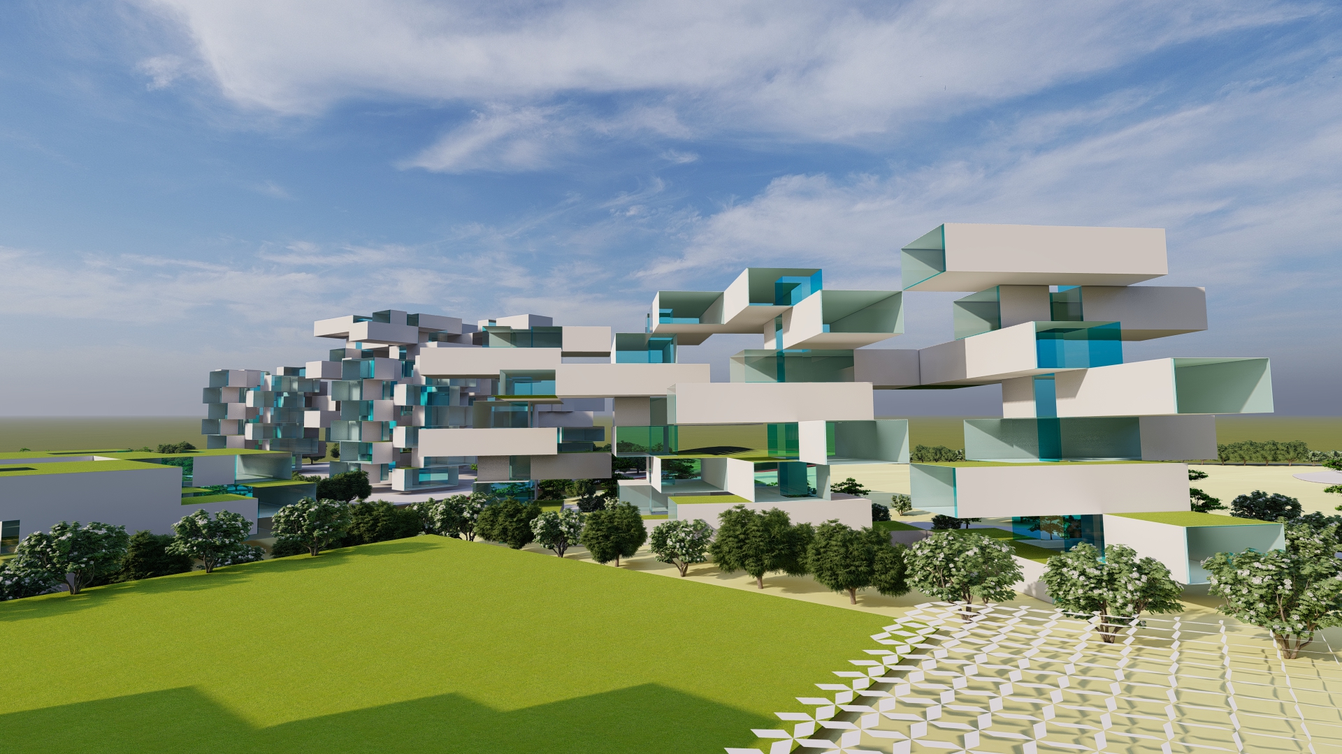 The design responds to the terrain in many ways: in structuring the built form along its levels, as well as in staggering the built form into levels to mimic the topography. In order to retain the natural contour, podiums are introduced at the lowest entry level of each complex. This creates a continuous, connected common space that becomes a common public zone, open to all, housing cafes and public amenities. The podium also ensures universal accessibility and ease of navigation. Upper levels are more exclusive and restricted to private zones for workers.