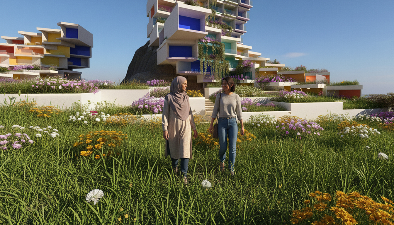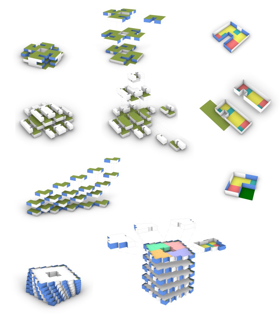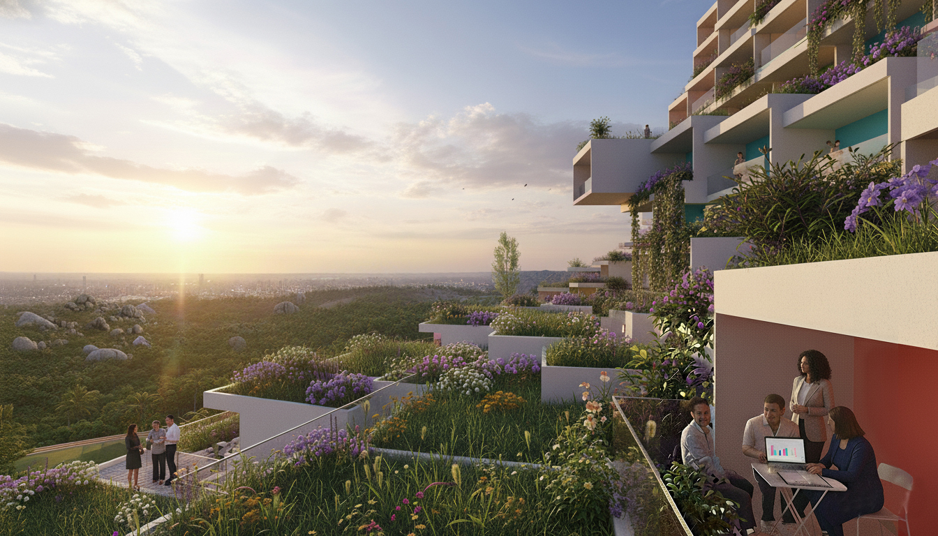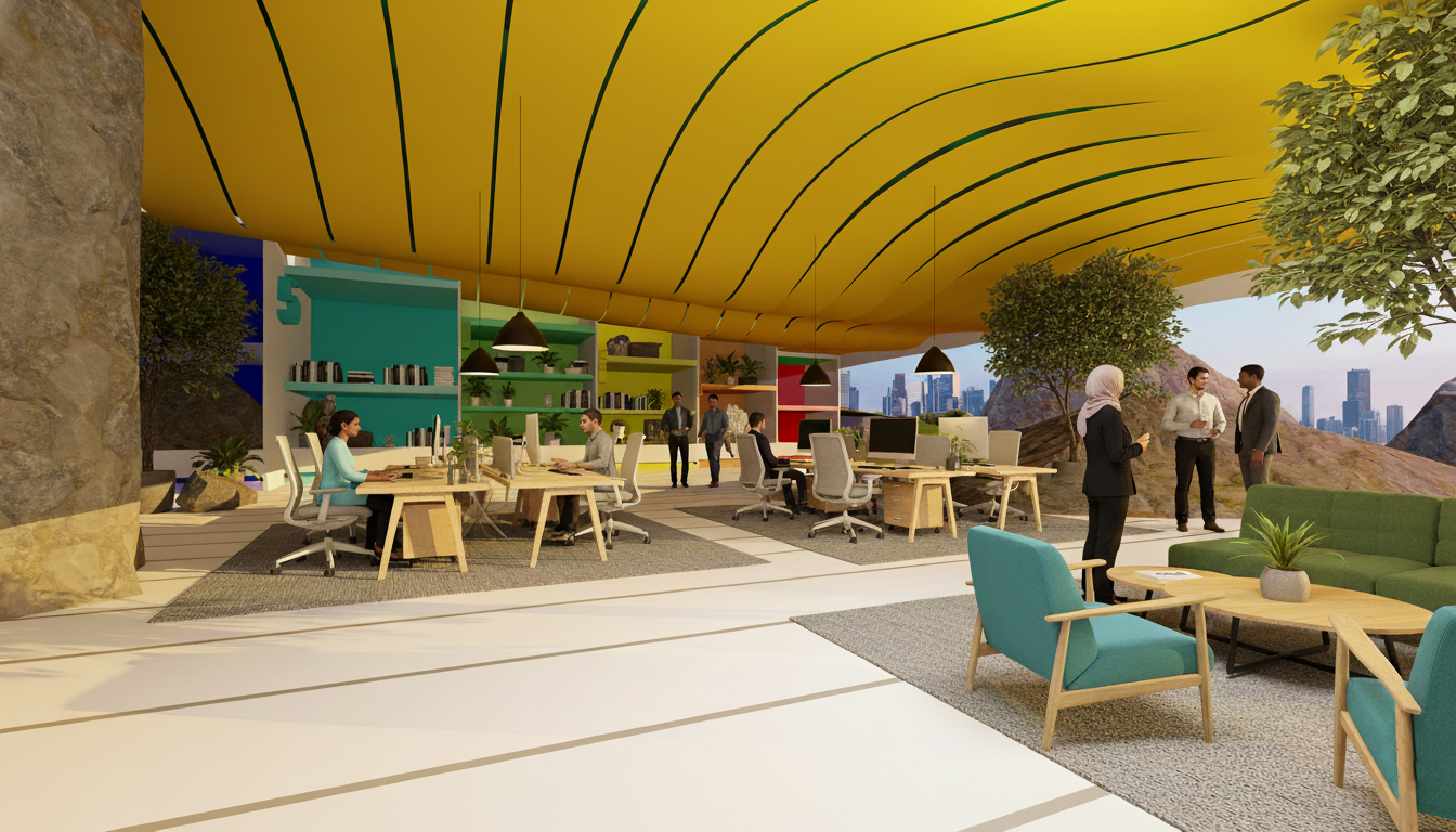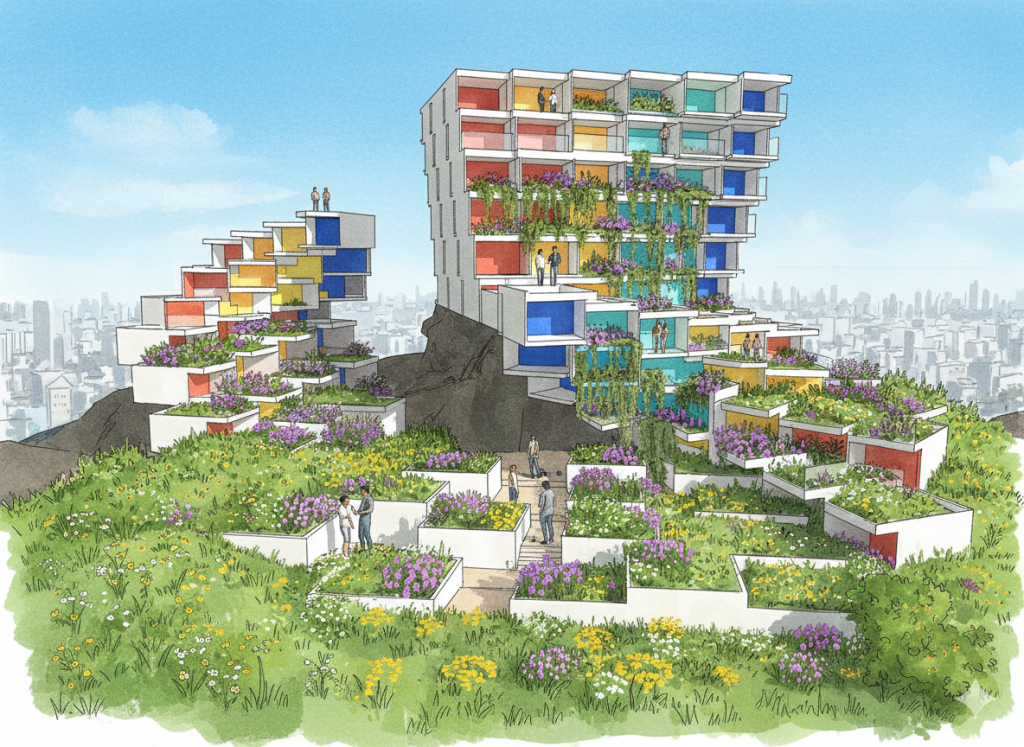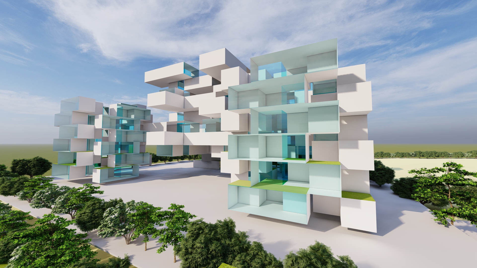 The design responds to the terrain in many ways: in structuring the built form along its levels, as well as in staggering the built form into levels to mimic the topography. In order to retain the natural contour, podiums are introduced at the lowest entry level of each complex. This creates a continuous, connected common space that becomes a common public zone, open to all, housing cafes and public amenities. The podium also ensures universal accessibility and ease of navigation. Upper levels are more exclusive and restricted to private zones for workers.