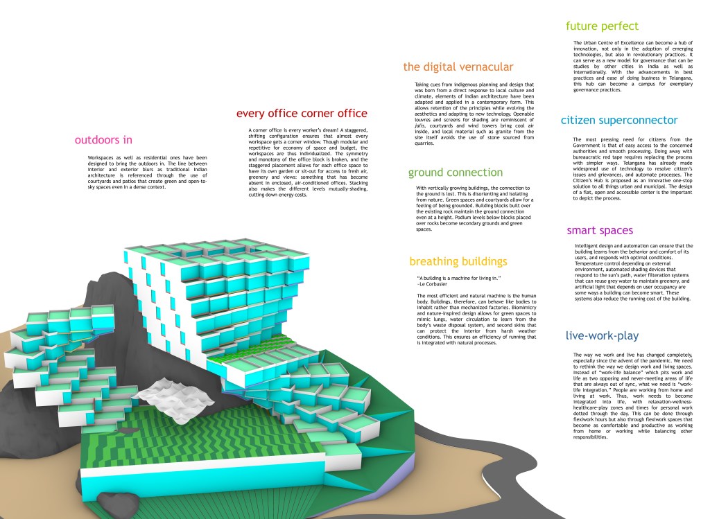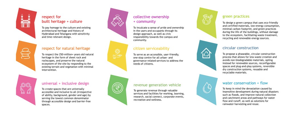 This project is a revolutionary move by the Government of Telangana to situate a world-class campus for the training of municipal officials of all levels, located in the heart of the city. The self-sufficient campus contains office complexes, convention centers, eateries, cultural and public spaces, recreation spaces, residences, and most importantly a Citizen’s Center where city residents can directly approach the government for assistance and to lodge grievances, making government more open and accessible, and bringing down barriers between public amenities and citizens.