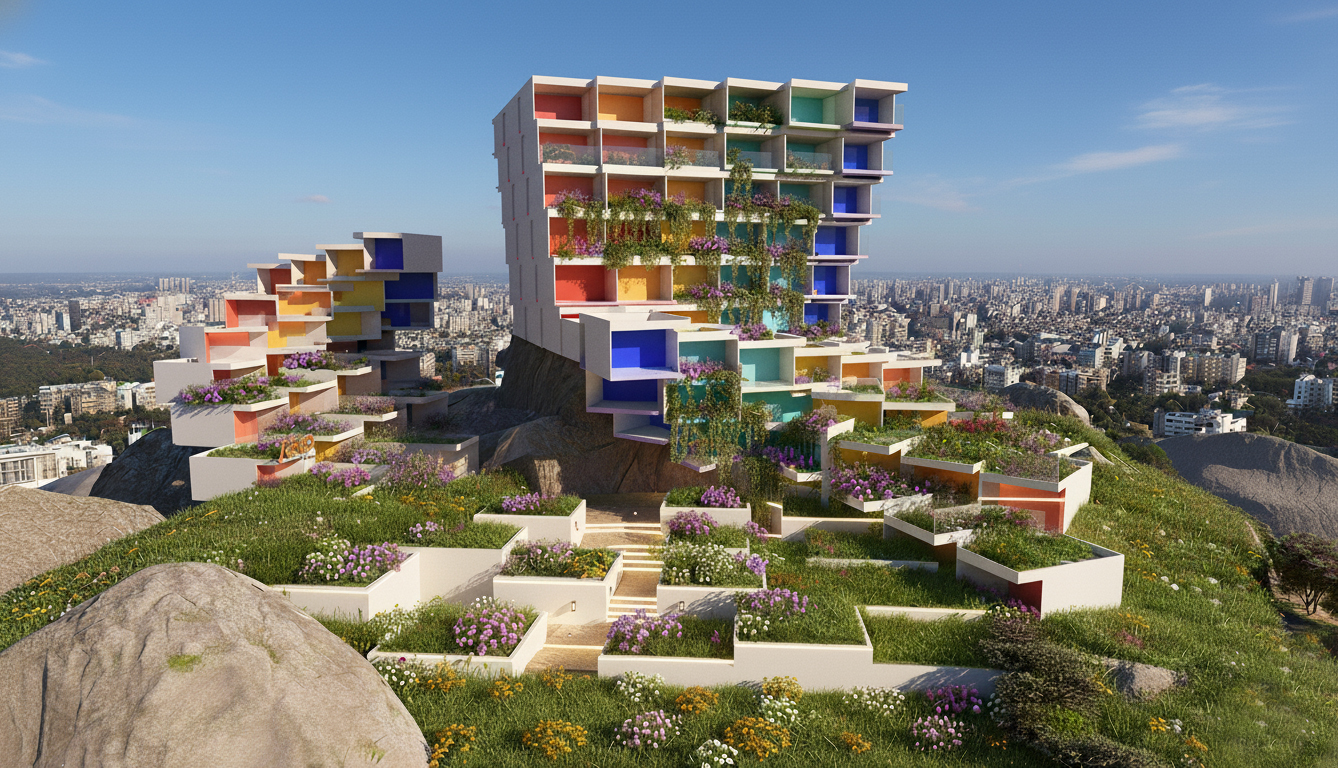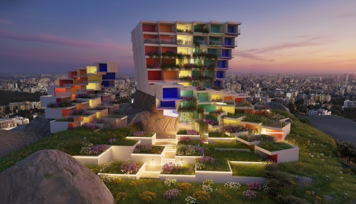 In Hyderabad, the terrain poses a major challenge, and unchecked, unplanned development has left the city’s densest centers prone to flooding due in part to alteration of natural slopes, along with encroachments in catchment areas. Instead of damaging or altering the terrain, it is important to build with it and not against it. Proximity to the Himayat Sagar reservoir makes this all the more relevant as a project to demonstrate designing with nature, terrain and ecology. The design is responsive: with an aim to demonstrate how large-scale development is possible without disrupting the existing ecosystem and topography, as well as biodiversity within the city. The city needs natural, sensitive, green spaces where humans and wildlife coexist in harmony, and this was one of the aims of the project.